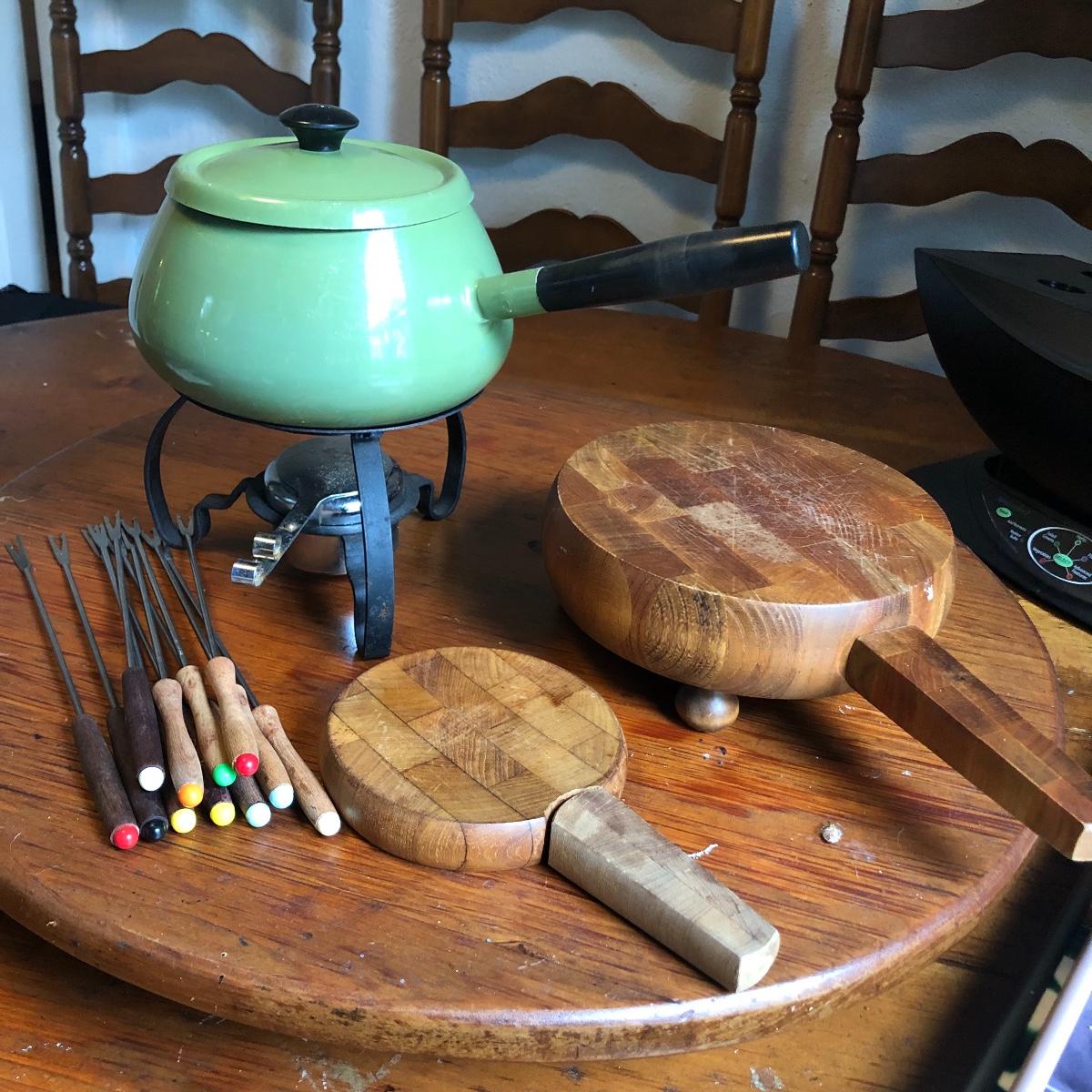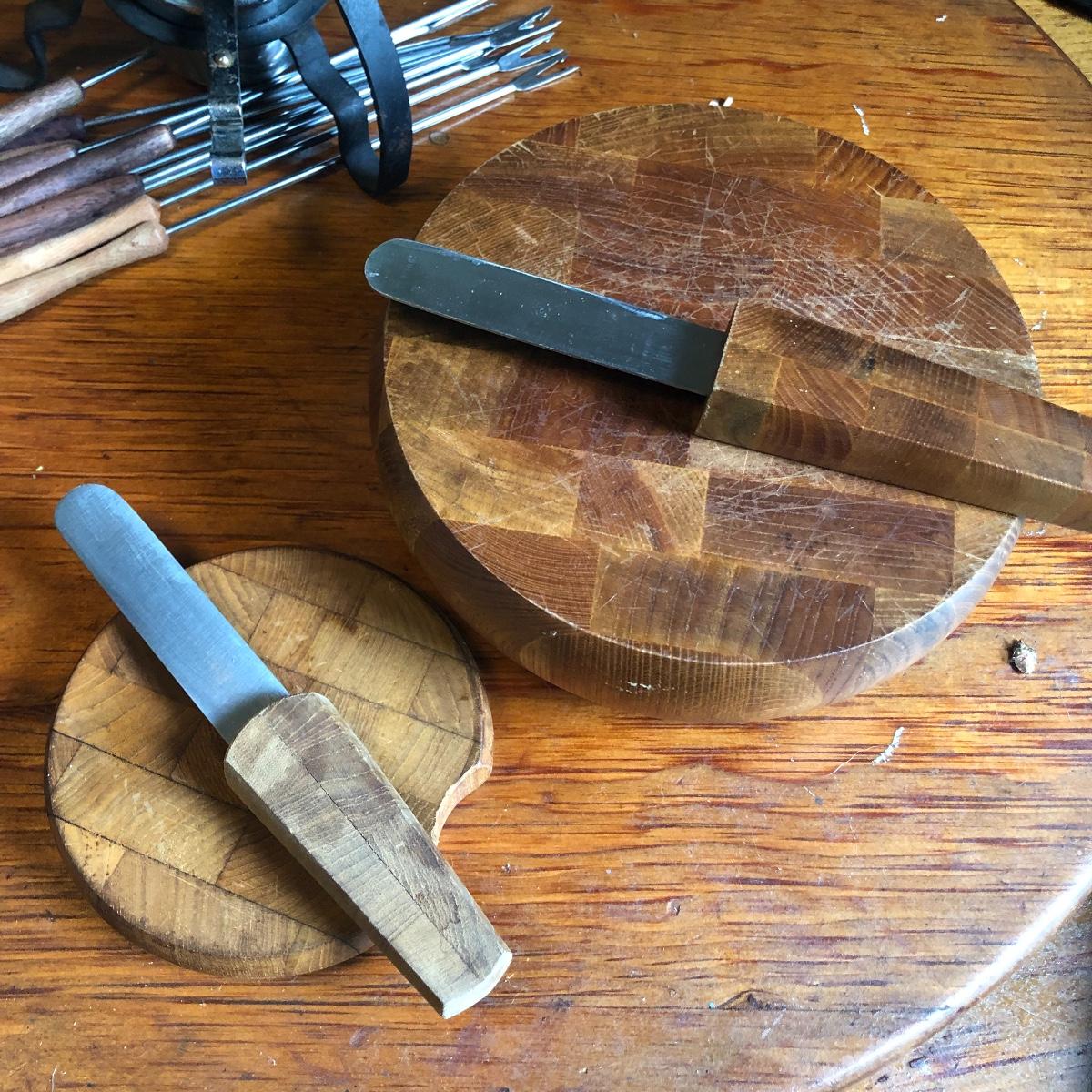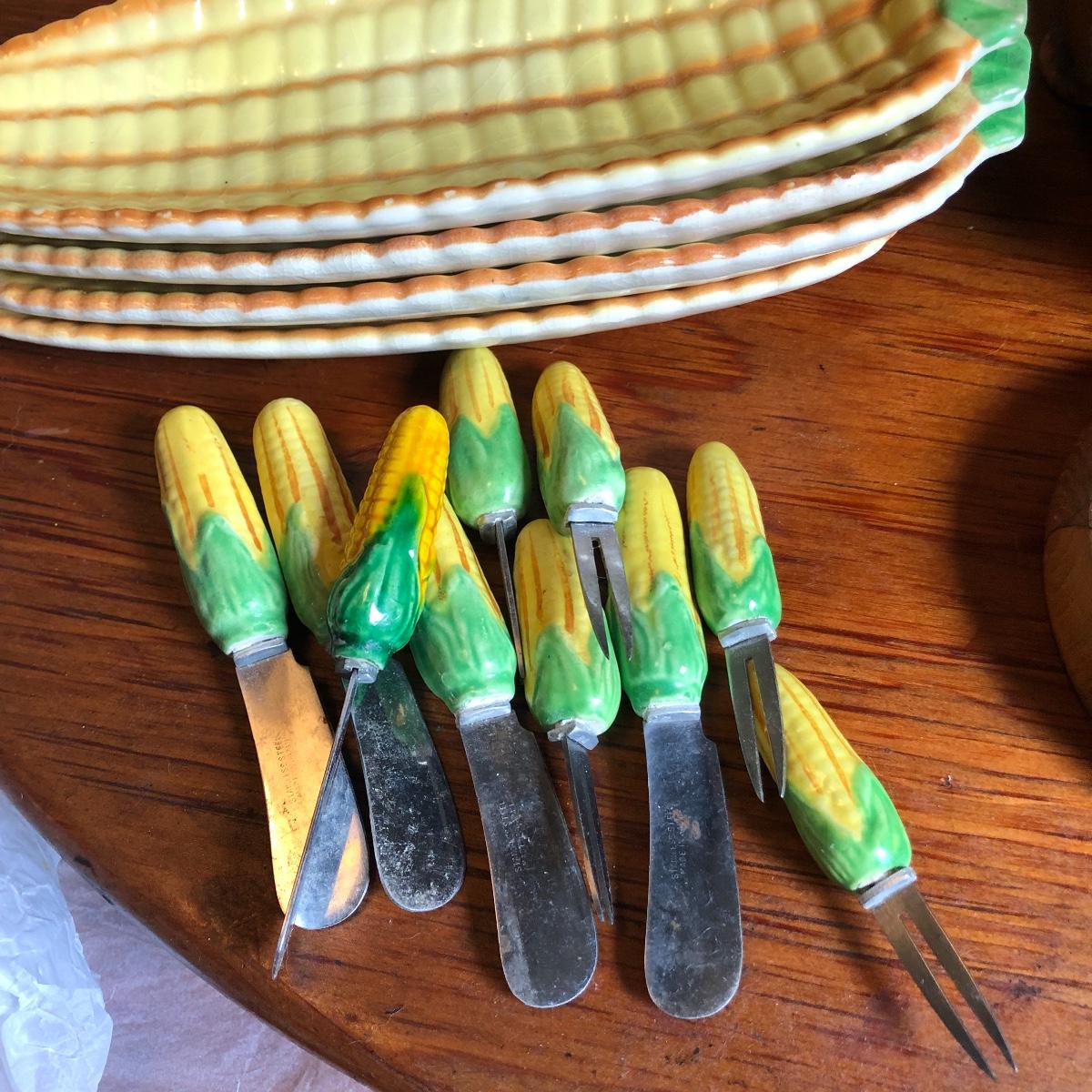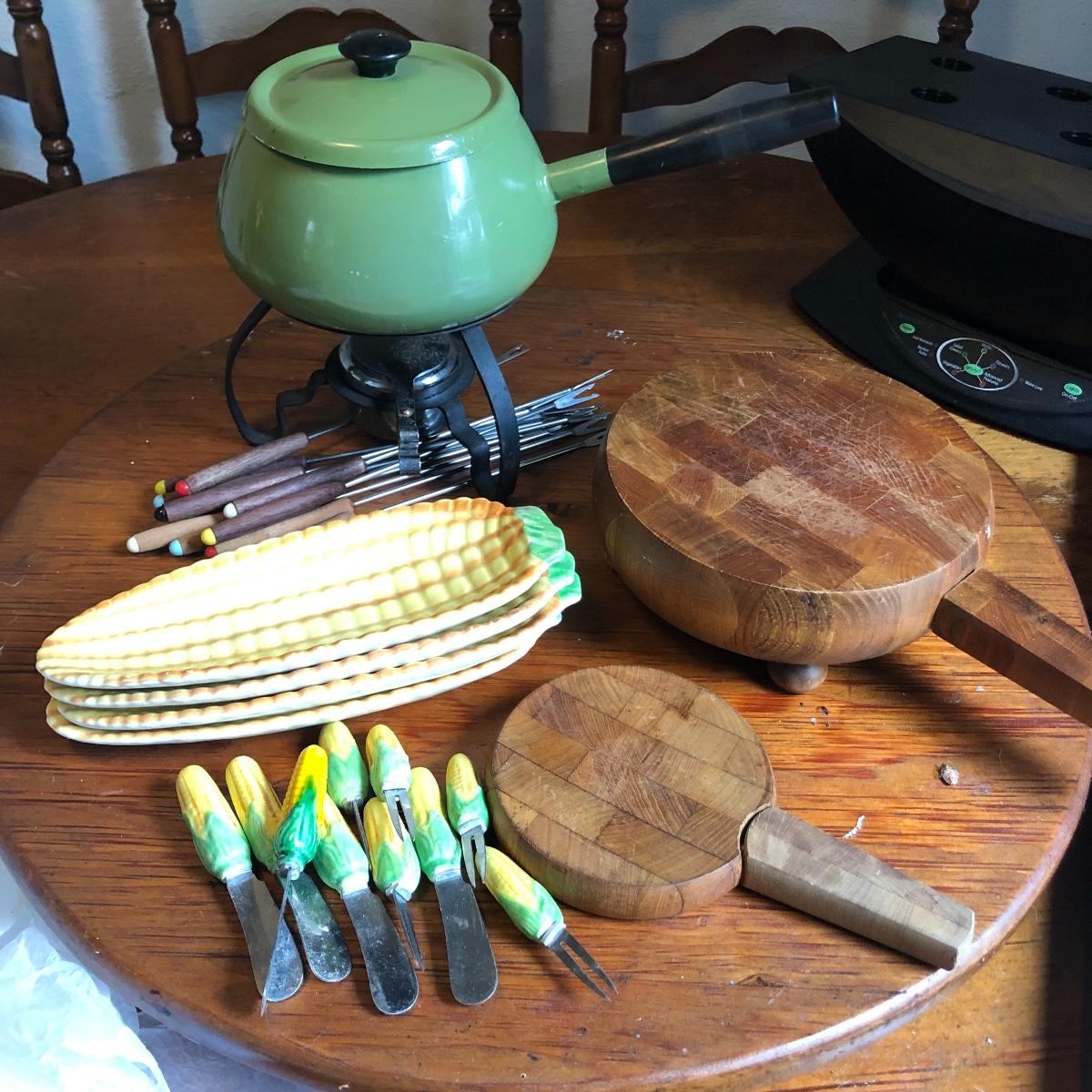 Add some character to your next get together with this vintage assortment of entertaining items including a fondue set, two cheese or bread boards with built in butter knives (each have some surface scratches) and 4 ceramic corn dish’s and cutlery.