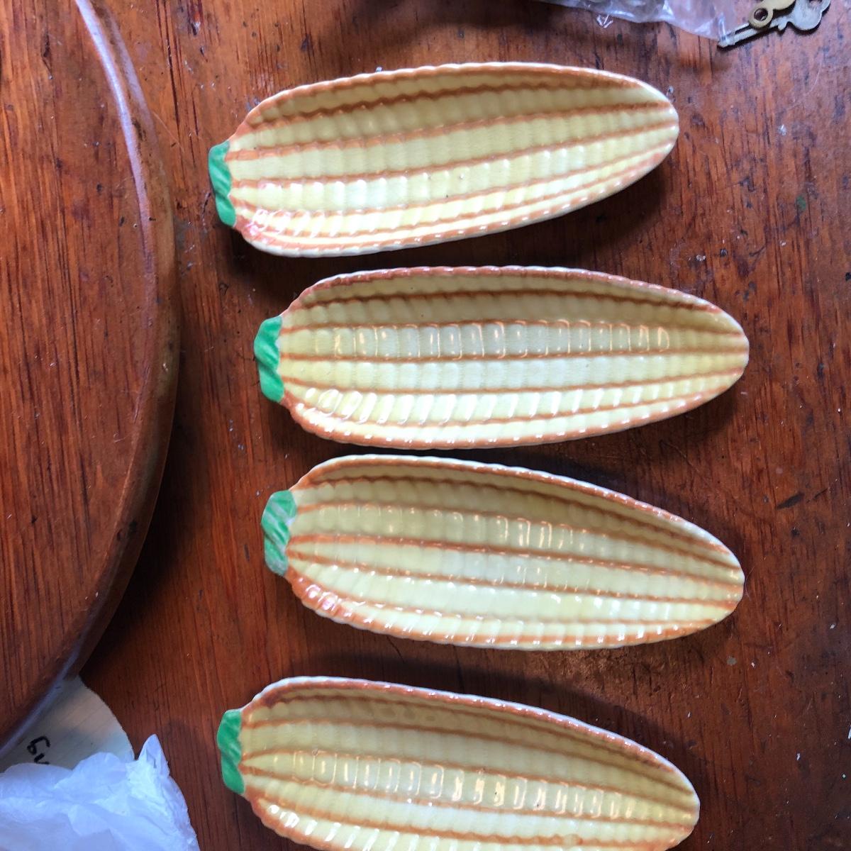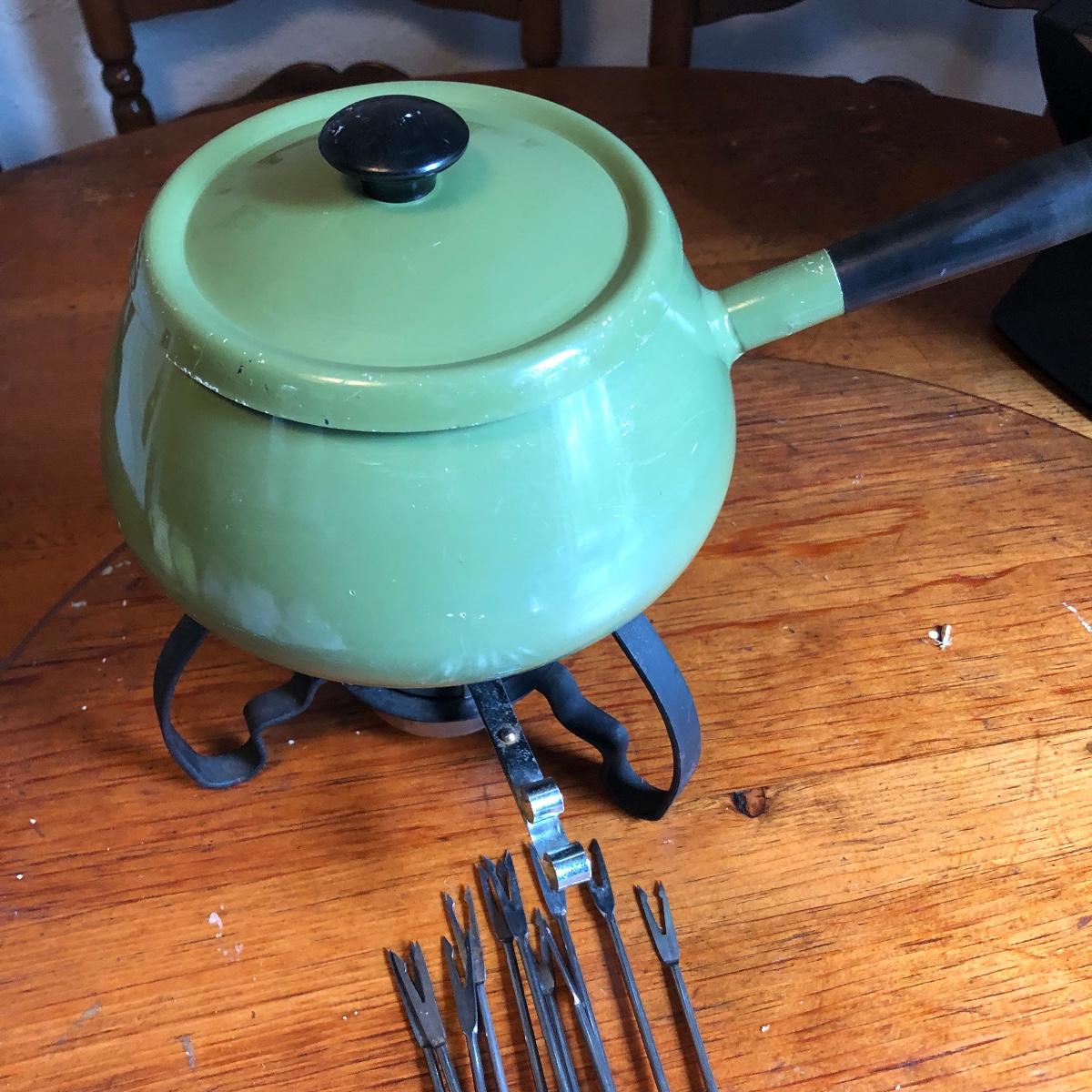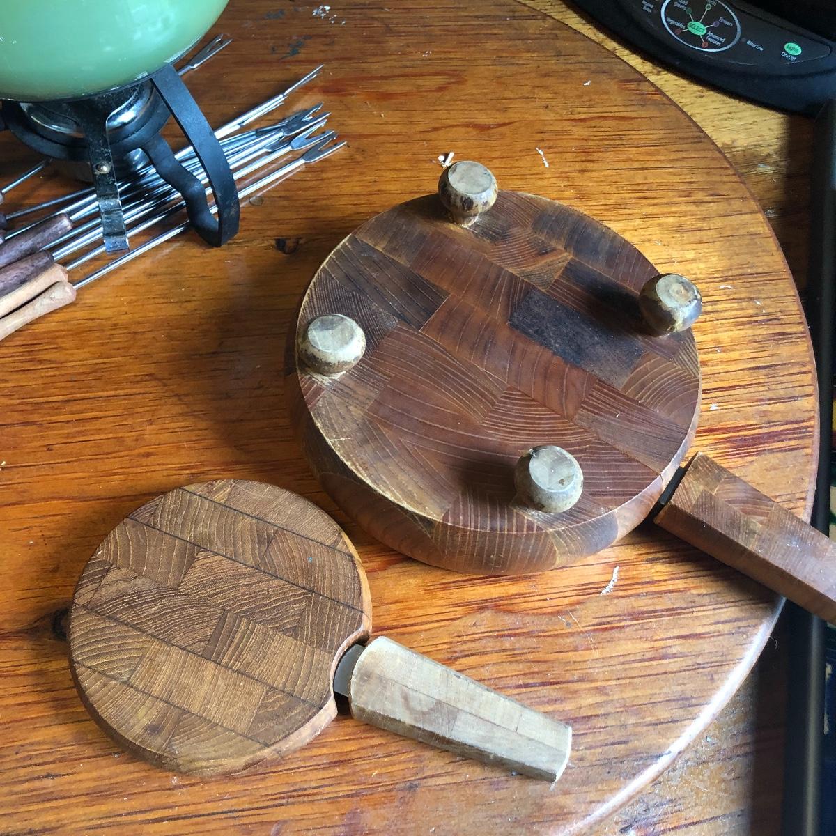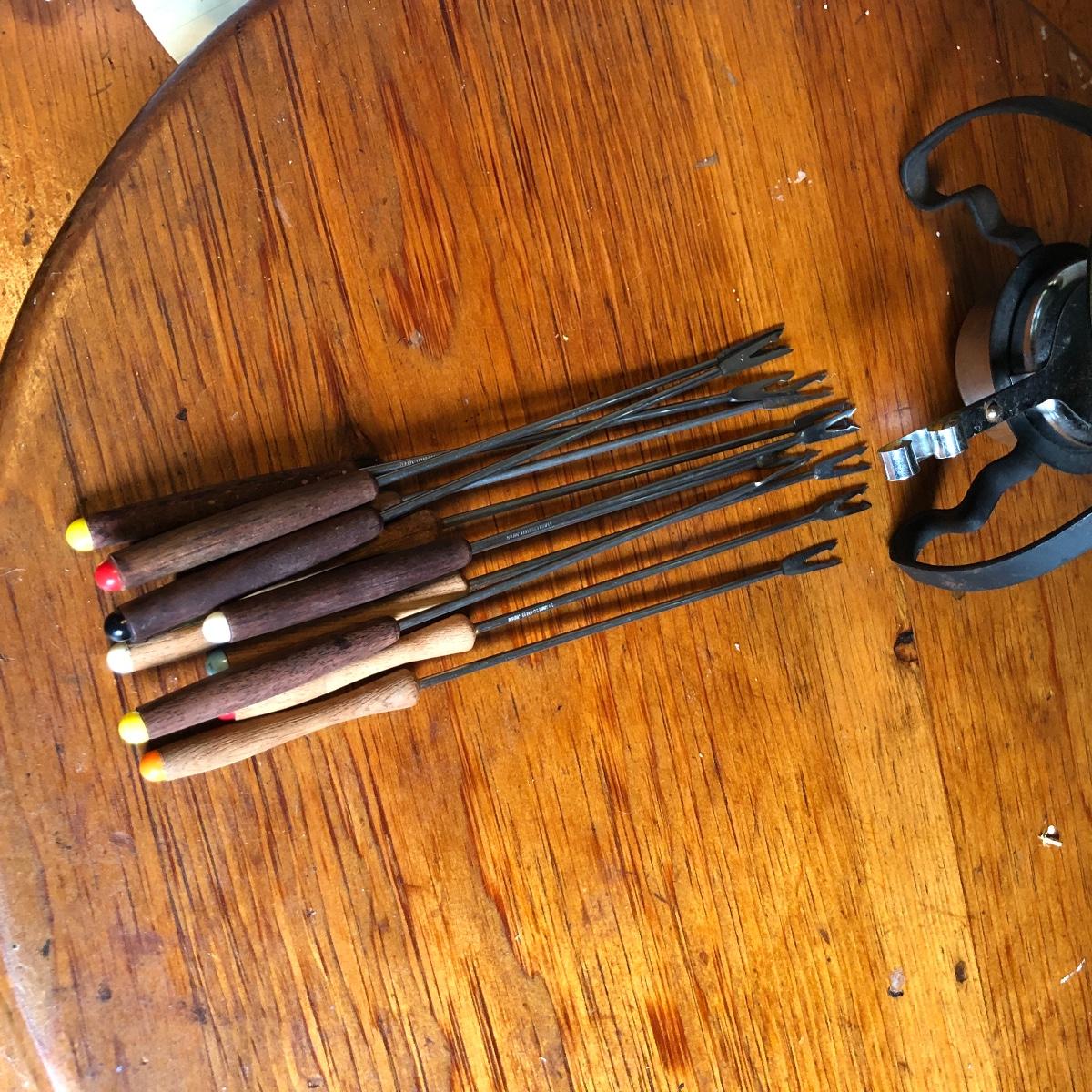 Add some character to your next get together with this vintage assortment of entertaining items including a fondue set, two cheese or bread boards with built in butter knives (each have some surface scratches) and 4 ceramic corn dish’s and cutlery.