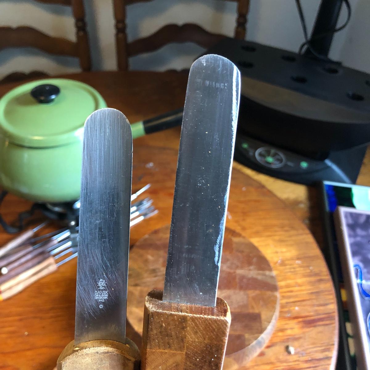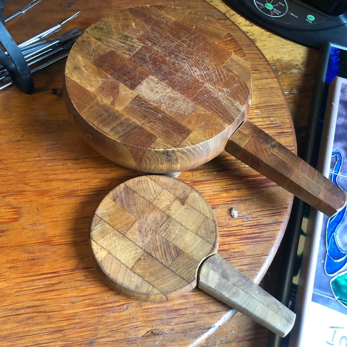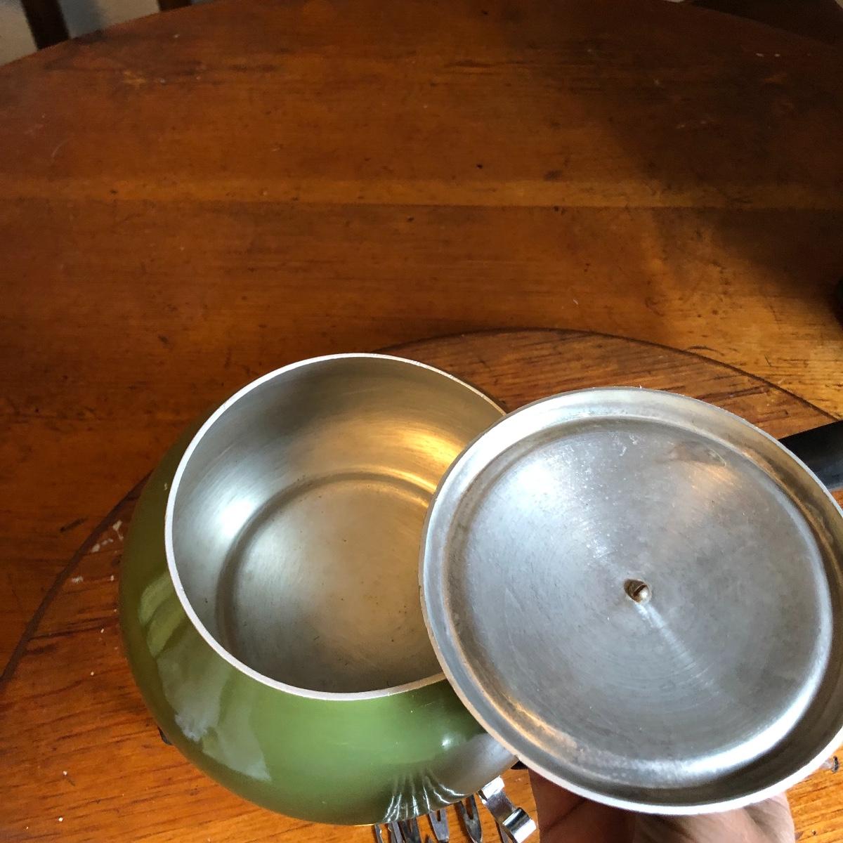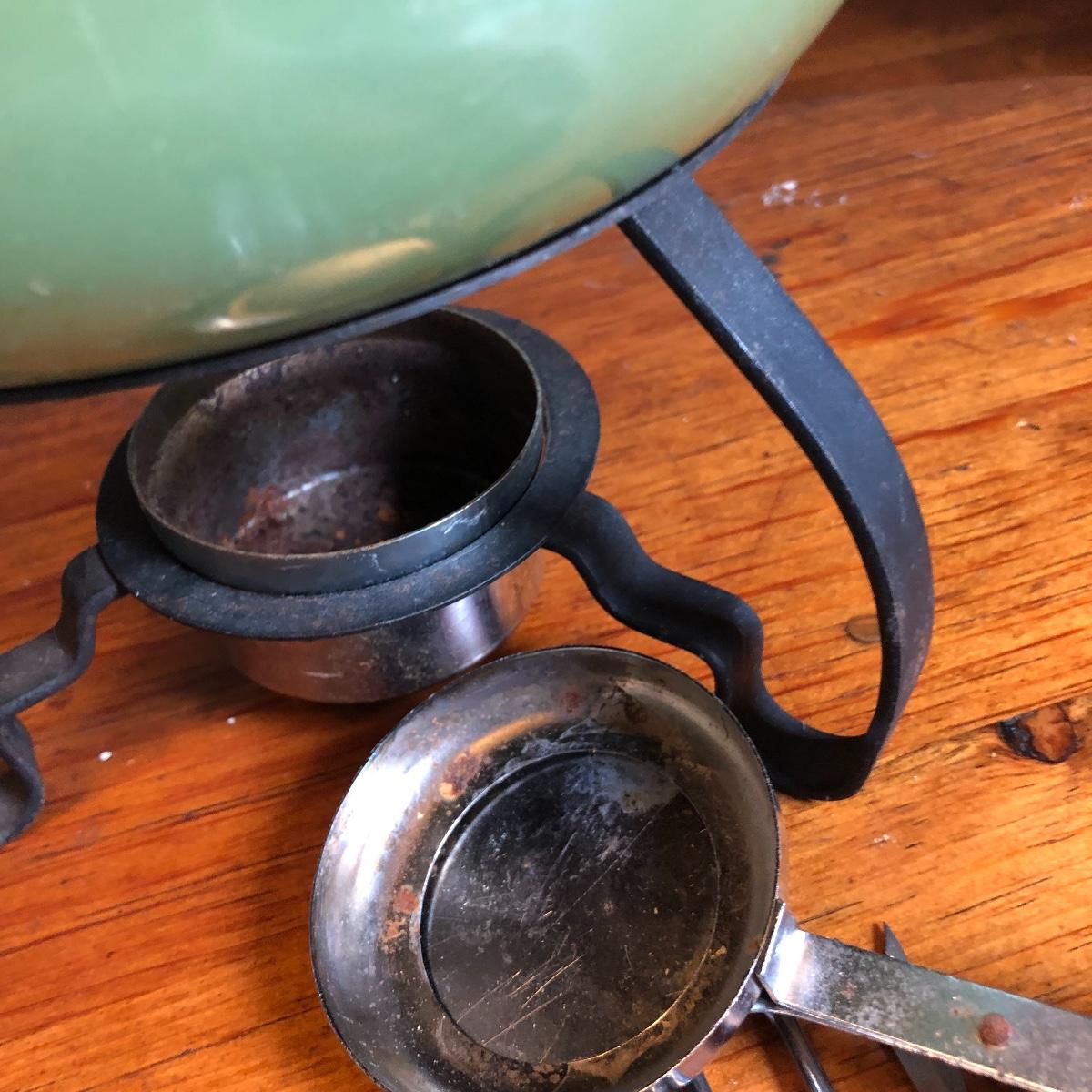 Add some character to your next get together with this vintage assortment of entertaining items including a fondue set, two cheese or bread boards with built in butter knives (each have some surface scratches) and 4 ceramic corn dish’s and cutlery.