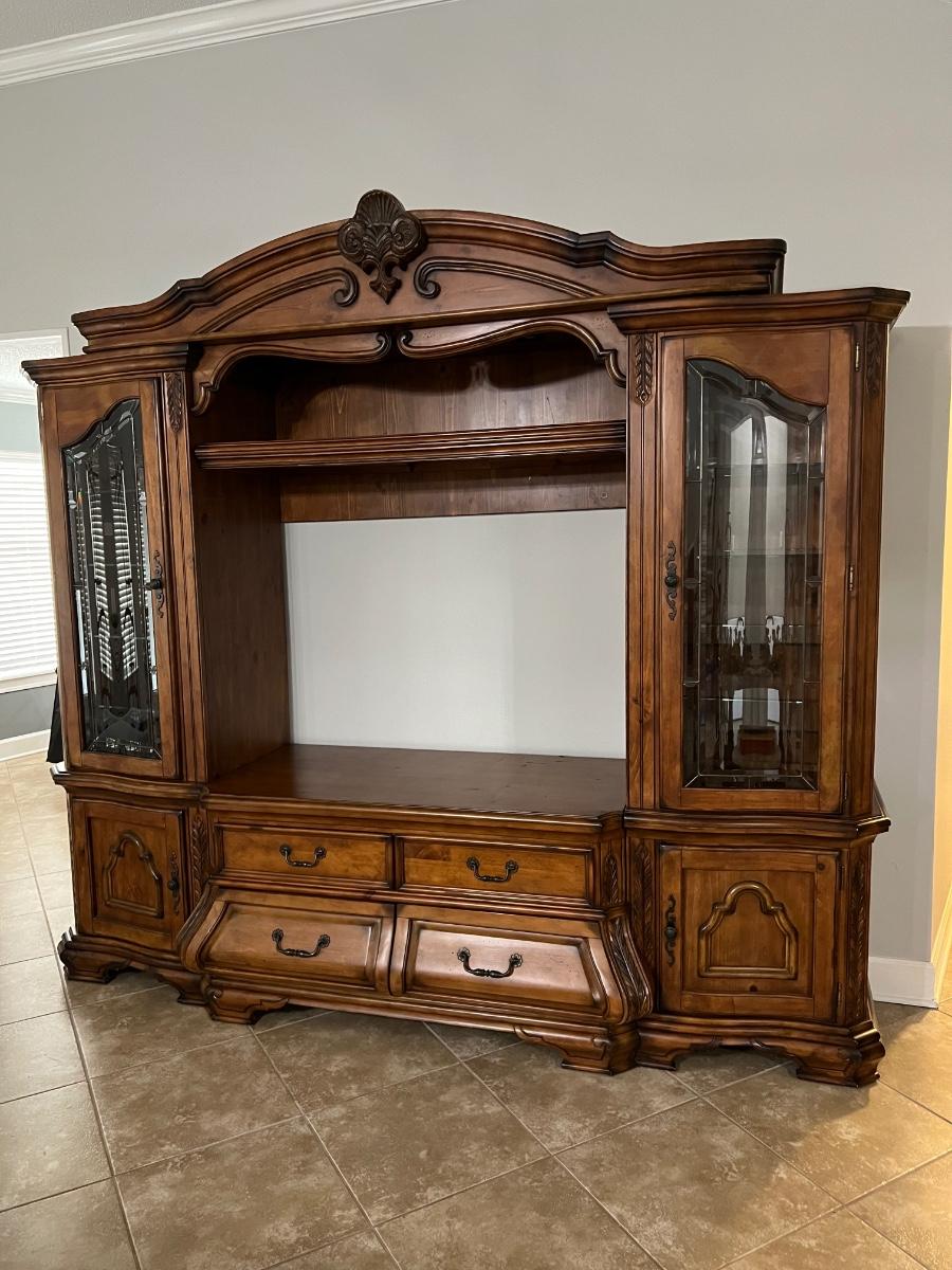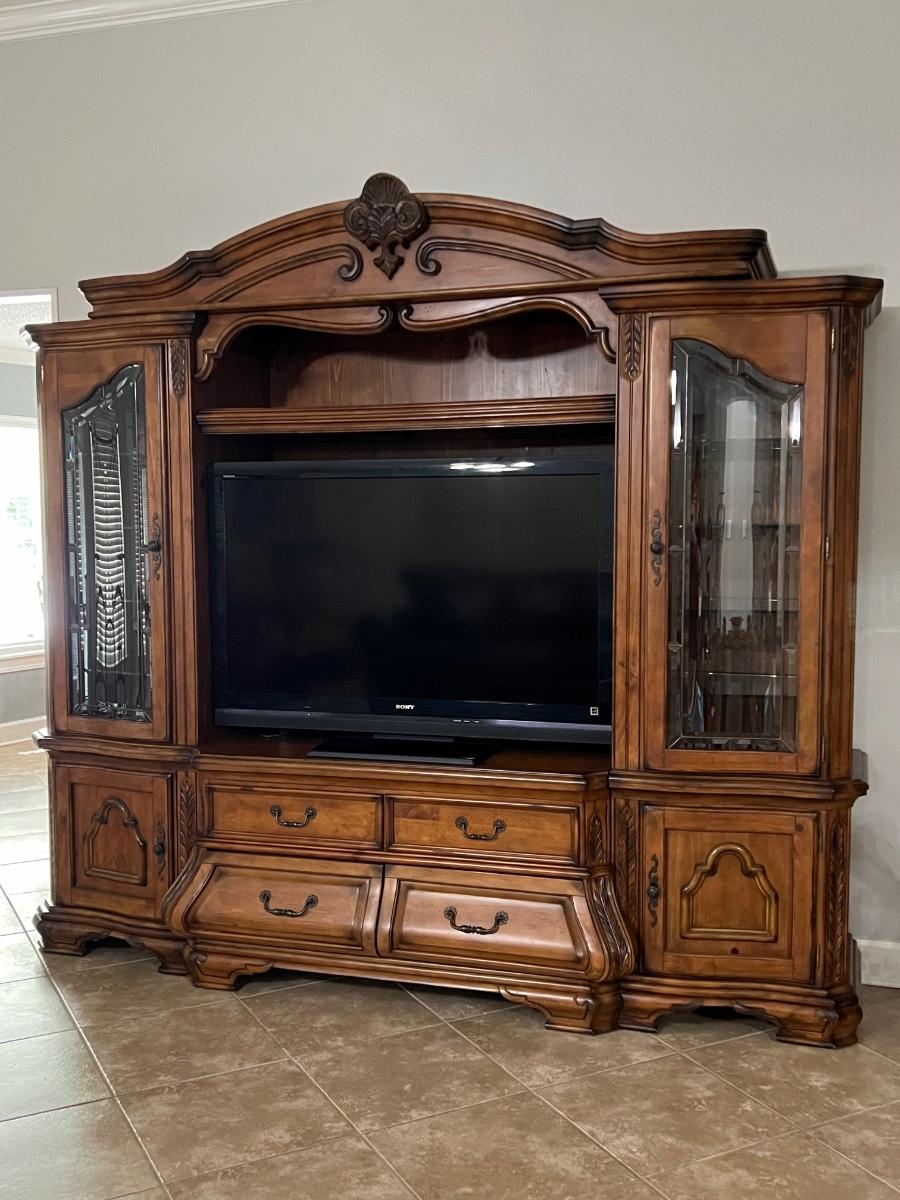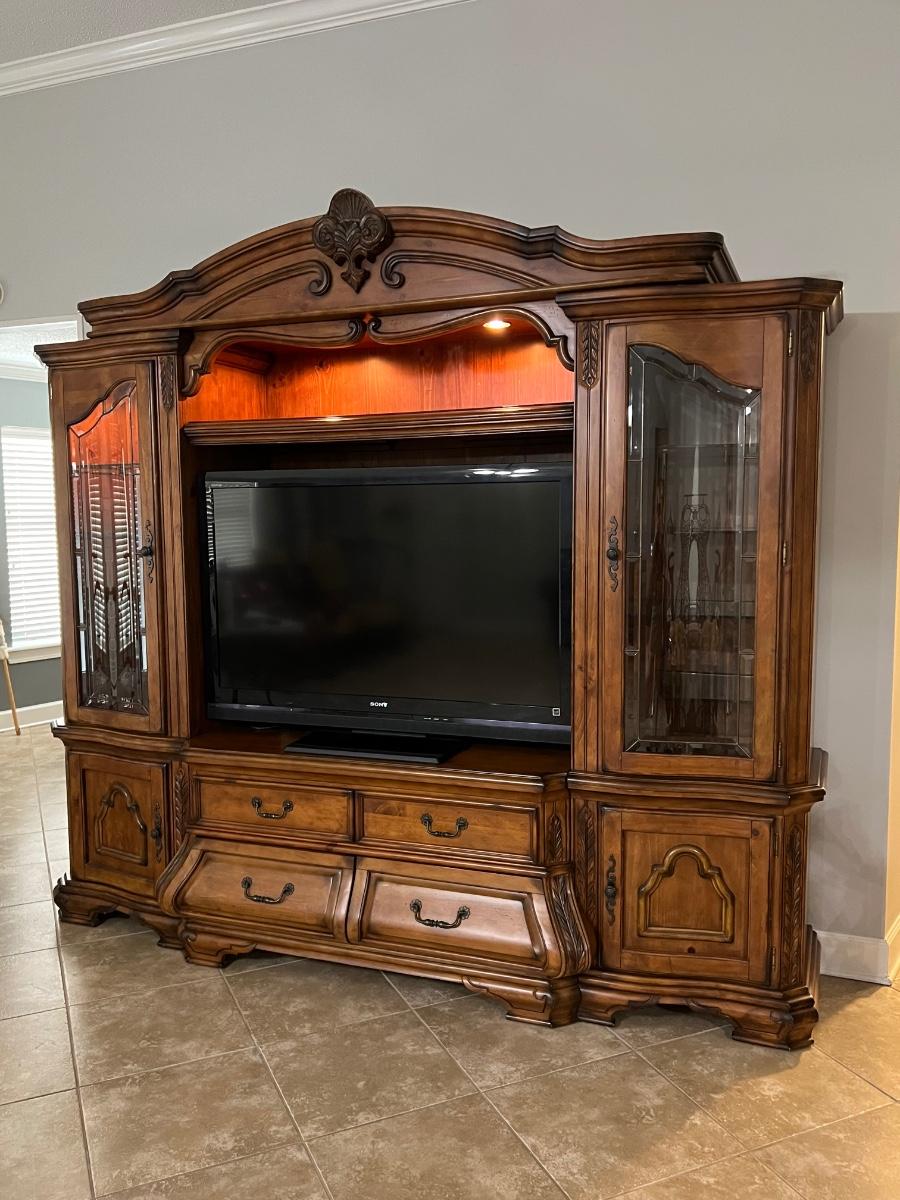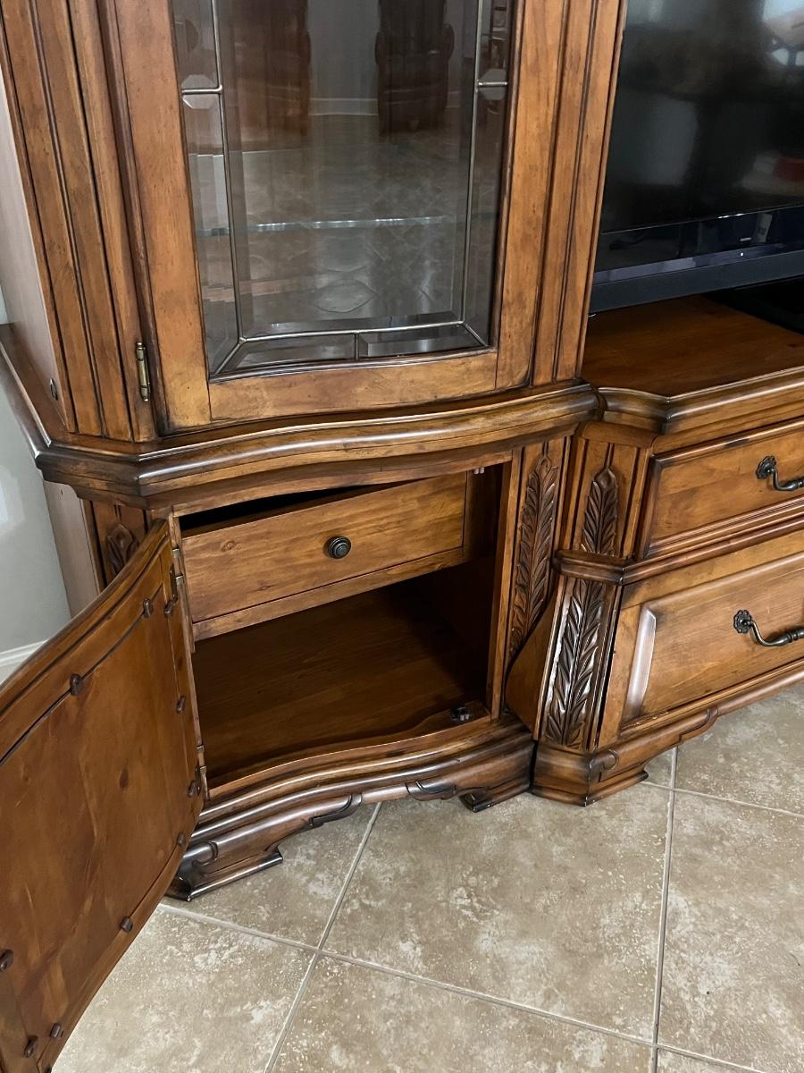 4 pieces ~ All drawers are felt lined & slide easy ~ Glass shelving is adjustable ~ TV sold separately ~ The light on the right-side cabinet does work, just needs a new bulb ~ Entire unit = 92” H x 106” W x 26” D ~ Each end piece = 79” H x 25” W x 22” D ~ Top shelf above tv is adjustable ~ The space where the TV sits as shown is 50" wide