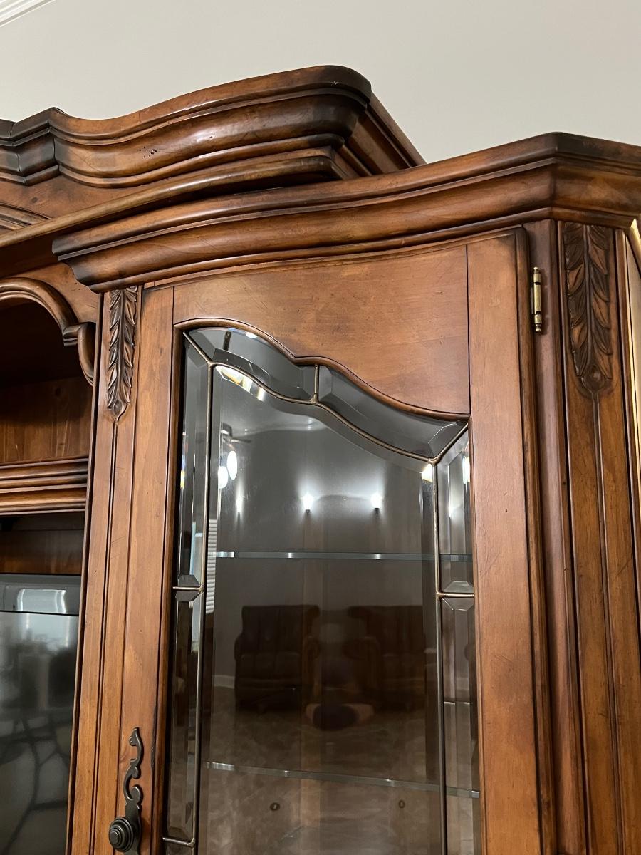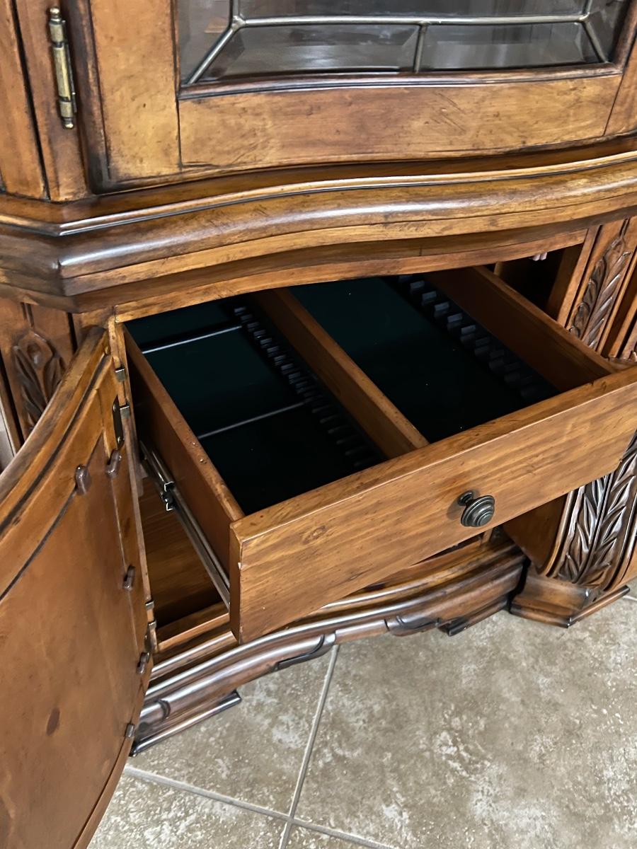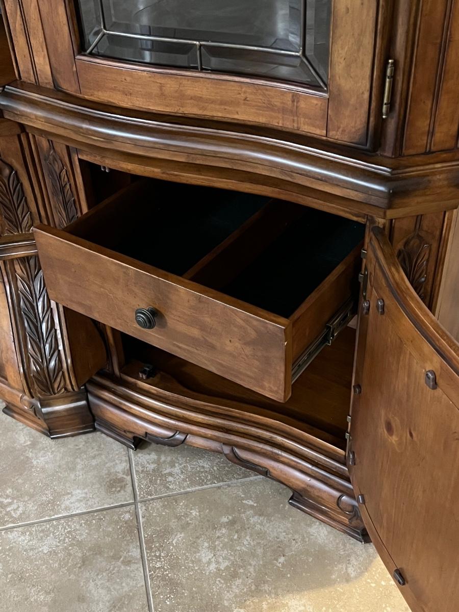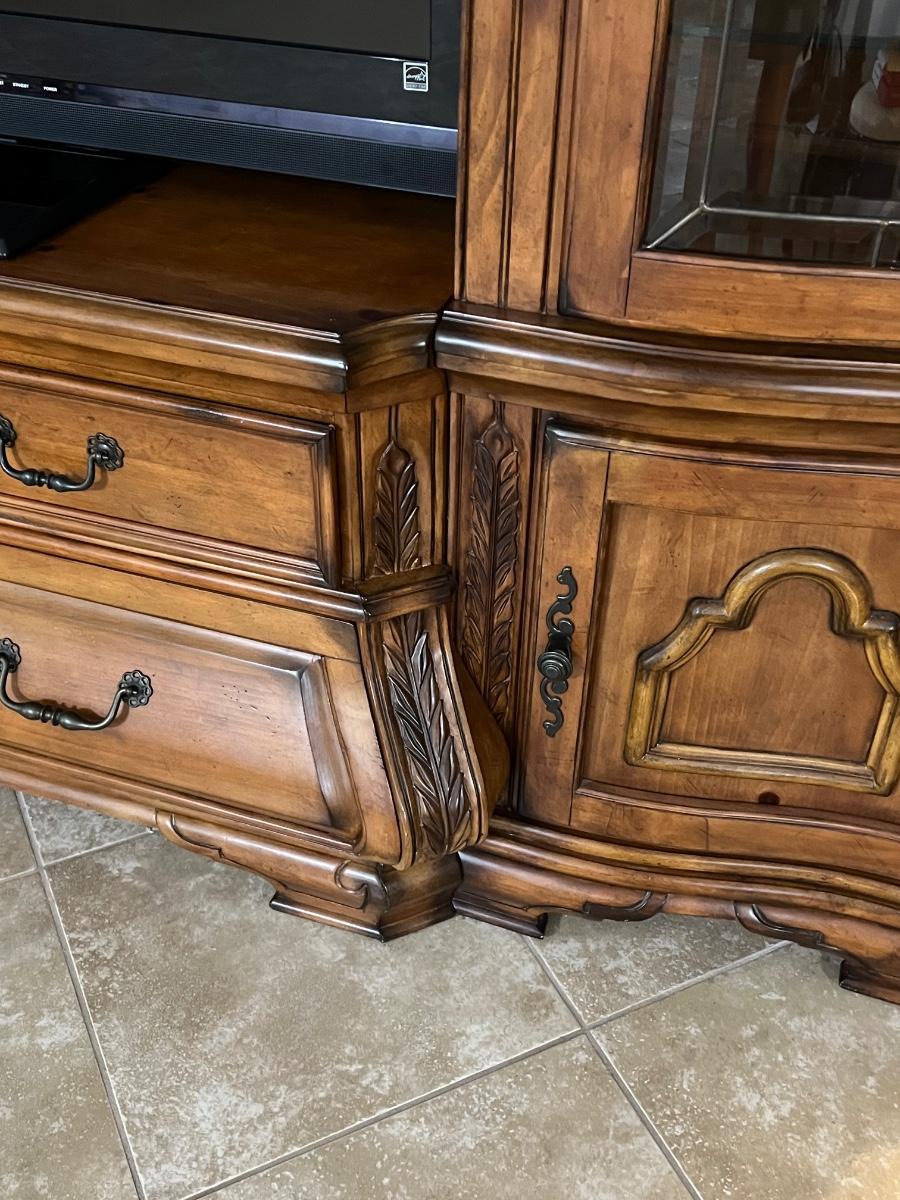 4 pieces ~ All drawers are felt lined & slide easy ~ Glass shelving is adjustable ~ TV sold separately ~ The light on the right-side cabinet does work, just needs a new bulb ~ Entire unit = 92” H x 106” W x 26” D ~ Each end piece = 79” H x 25” W x 22” D ~ Top shelf above tv is adjustable ~ The space where the TV sits as shown is 50" wide