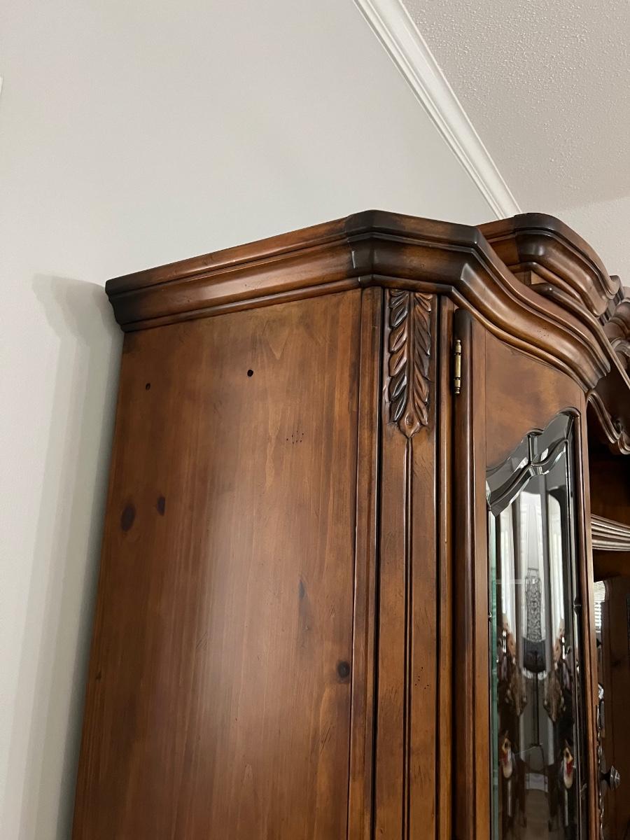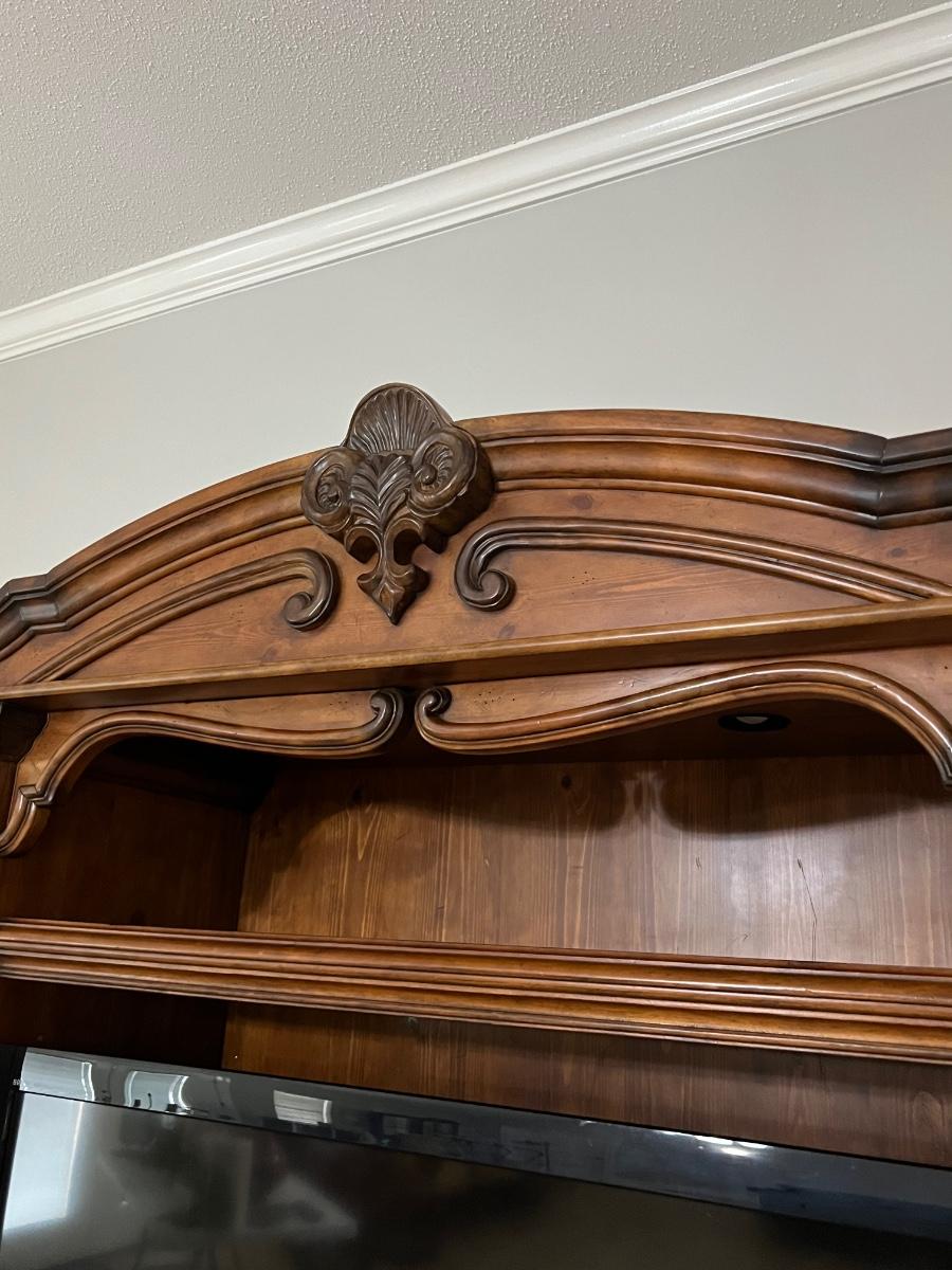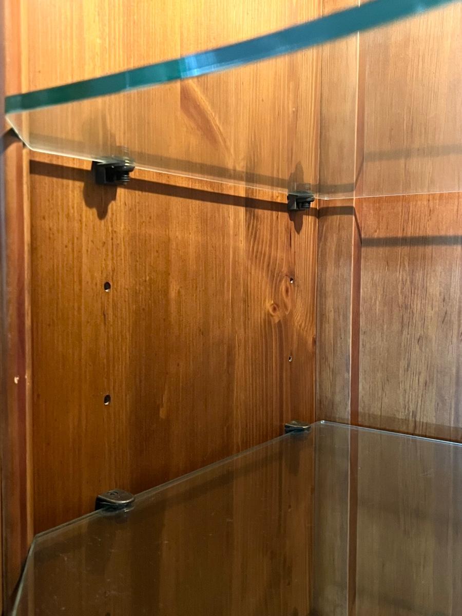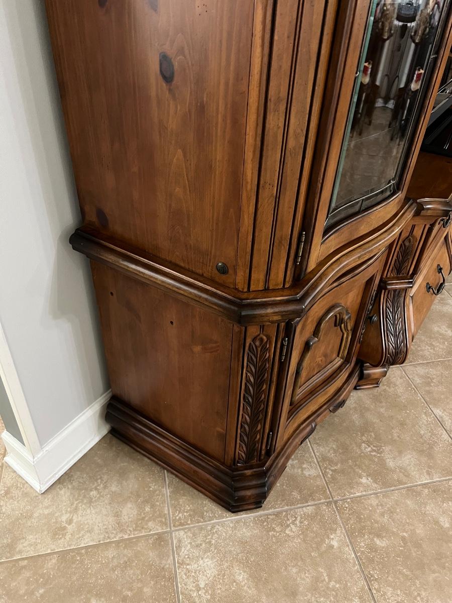 4 pieces ~ All drawers are felt lined & slide easy ~ Glass shelving is adjustable ~ TV sold separately ~ The light on the right-side cabinet does work, just needs a new bulb ~ Entire unit = 92” H x 106” W x 26” D ~ Each end piece = 79” H x 25” W x 22” D ~ Top shelf above tv is adjustable ~ The space where the TV sits as shown is 50" wide