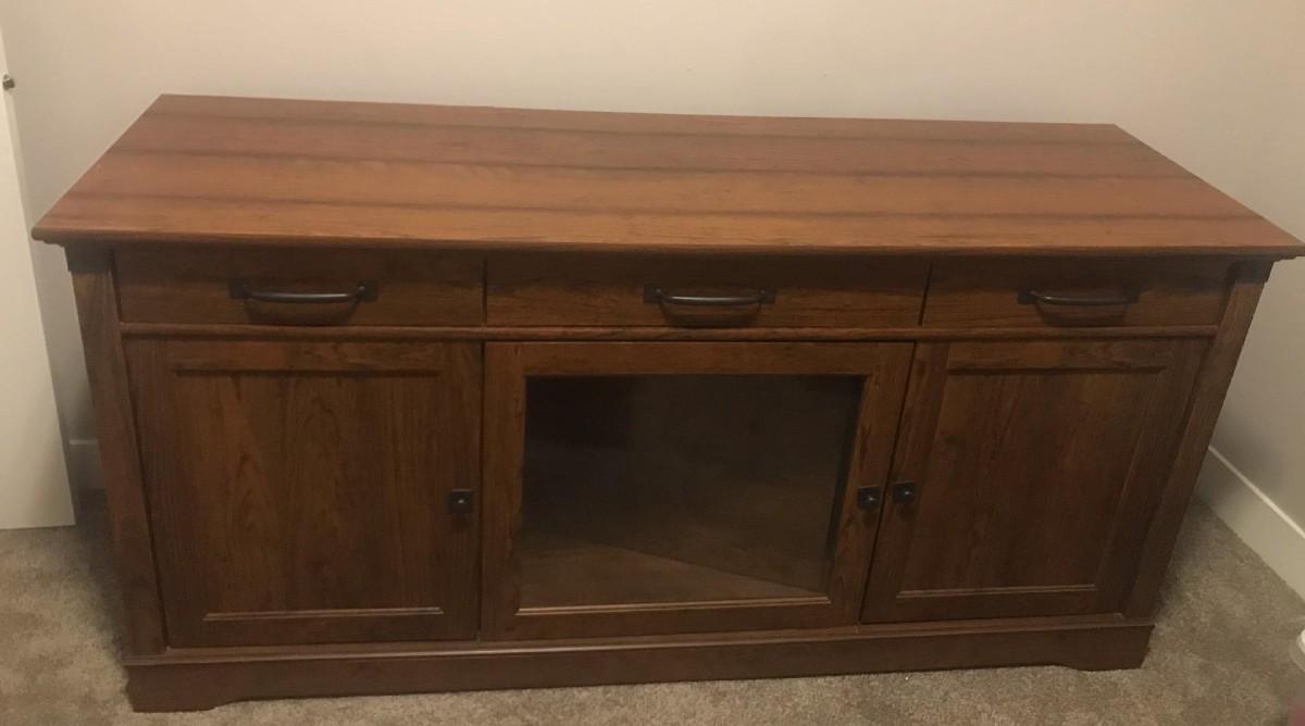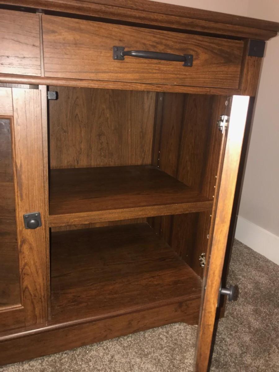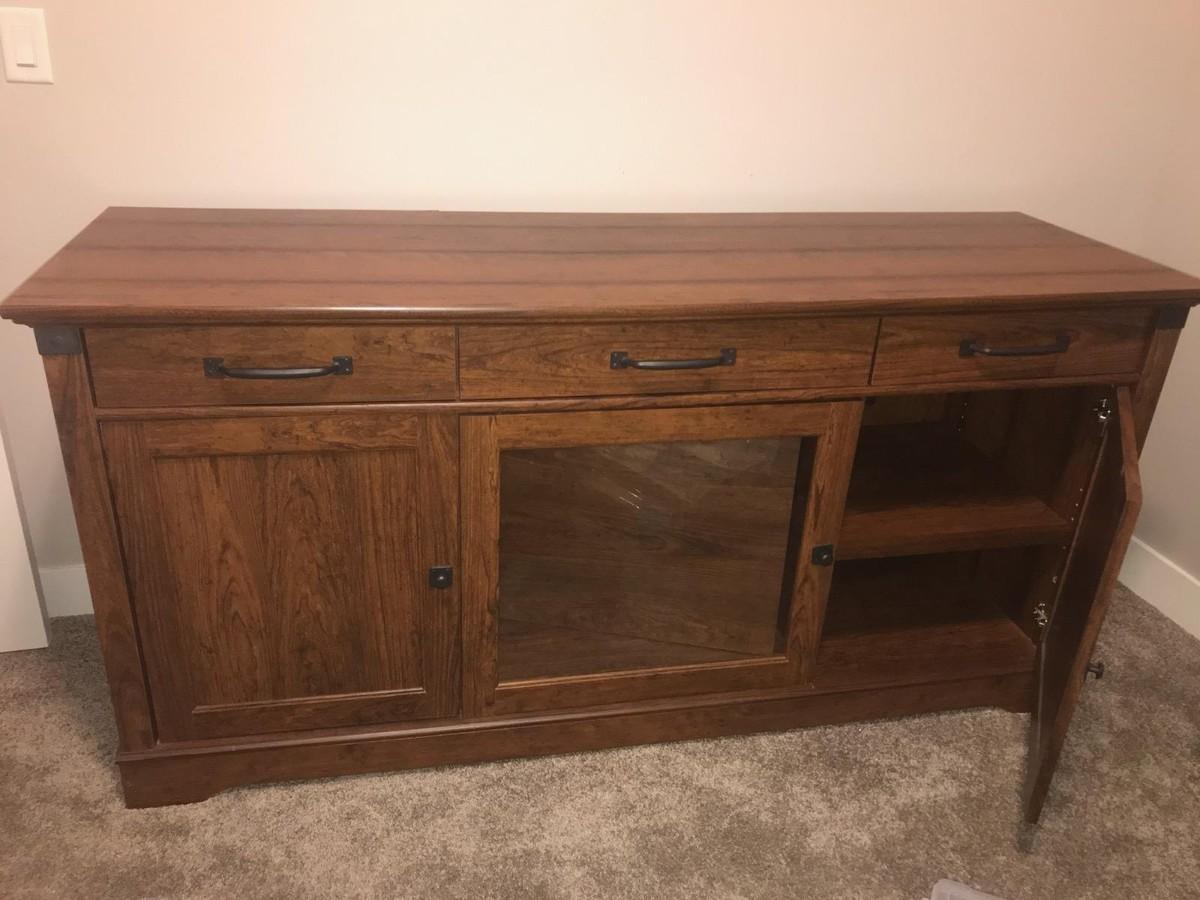 Three drawers, three doors, 4 shelves. 6 ft long, 23 inches wide, 35 inches tall. Shelves are adjustable.