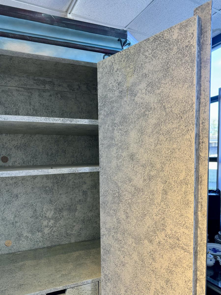 This Armoire is a straight pediment over door double cabinet. Double cabinet doors flanked by canted sides and raised bun feet. Interior has a shelf over two drawers. Three adjustable shelves.