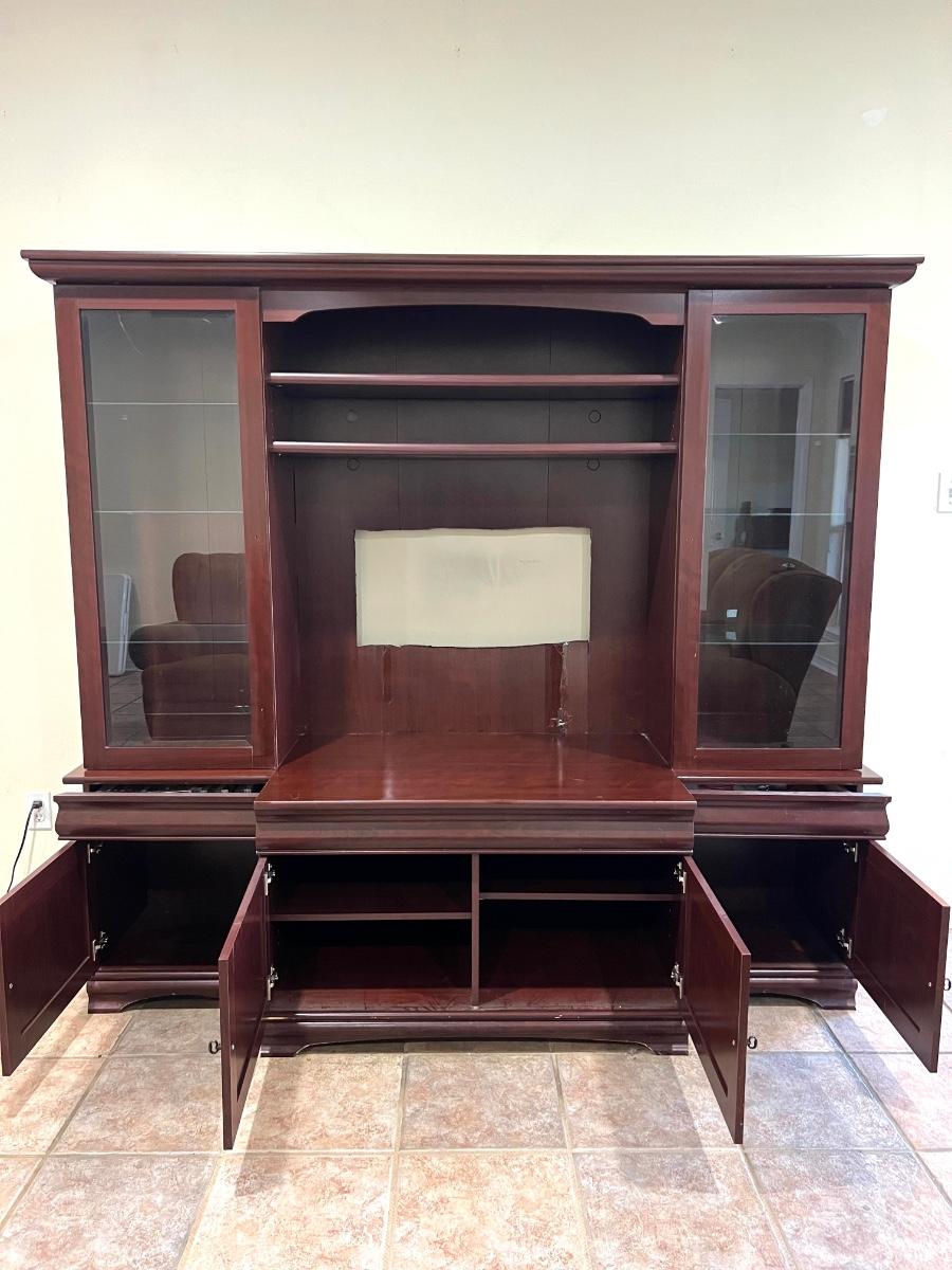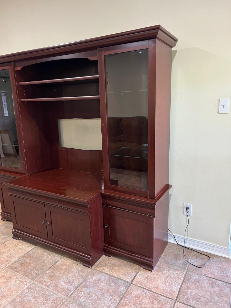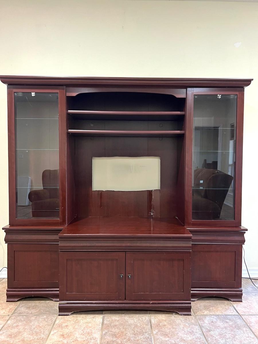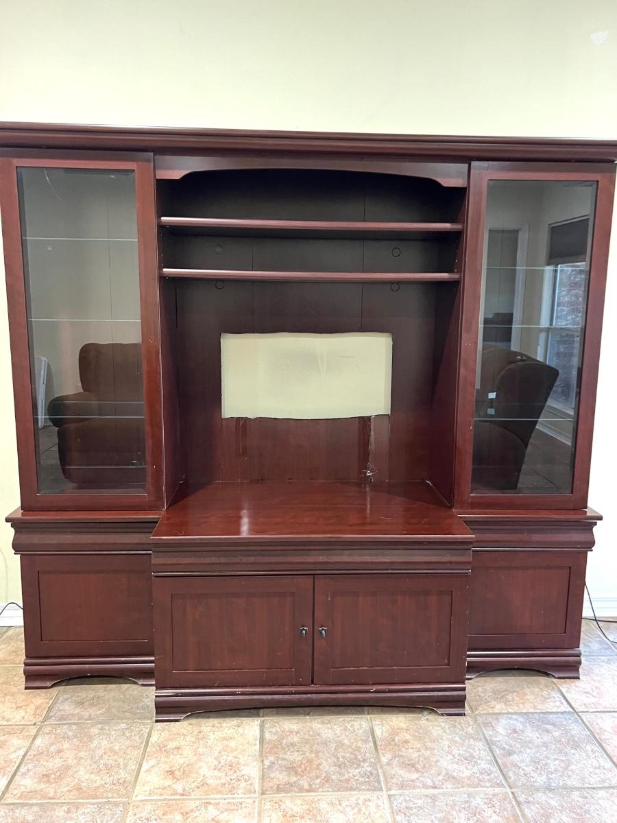 Entertainment center with lots of storage and glass display shelves. 4 shelves per side, two drawers and cabinets! Does show signs of use scratches, knicks, and the cabinet pulls are missing on the top cabinets. See pictures for measurements. This is ONE piece.