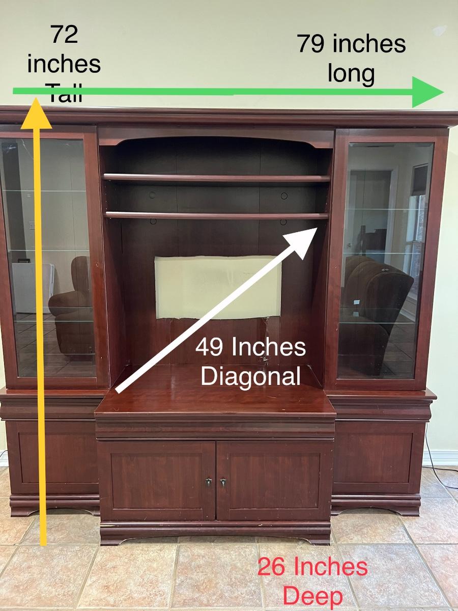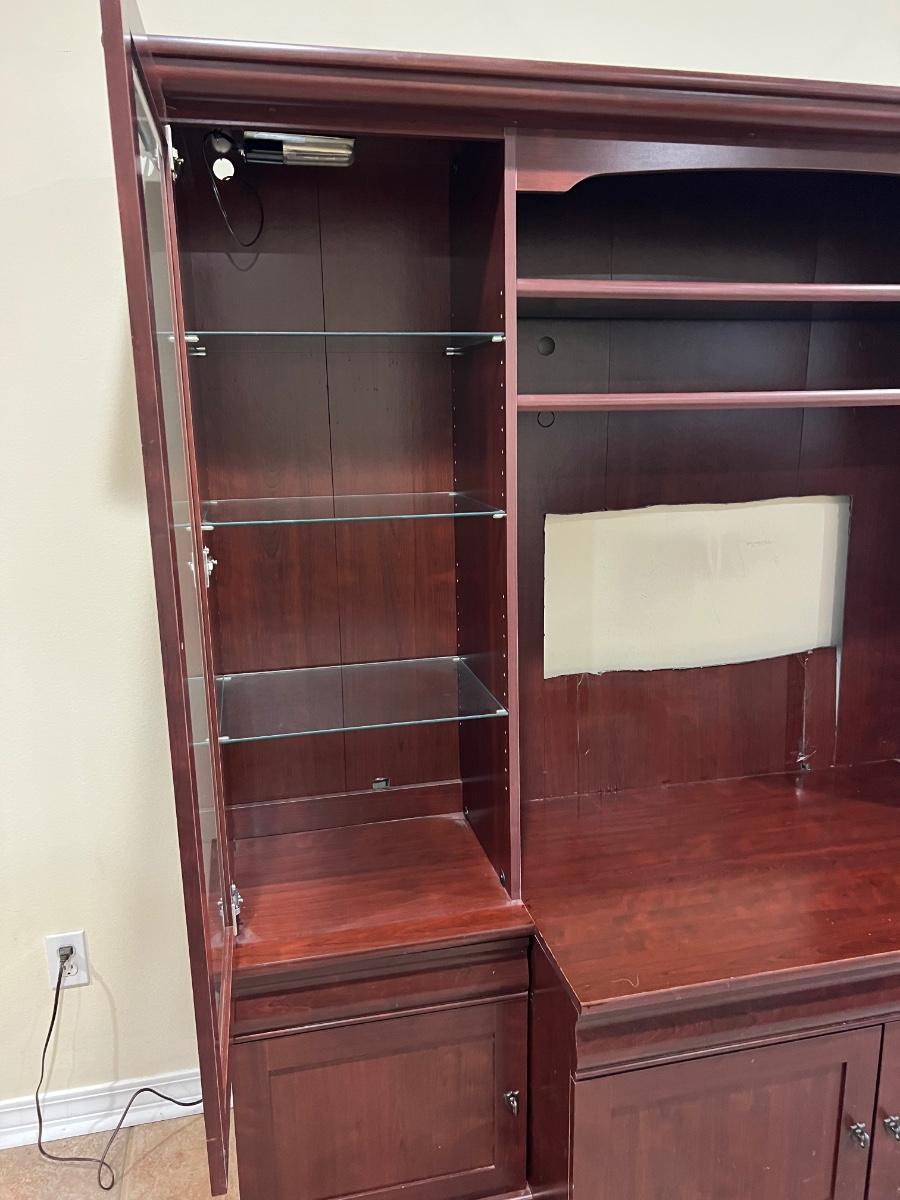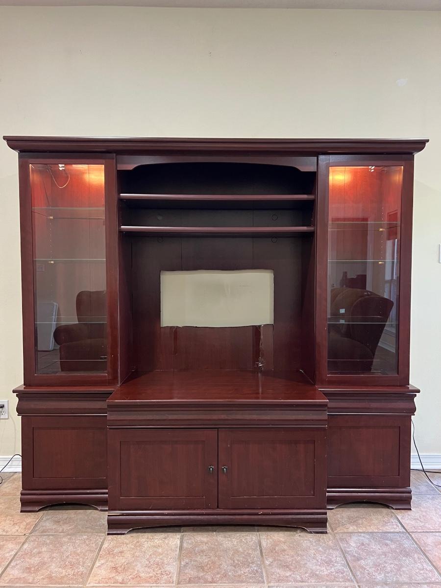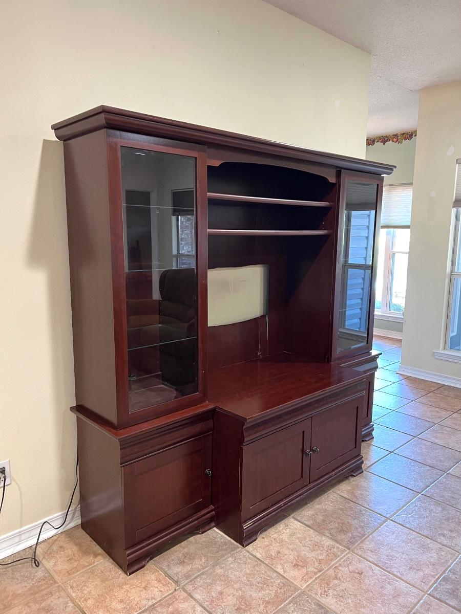 Entertainment center with lots of storage and glass display shelves. 4 shelves per side, two drawers and cabinets! Does show signs of use scratches, knicks, and the cabinet pulls are missing on the top cabinets. See pictures for measurements. This is ONE piece.