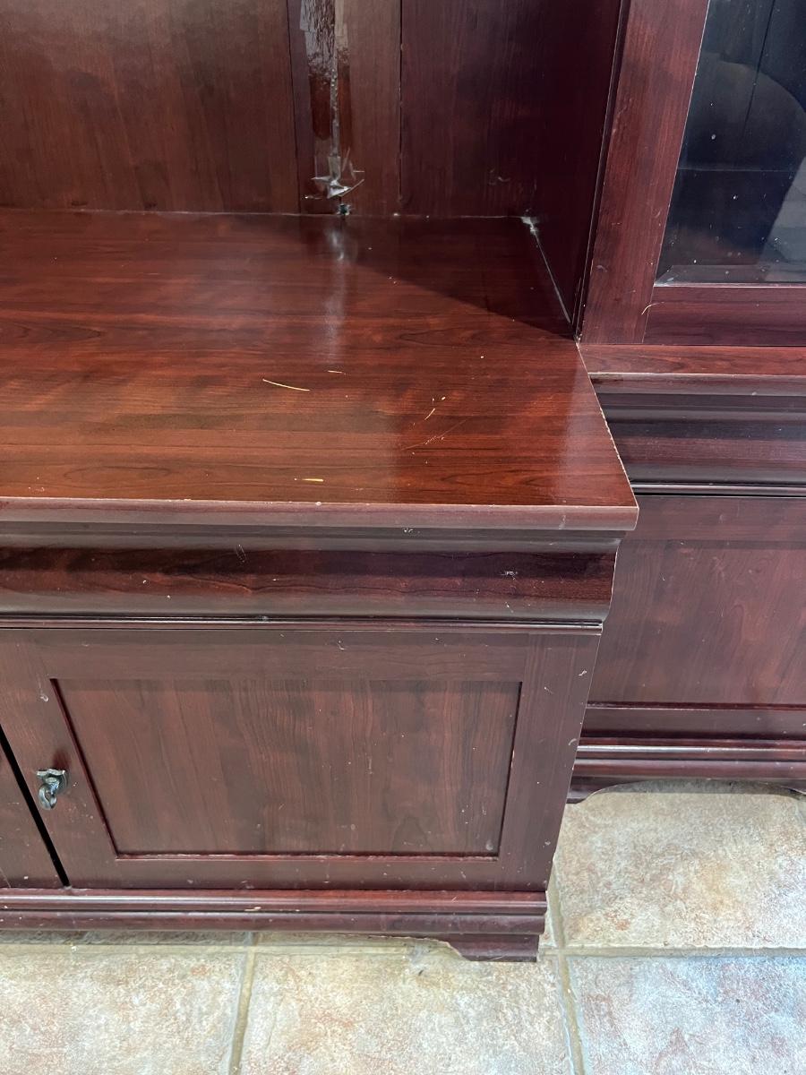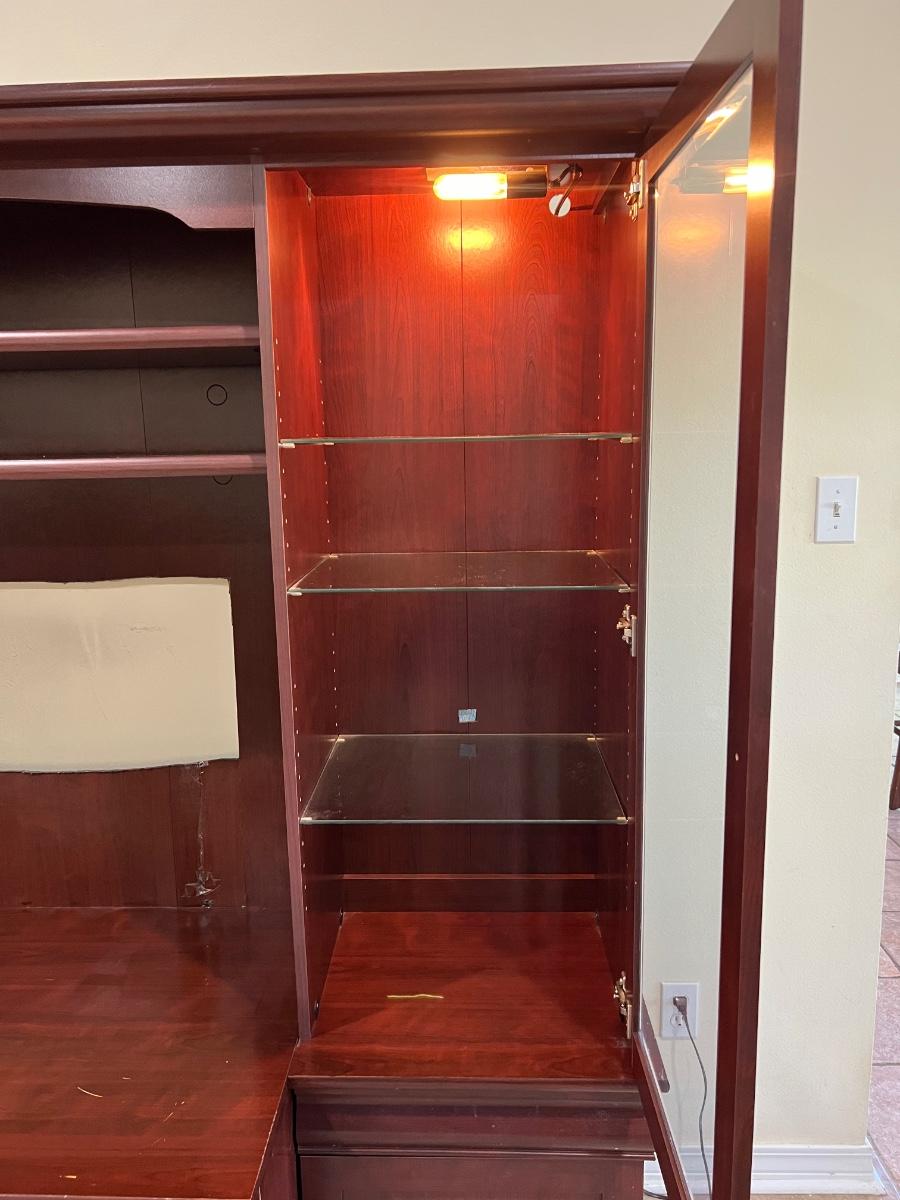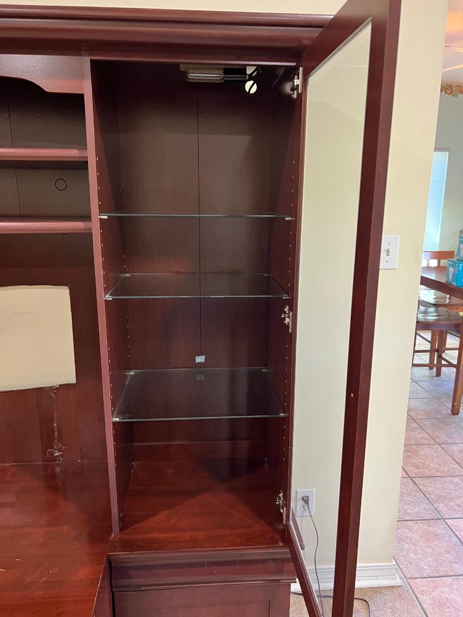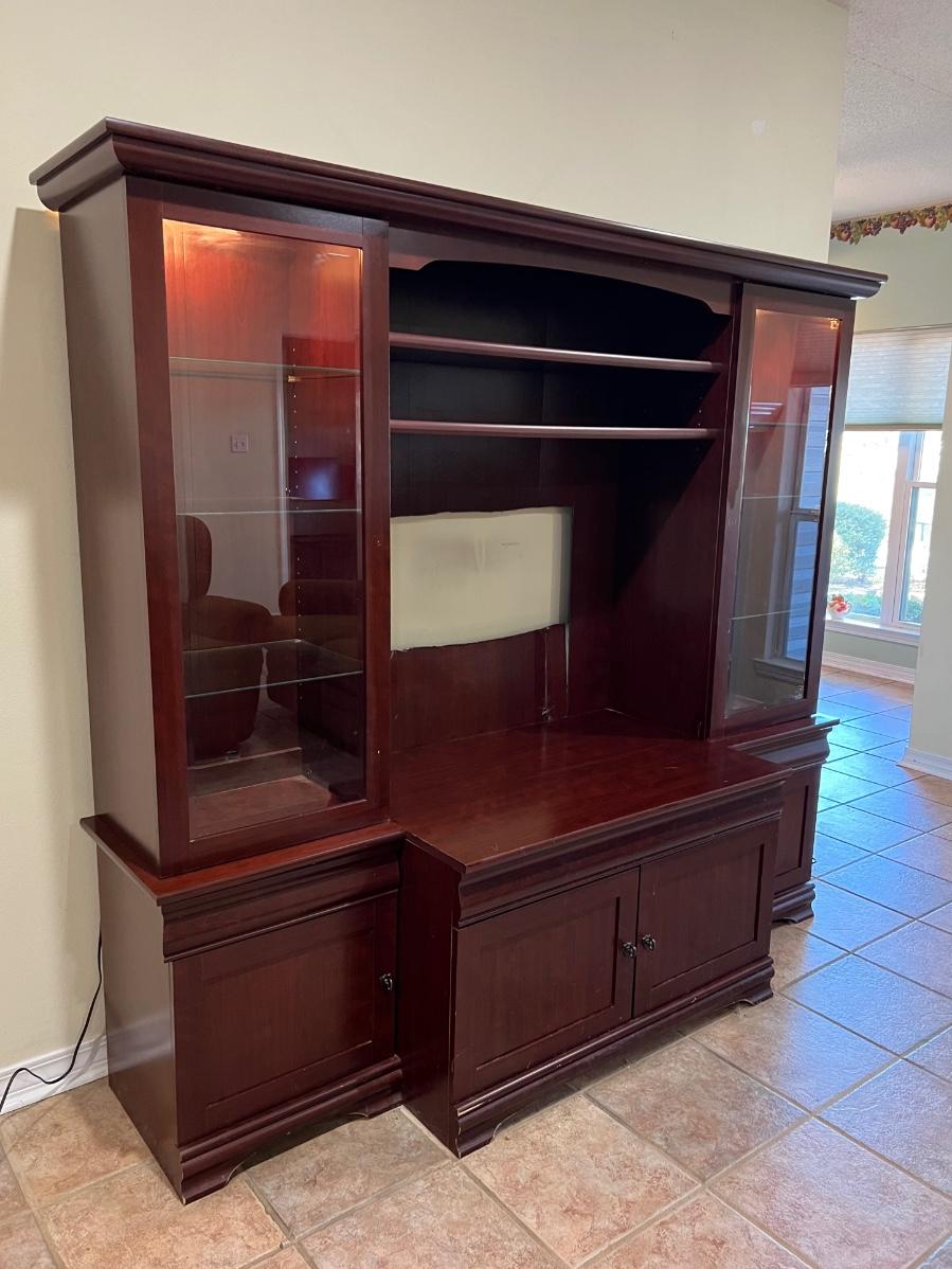 Entertainment center with lots of storage and glass display shelves. 4 shelves per side, two drawers and cabinets! Does show signs of use scratches, knicks, and the cabinet pulls are missing on the top cabinets. See pictures for measurements. This is ONE piece.