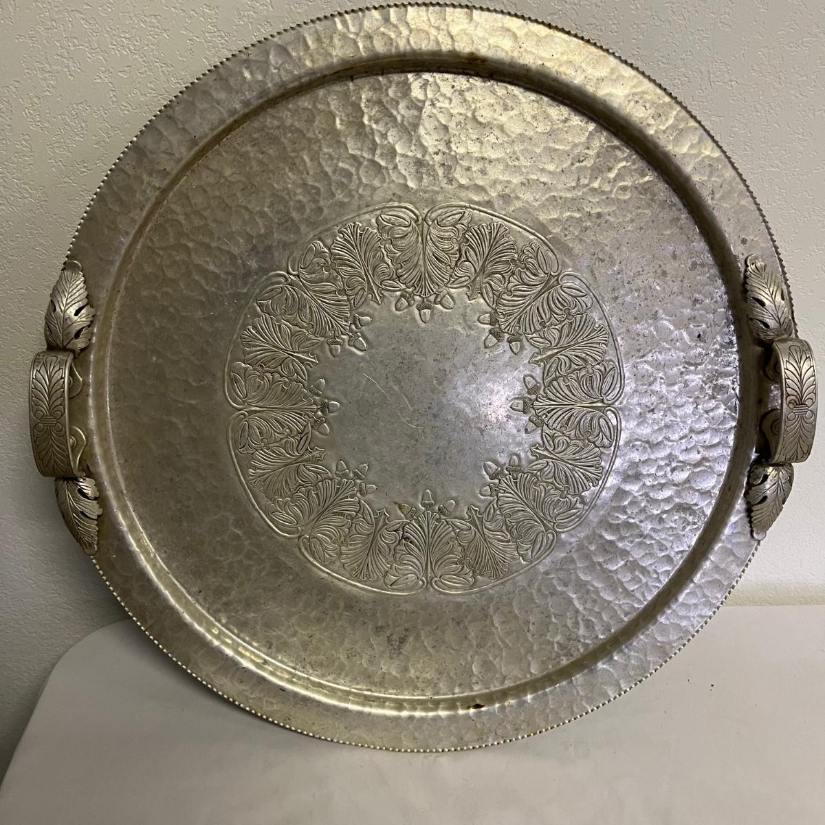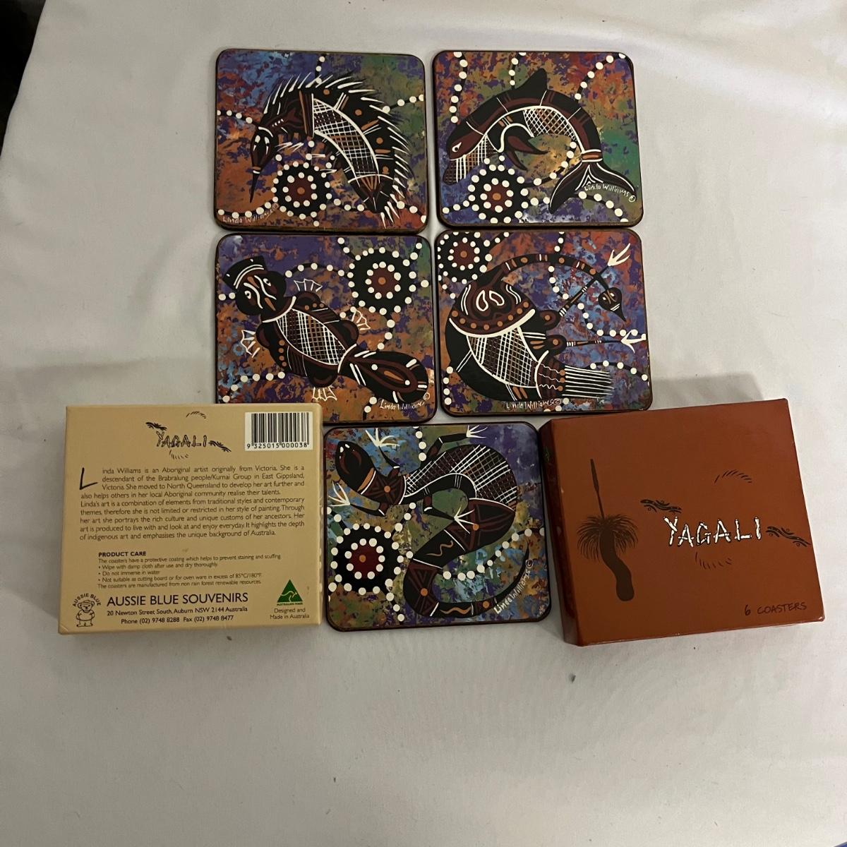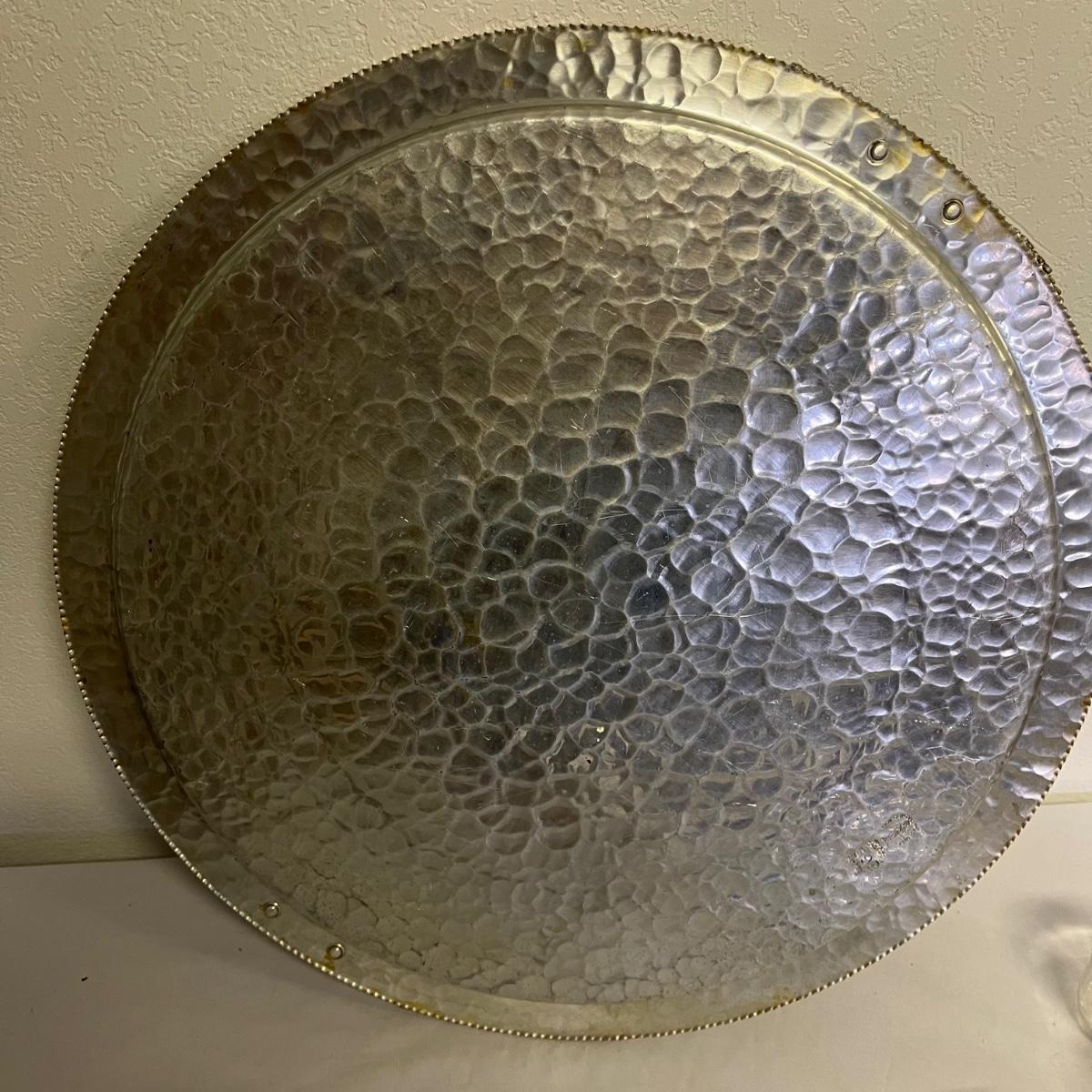 Lot contains a metal hand wrought serving tray, Ausie Blue Coasters, set of utensils that is missing one spoon, seven mini blackboard signs, over fifteen glasses and more. Serving tray measures 18.5”D.