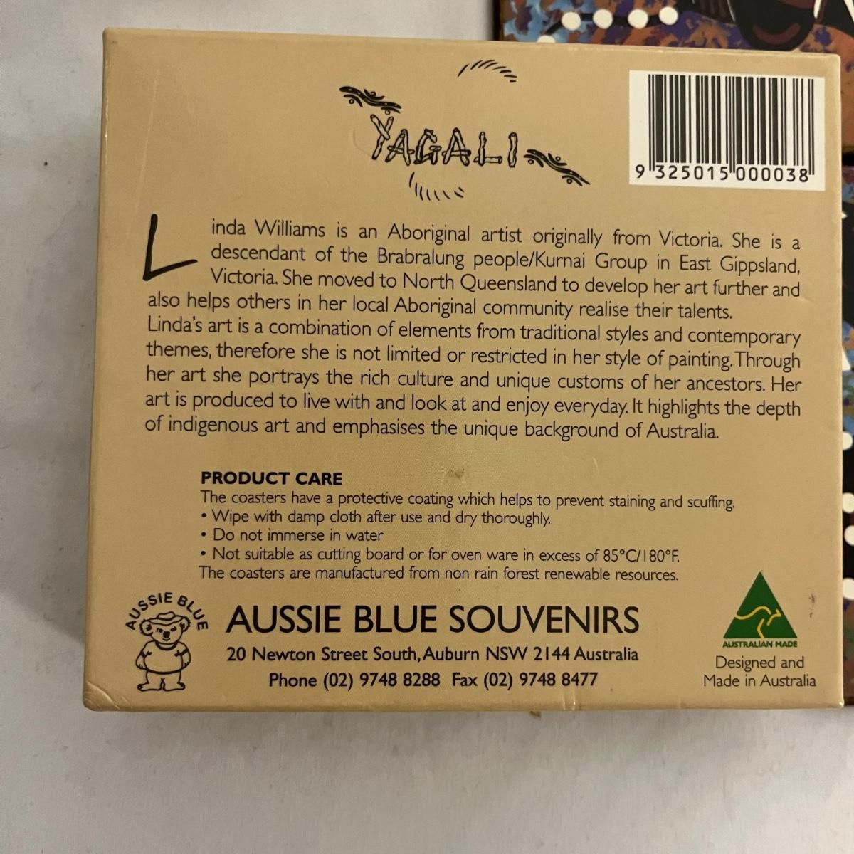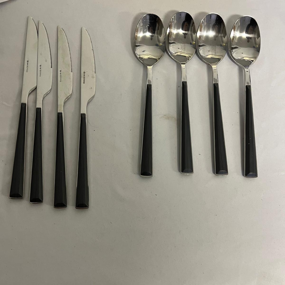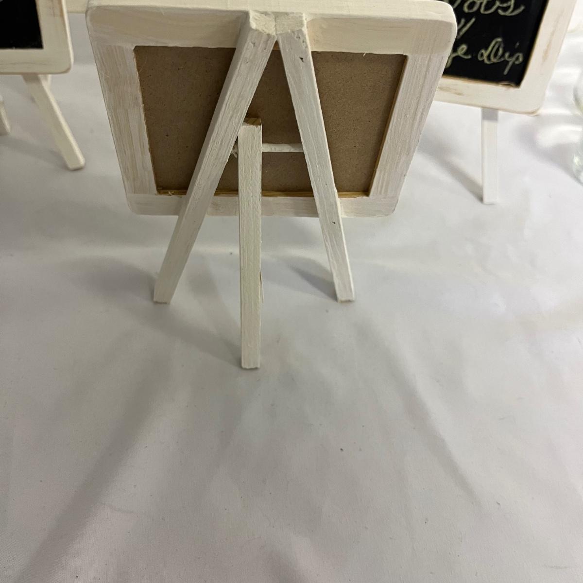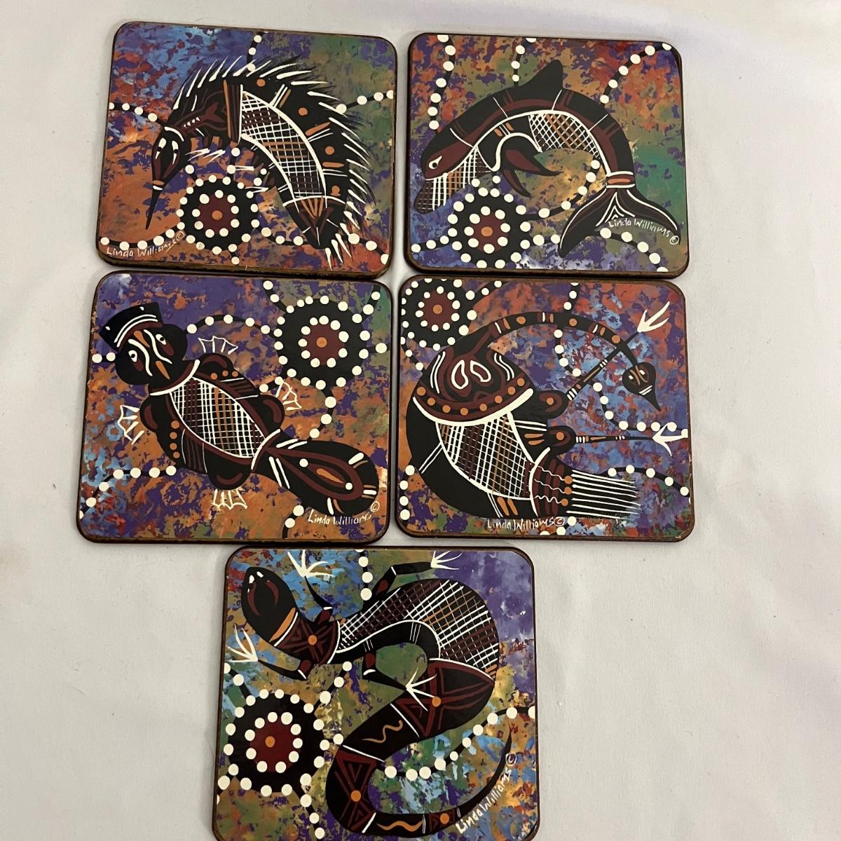 Lot contains a metal hand wrought serving tray, Ausie Blue Coasters, set of utensils that is missing one spoon, seven mini blackboard signs, over fifteen glasses and more. Serving tray measures 18.5”D.