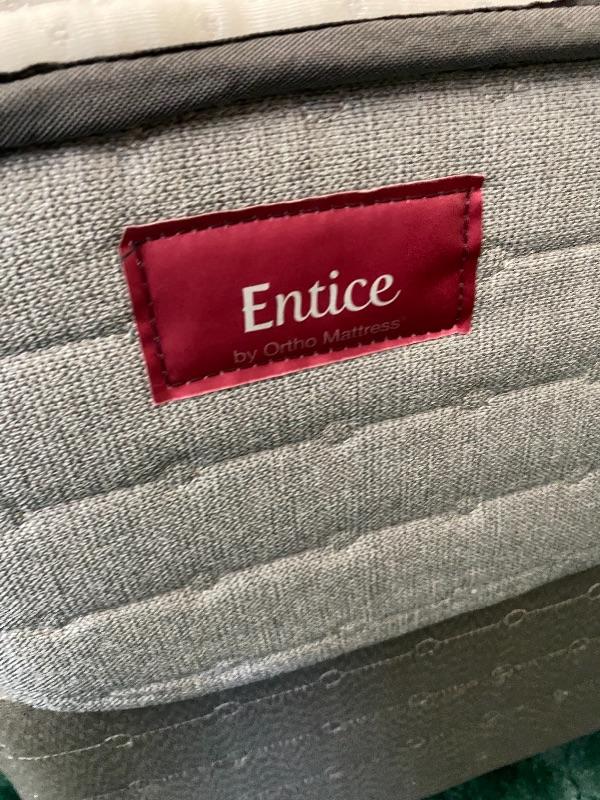 Entice by Ortho Mattress Full size set. Entice is an aromatherapy line designed to enhance romance. Has cute cupids and hearts stitched in to mattress. Looks fairly new