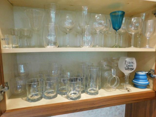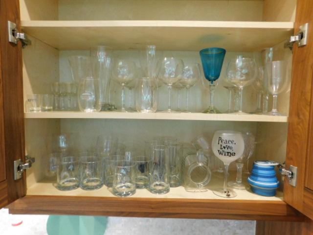 Entire Cabinet Full of Clear Drinking Glasses Including Long Stem Wine Glasses