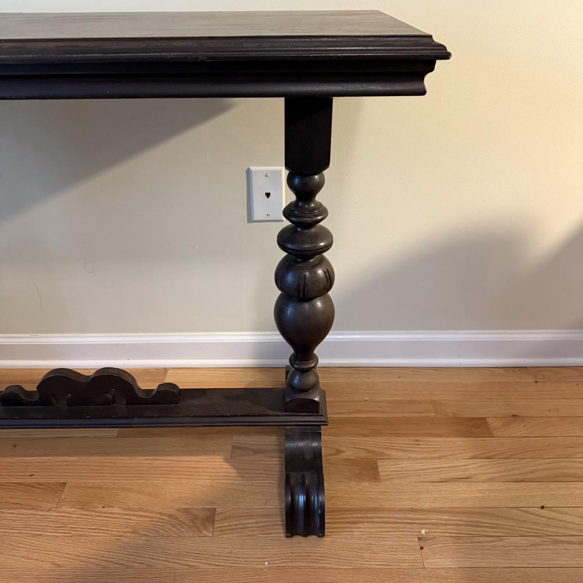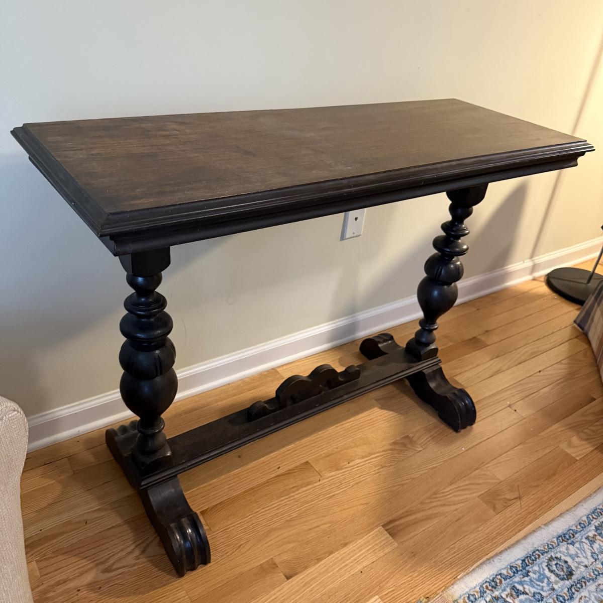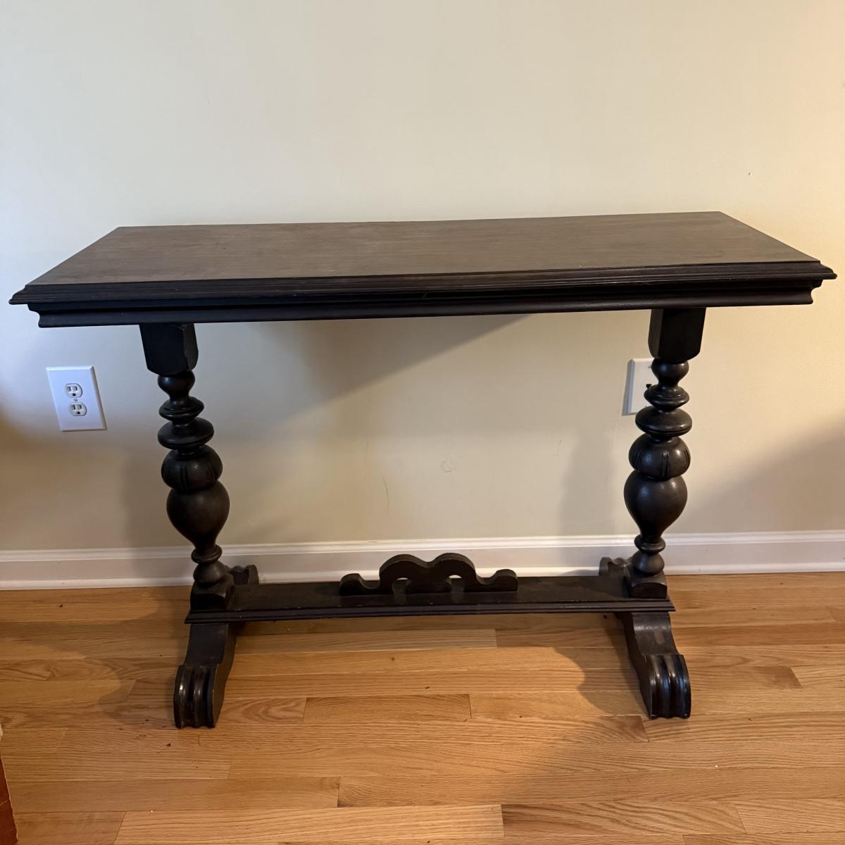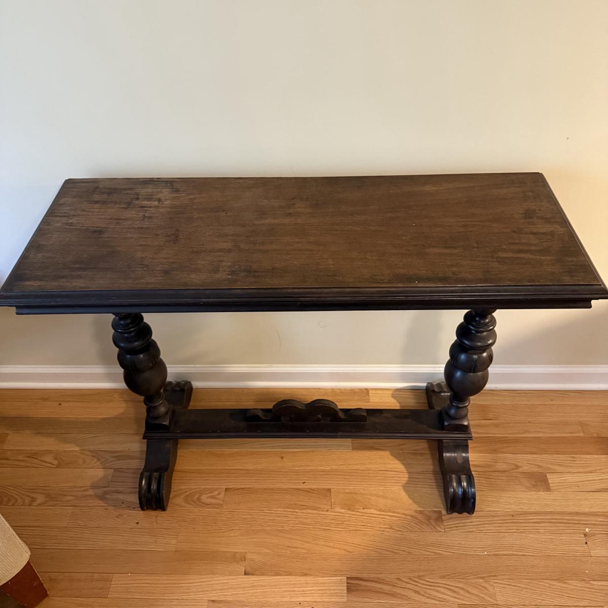 This lot contains a lovely wooden entry table with what appears to be a stunning mahogany finish. It measures 42” x 16” x 30”H. It has some lovely bobble designs on the legs and is fairly sturdy. There are a couple scuffs on the edges of the feet but otherwise it’s in good condition. Local pick up only.