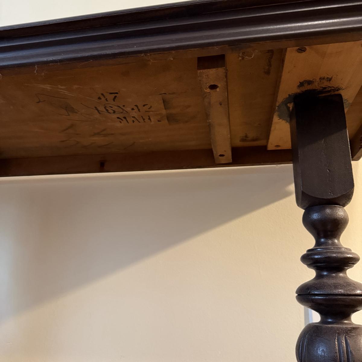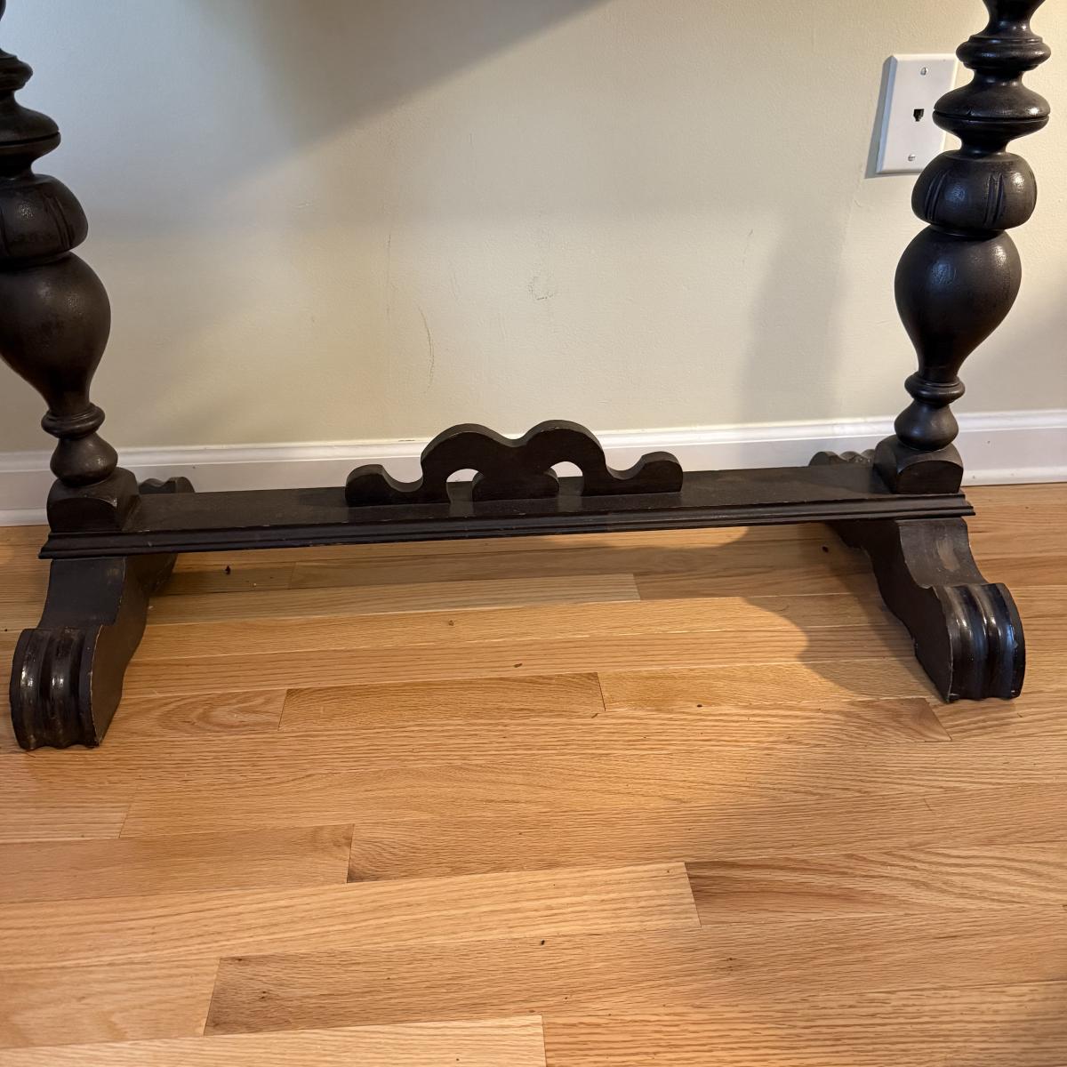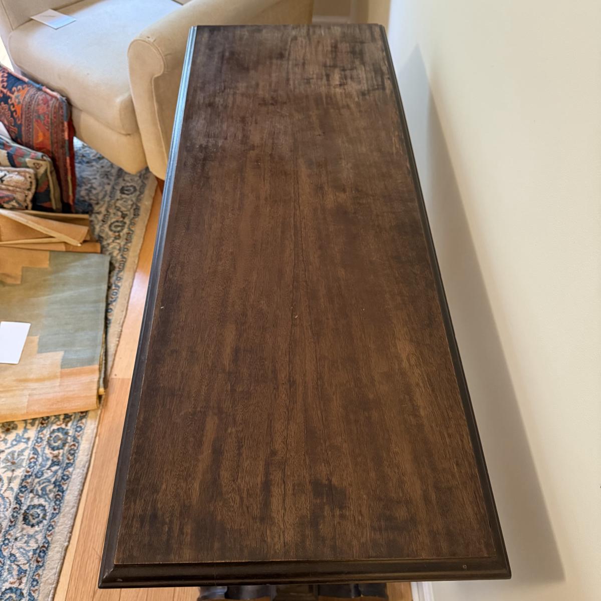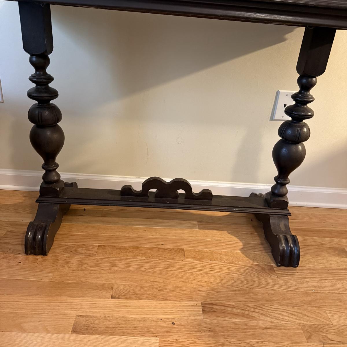 This lot contains a lovely wooden entry table with what appears to be a stunning mahogany finish. It measures 42” x 16” x 30”H. It has some lovely bobble designs on the legs and is fairly sturdy. There are a couple scuffs on the edges of the feet but otherwise it’s in good condition. Local pick up only.