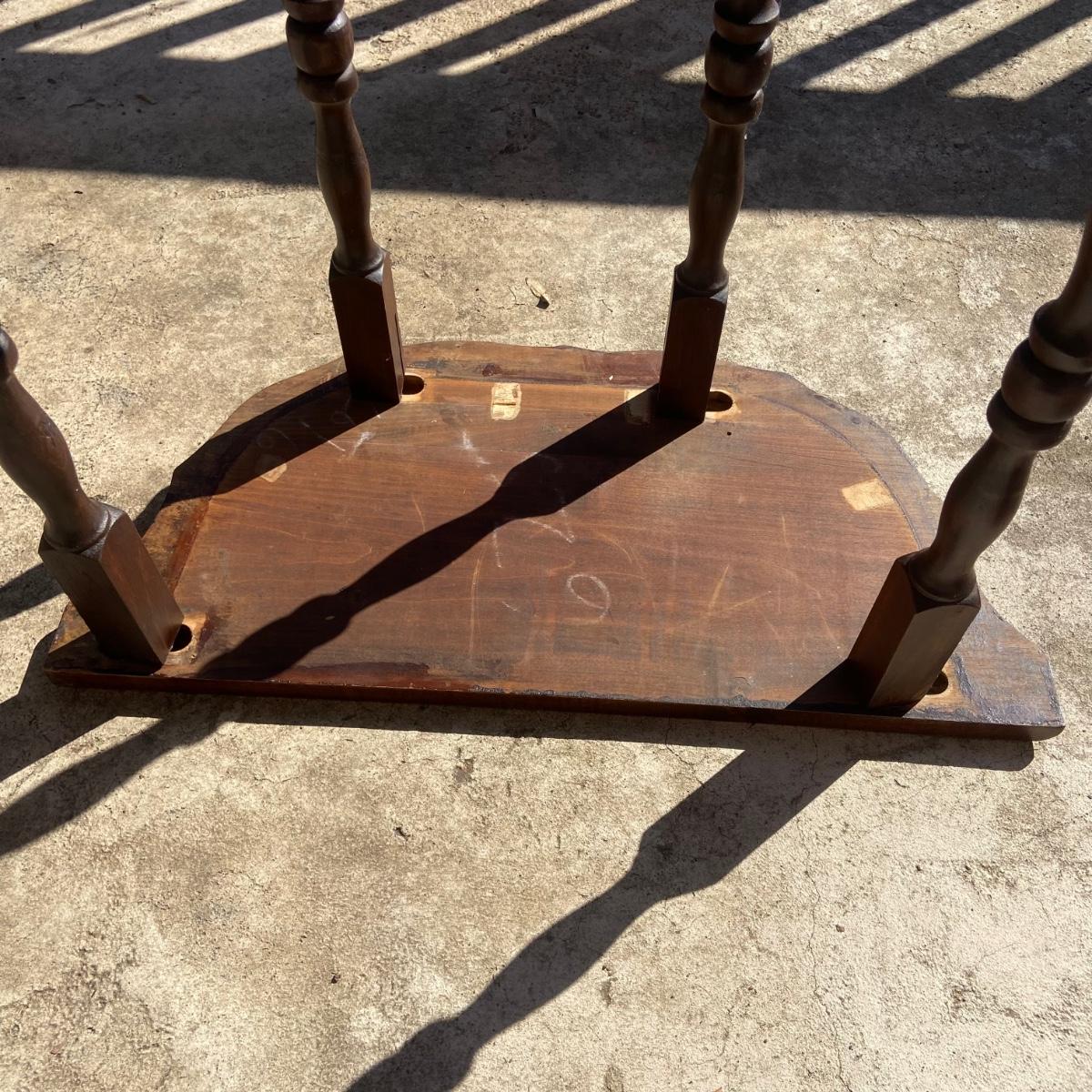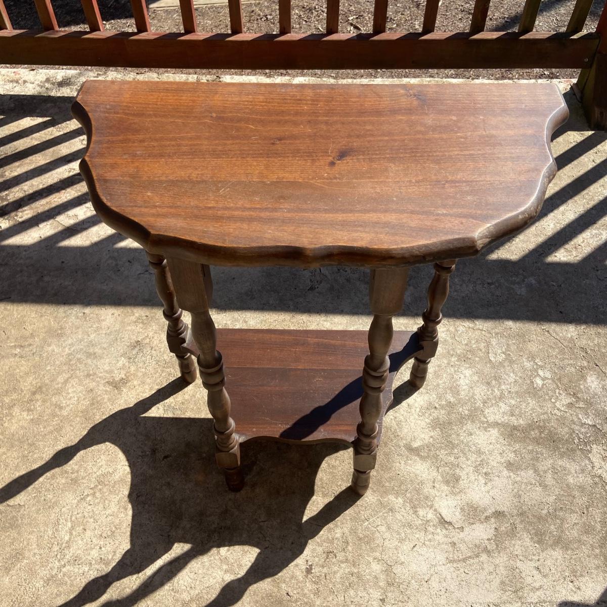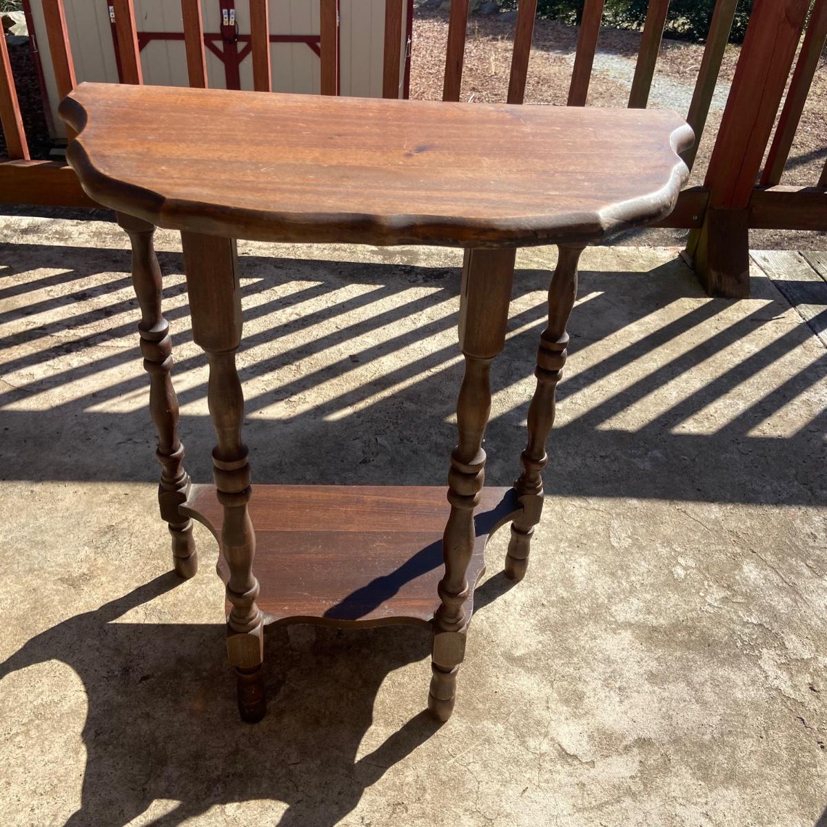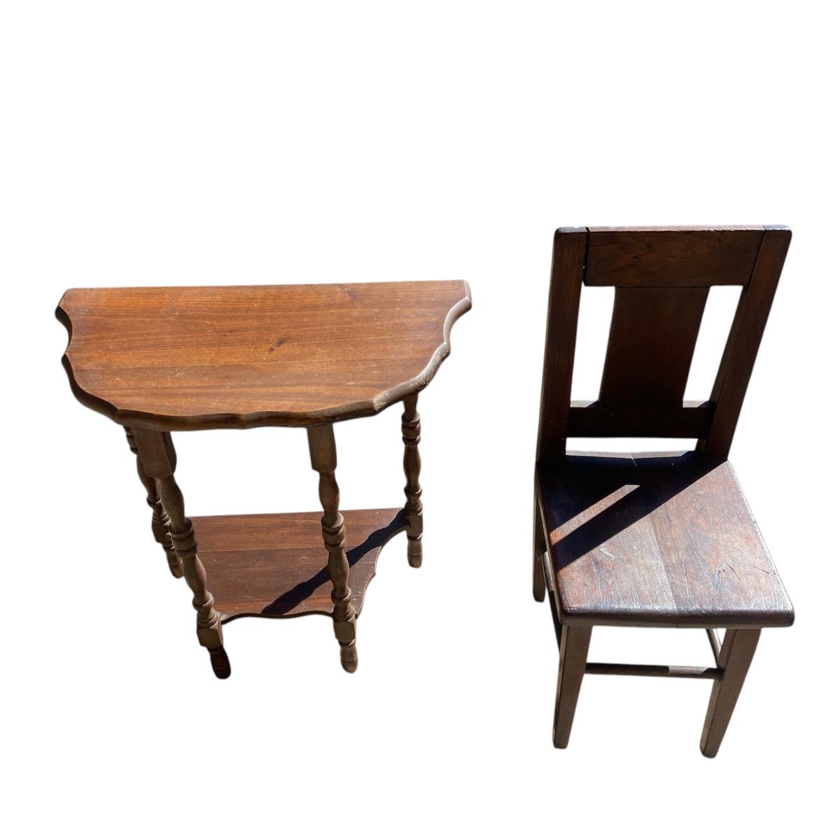 In this lot we have a wooden half moon entry table that measures 23” x 11” x 25”H. Also in this lot is a small wooden chair that measures 12” x 13” x 28.75”H with a seat height 14.5”. There is a big crack down the seat, and a couple dents. See pictures for details. Local pickup only.