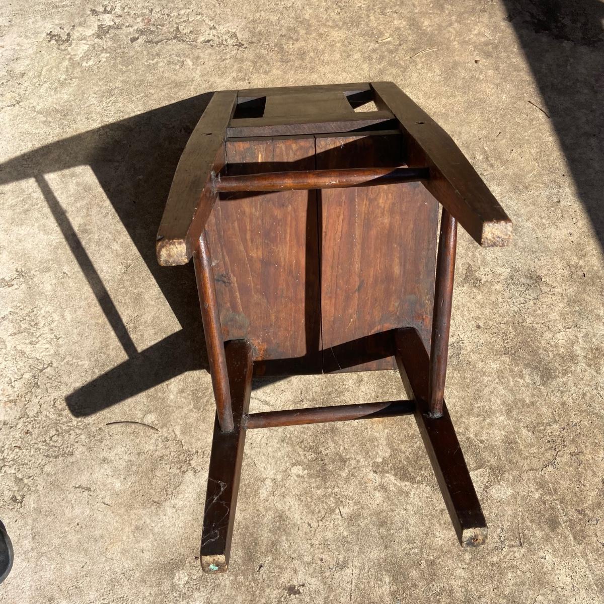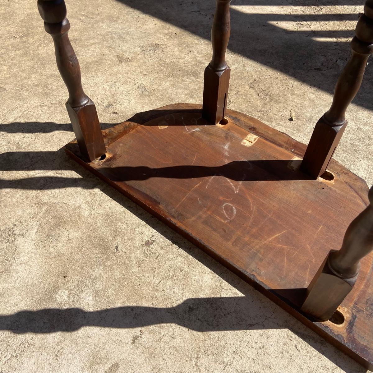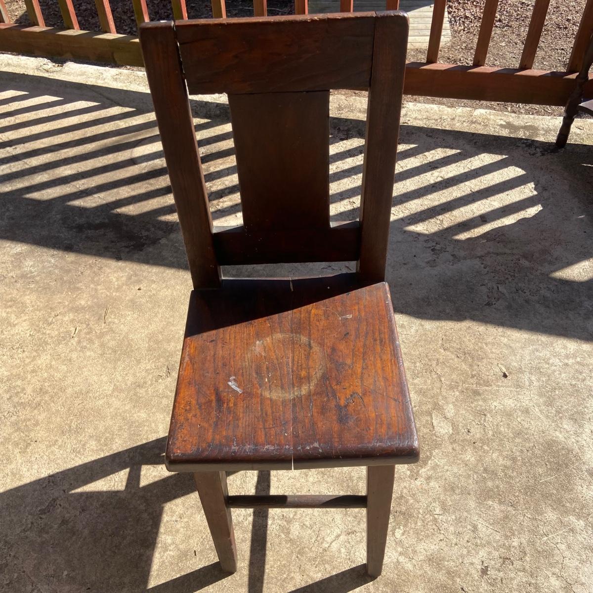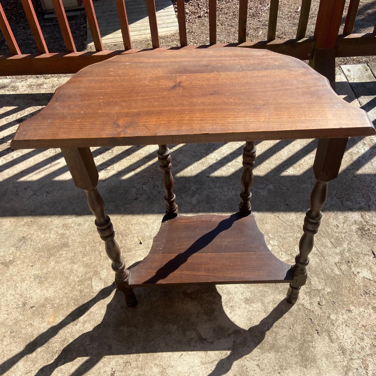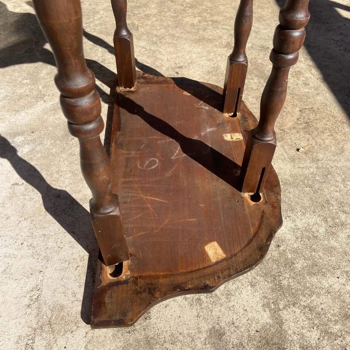 In this lot we have a wooden half moon entry table that measures 23” x 11” x 25”H. Also in this lot is a small wooden chair that measures 12” x 13” x 28.75”H with a seat height 14.5”. There is a big crack down the seat, and a couple dents. See pictures for details. Local pickup only.