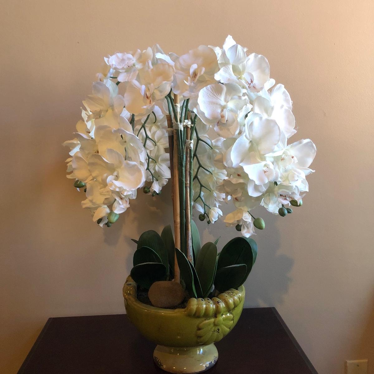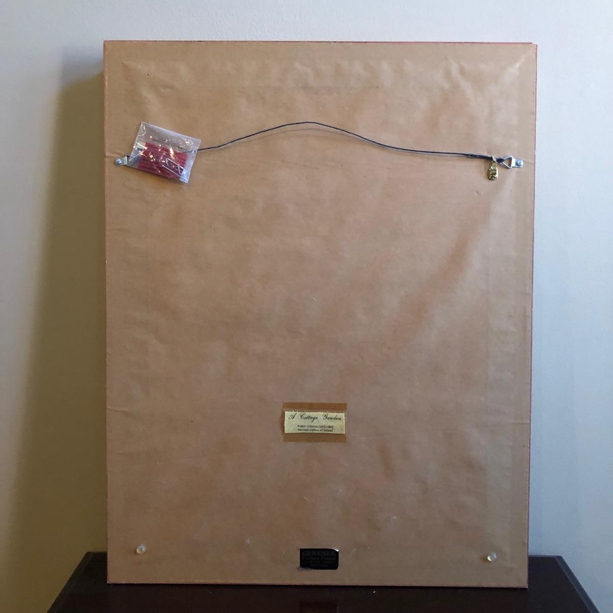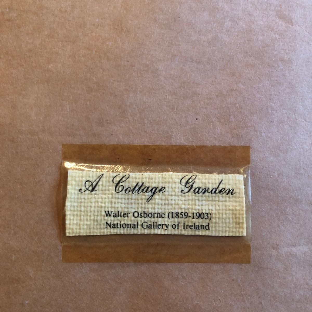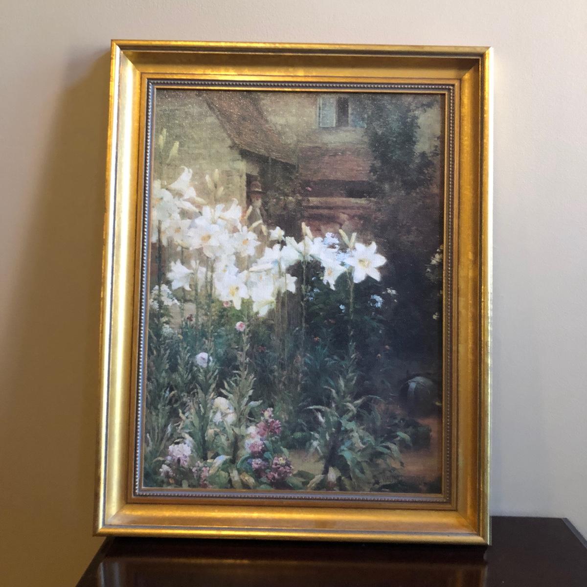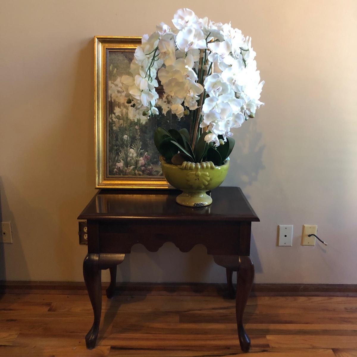Lot includes wooden side table with one dovetailed drawer, faux orchids in a ceramic pot and a framed print by Walter Osborne titled” A Cottage Garden”. Table measures 18” x 27” x 24” and frame measures 21.5” x 27.5”.