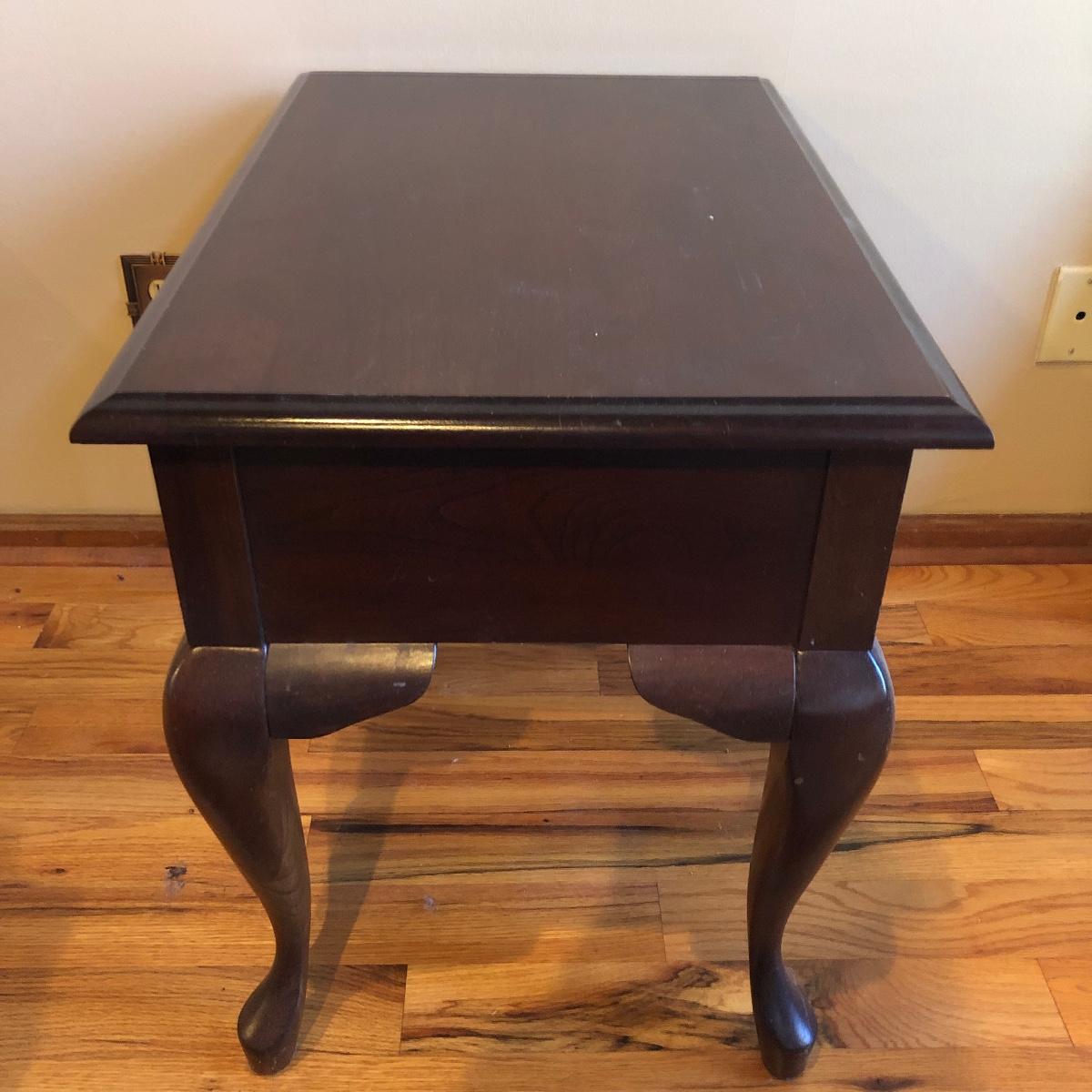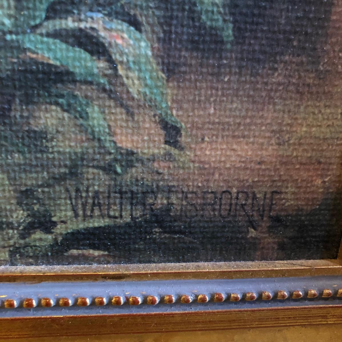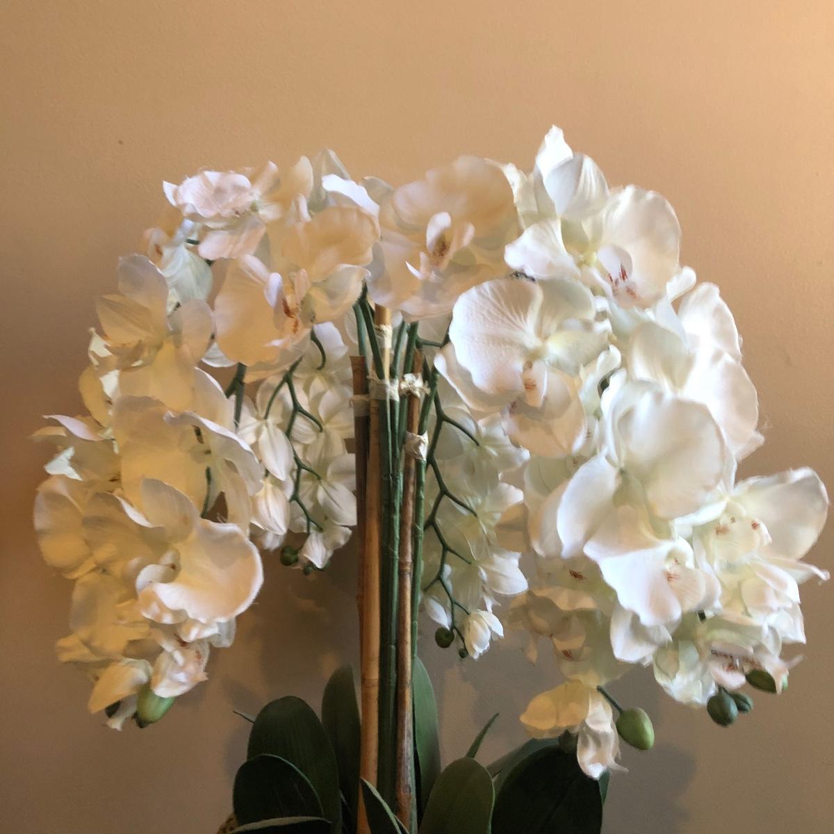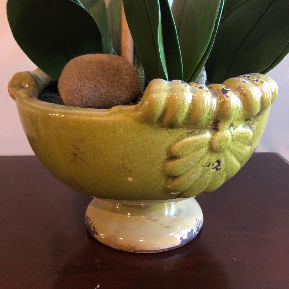 Lot includes wooden side table with one dovetailed drawer, faux orchids in a ceramic pot and a framed print by Walter Osborne titled” A Cottage Garden”. Table measures 18” x 27” x 24” and frame measures 21.5” x 27.5”.