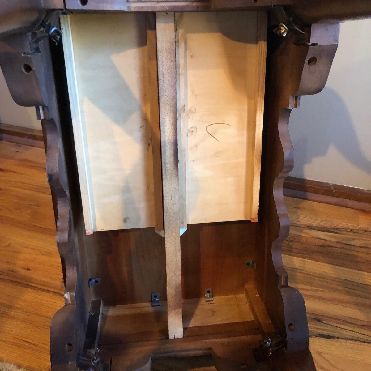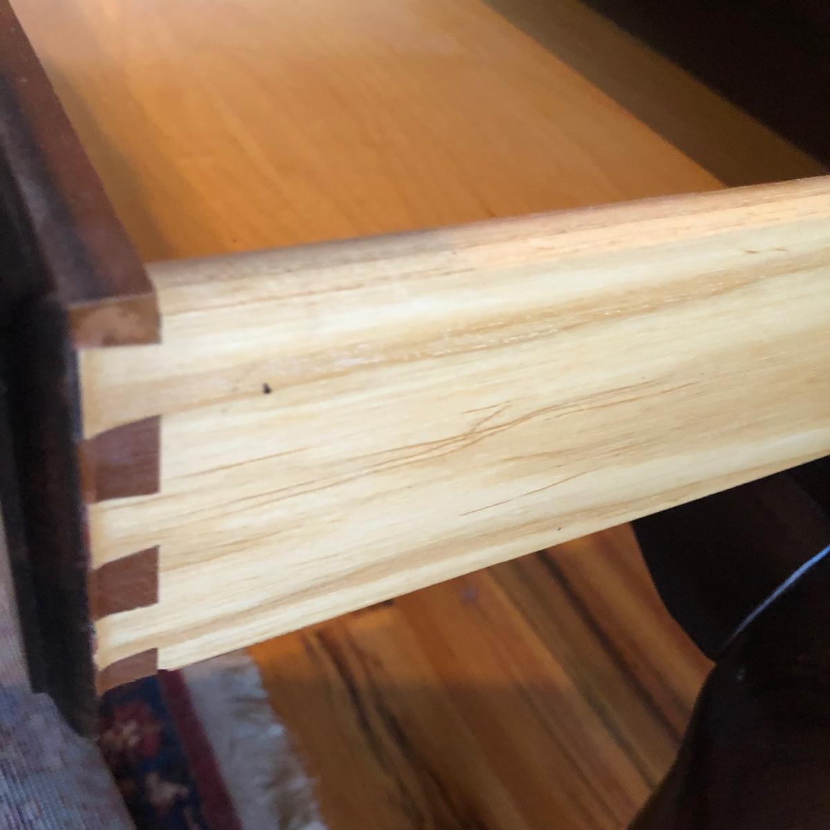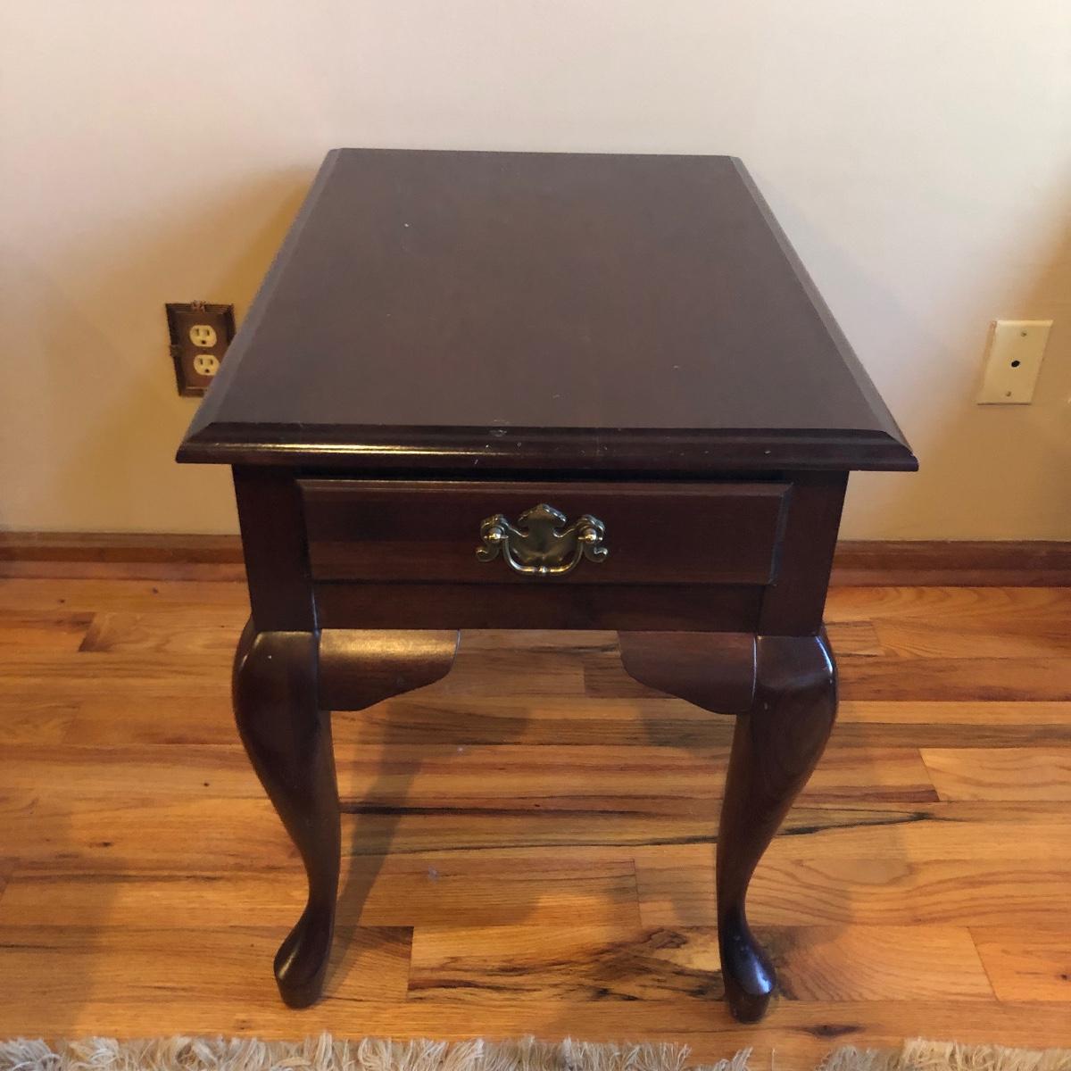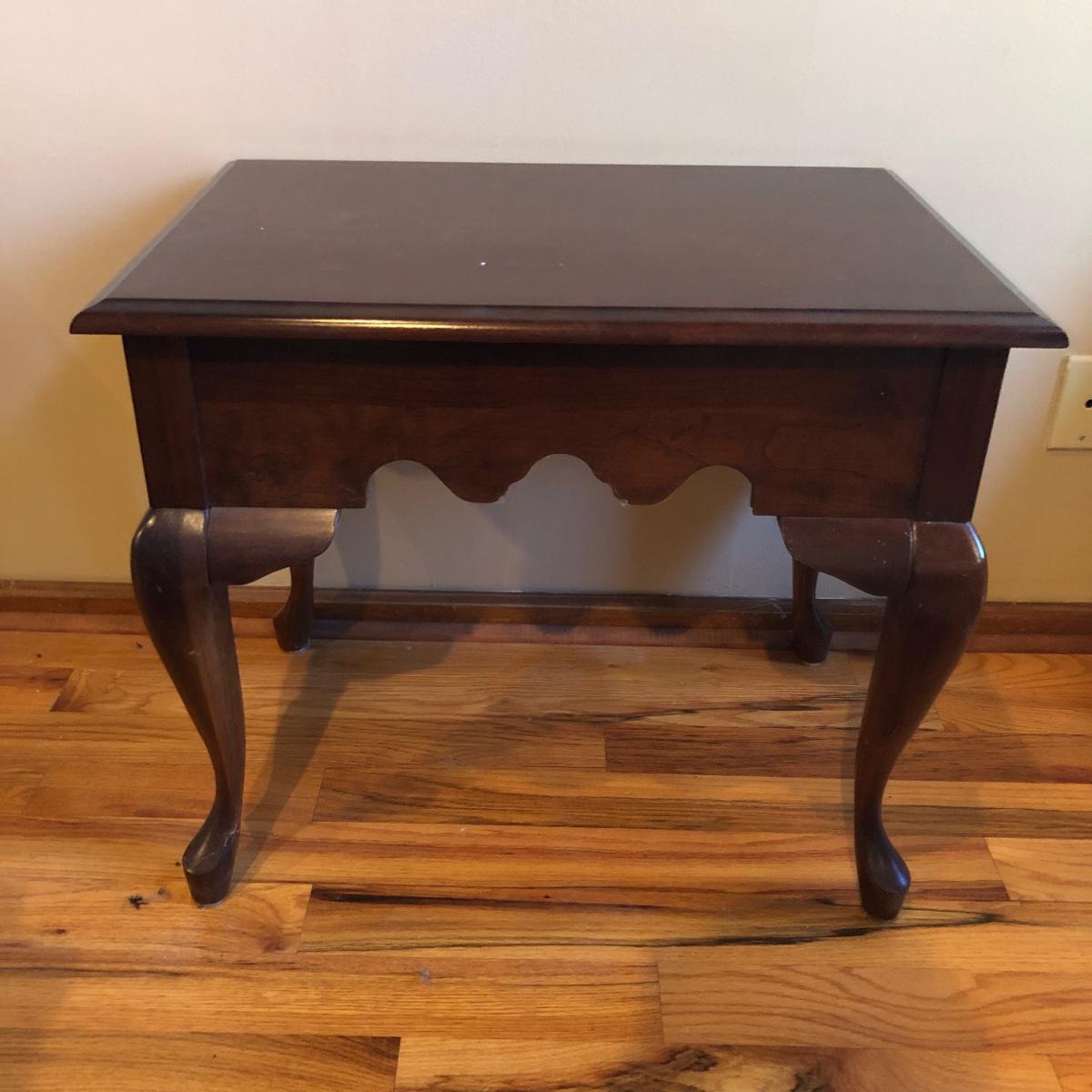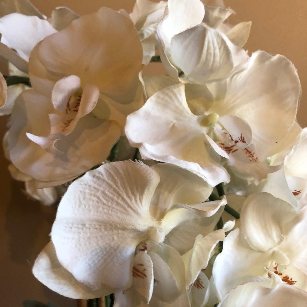 Lot includes wooden side table with one dovetailed drawer, faux orchids in a ceramic pot and a framed print by Walter Osborne titled” A Cottage Garden”. Table measures 18” x 27” x 24” and frame measures 21.5” x 27.5”.