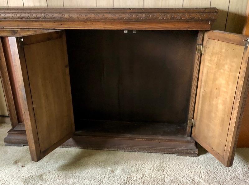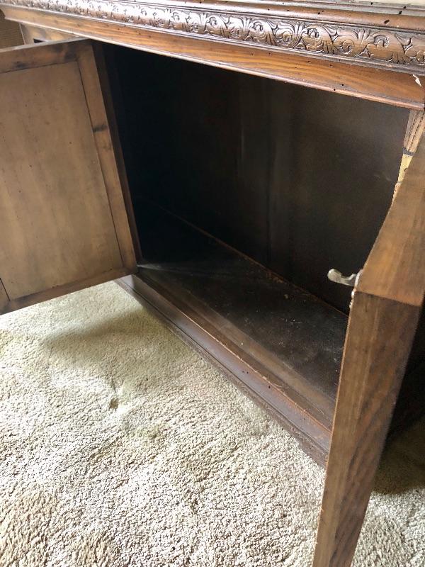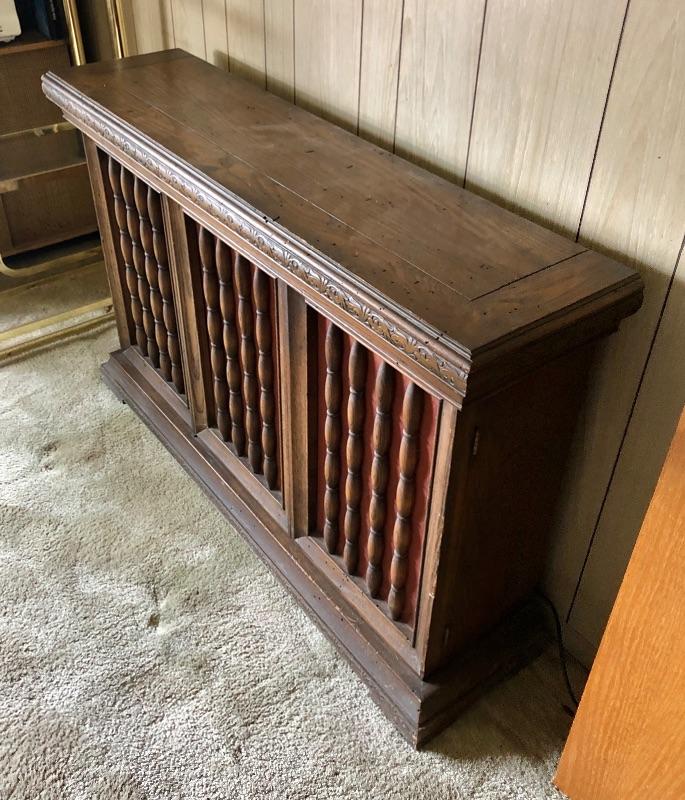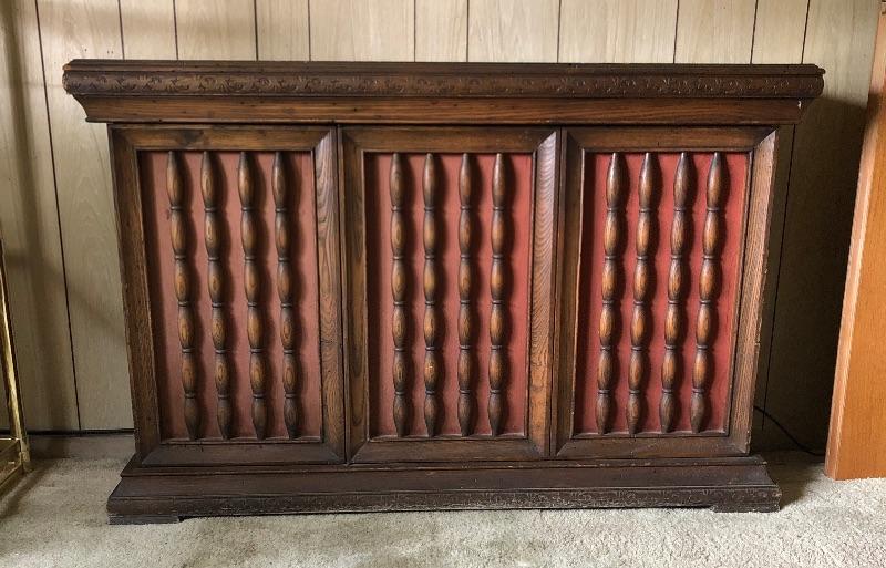 Wood entryway narrow cabinet, has two doors. Orange fabric accents.