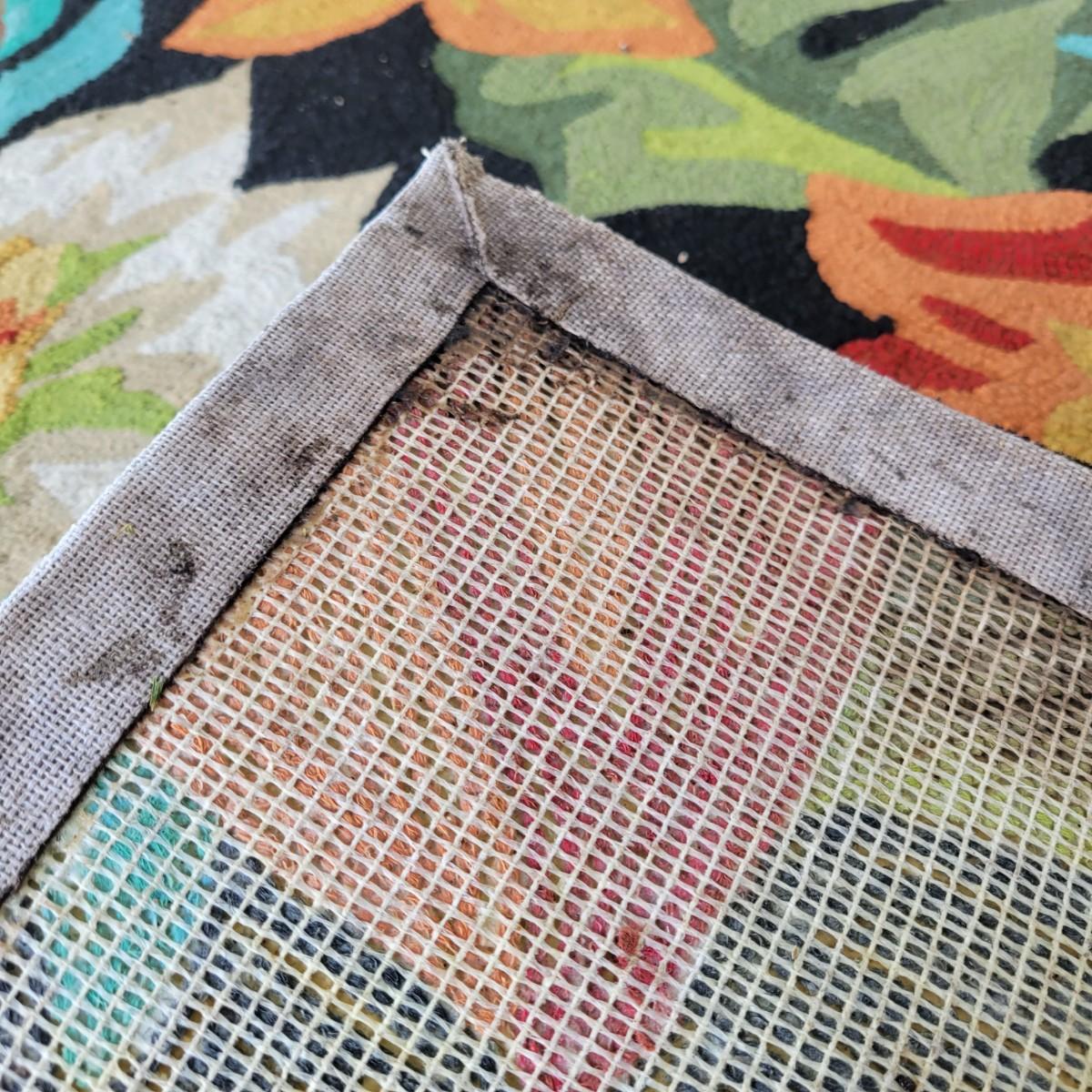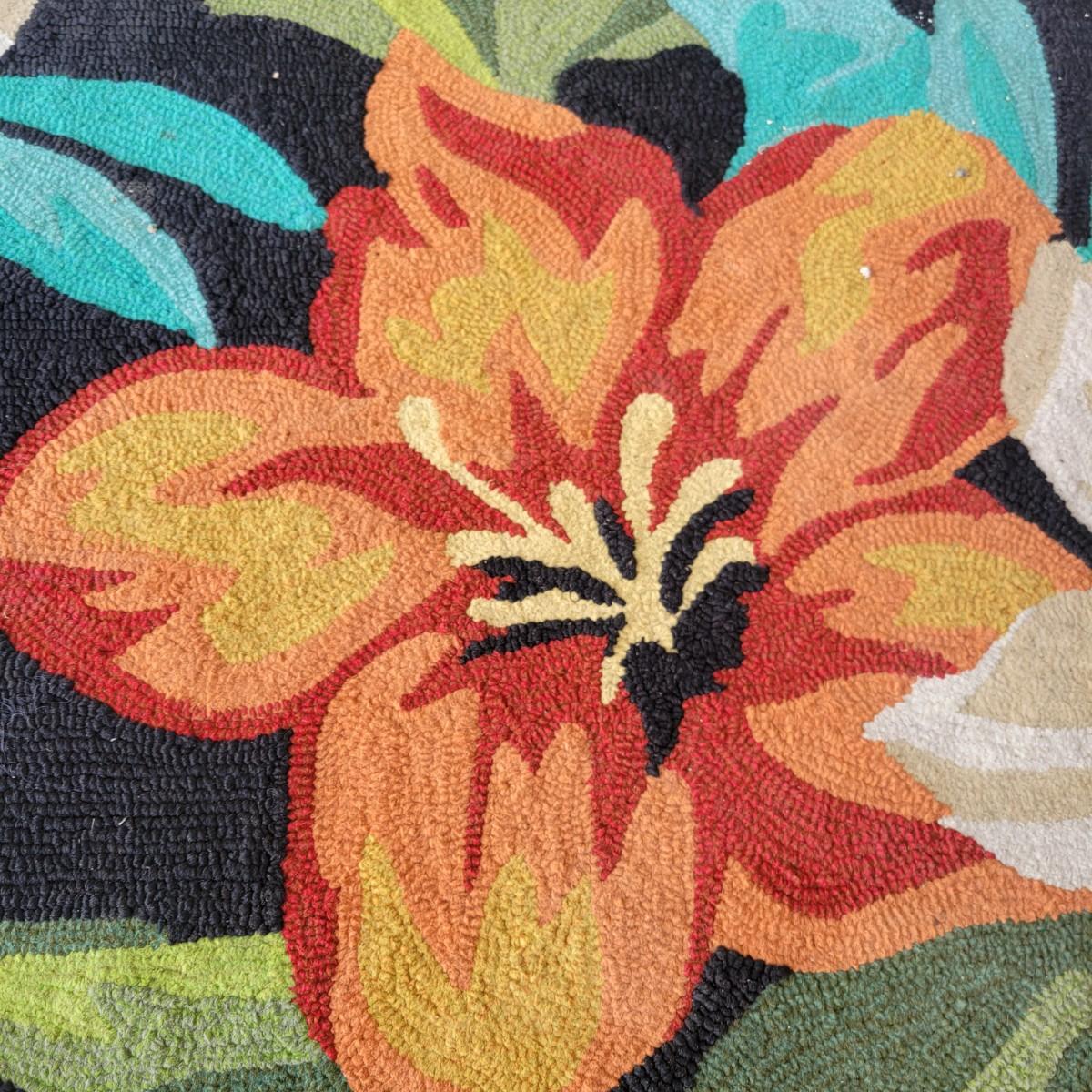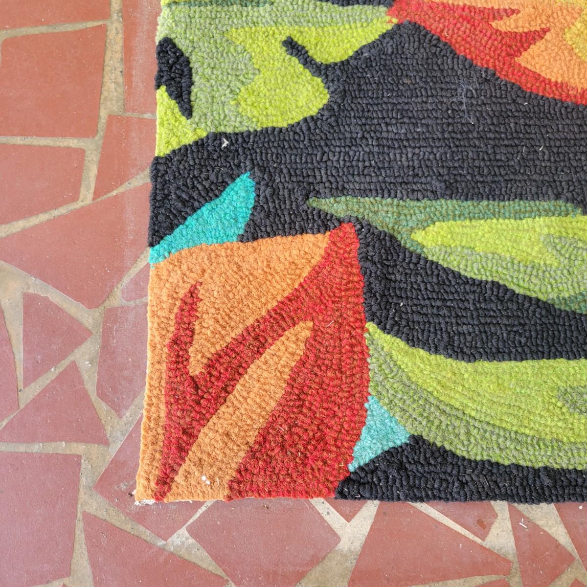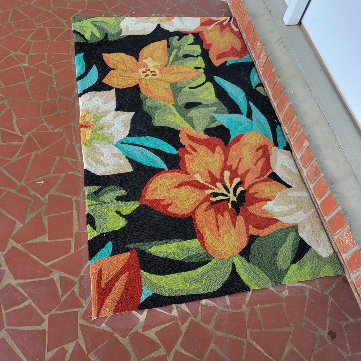 A colorful outdoor entryway rug that has a floral pattern. It measures approximately 4'6" x 2'8". There is some mildew on the back from outdoor exposure. Shipping available.