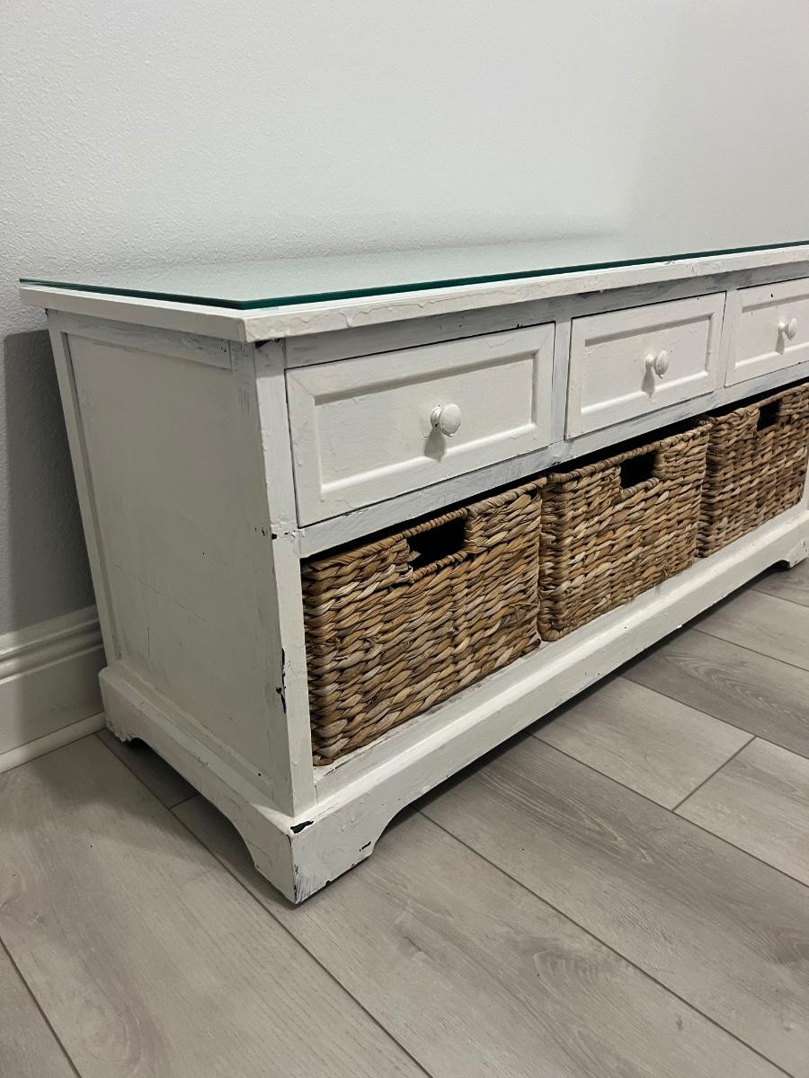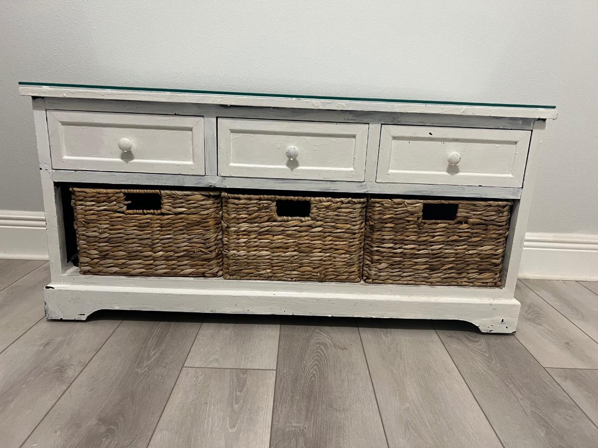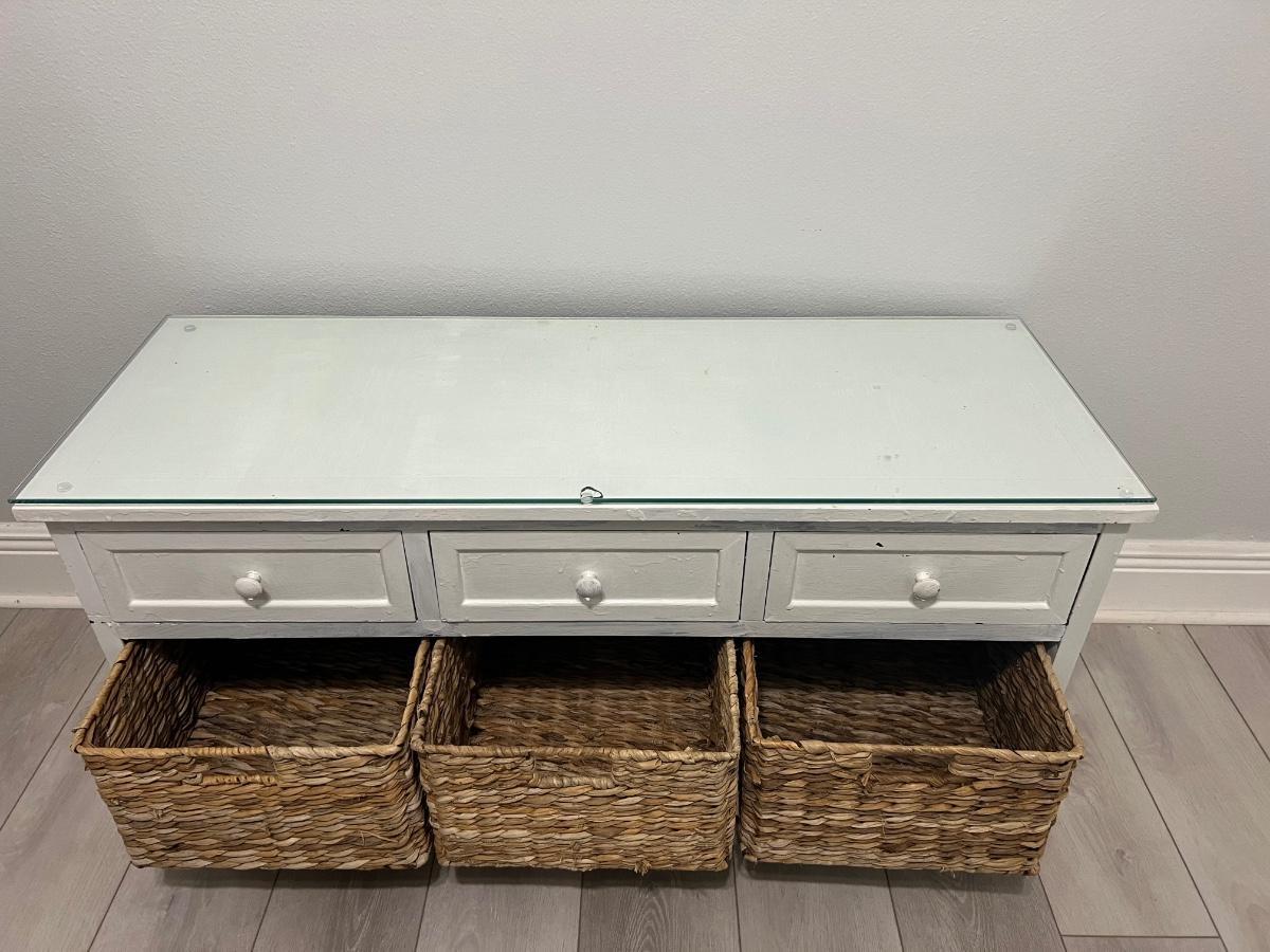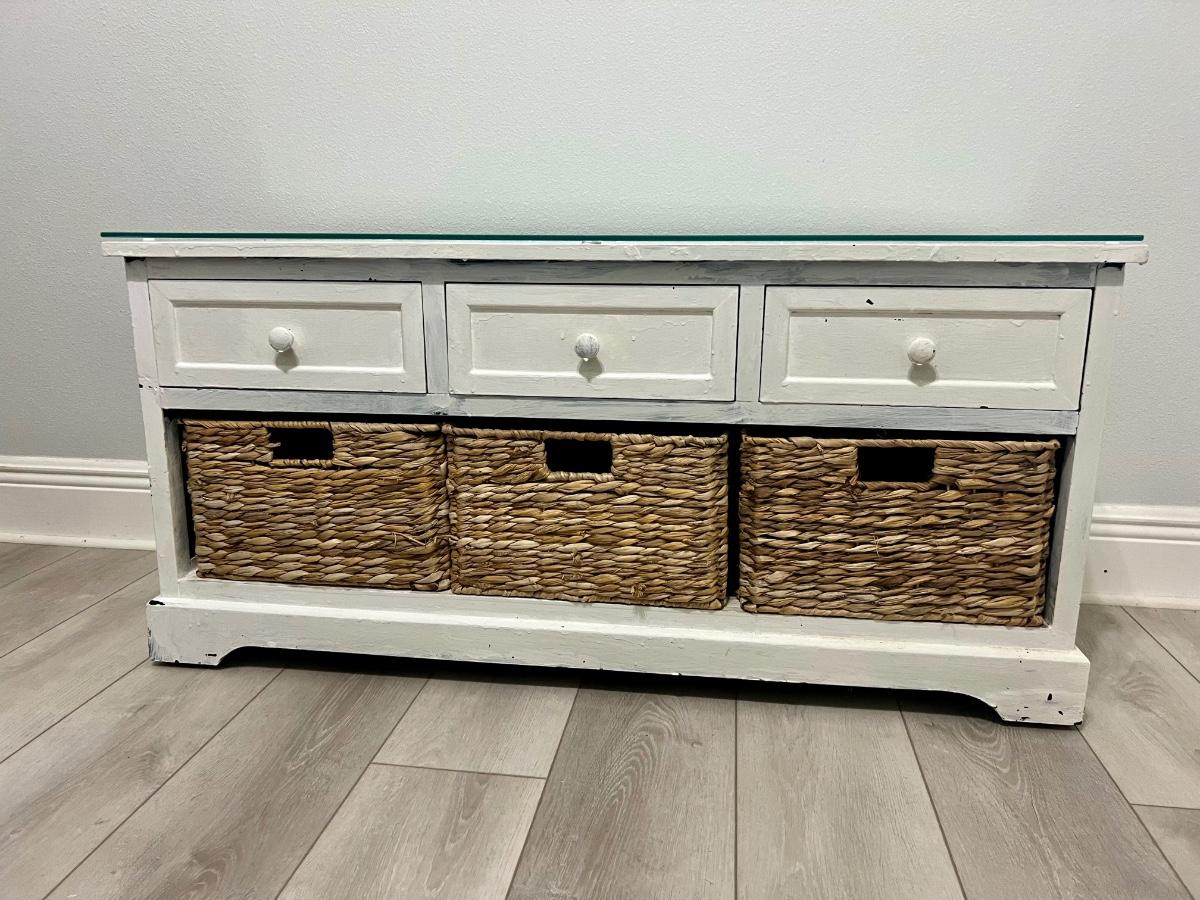 This wooden storage bench has 3 baskets and 3 drawers. Top also has a piece of glass for protection. Measures 20 inches tall, 42 inches wide and 15 1/2 inches deep. This piece was originally black but partially painted white. See pictures for condition.