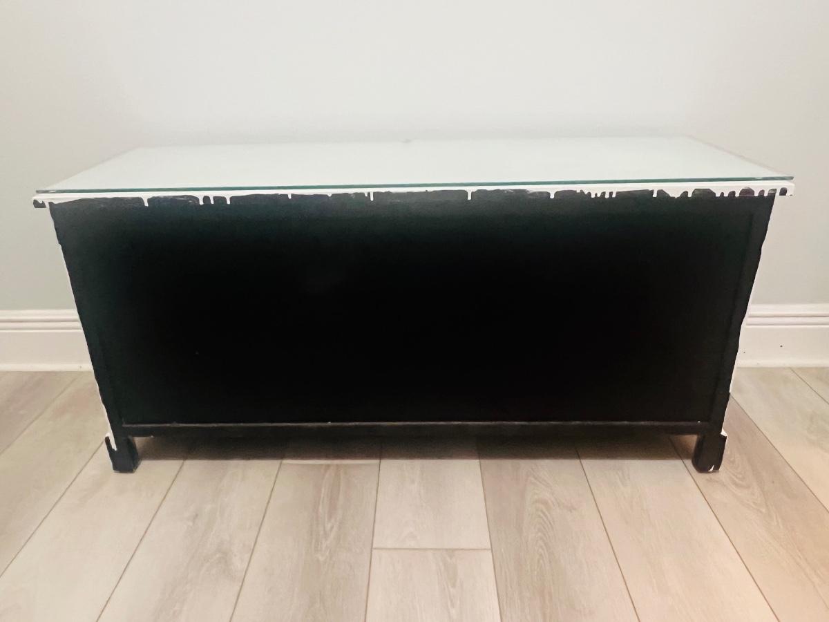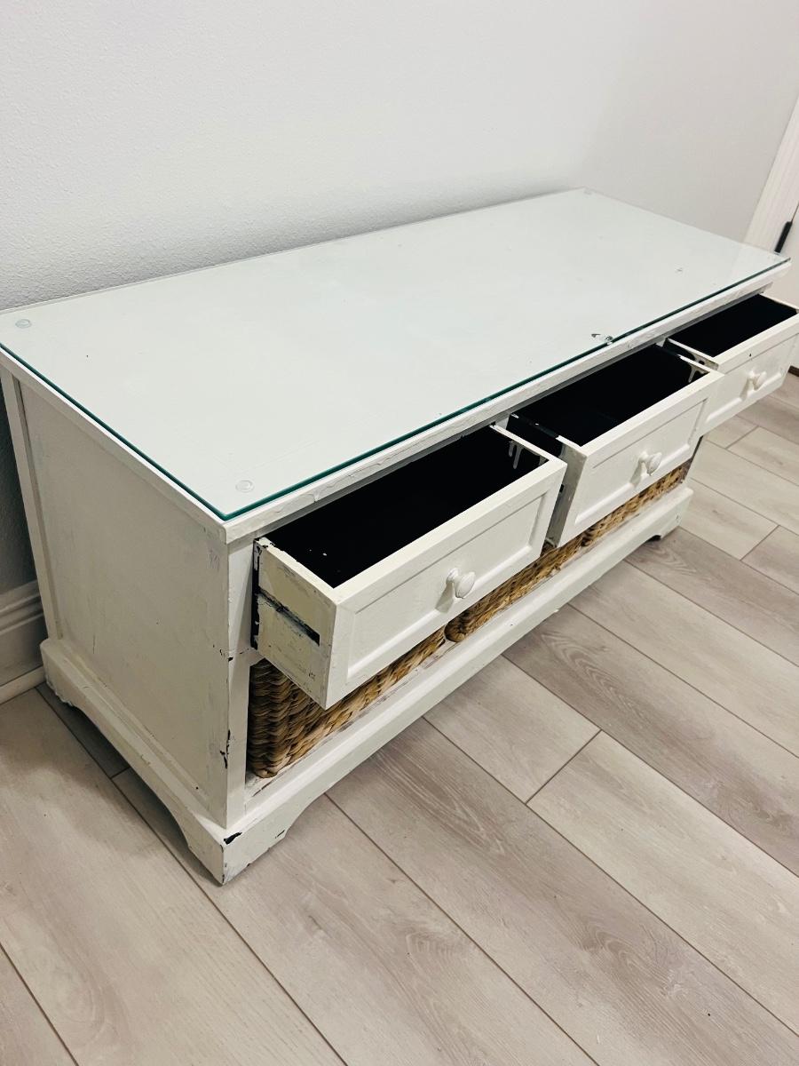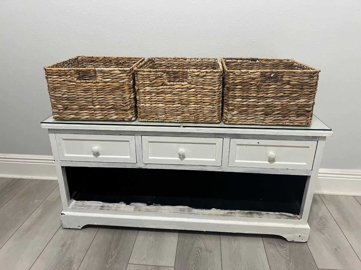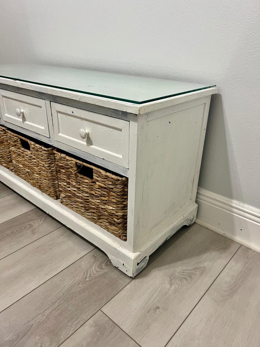 This wooden storage bench has 3 baskets and 3 drawers. Top also has a piece of glass for protection. Measures 20 inches tall, 42 inches wide and 15 1/2 inches deep. This piece was originally black but partially painted white. See pictures for condition.