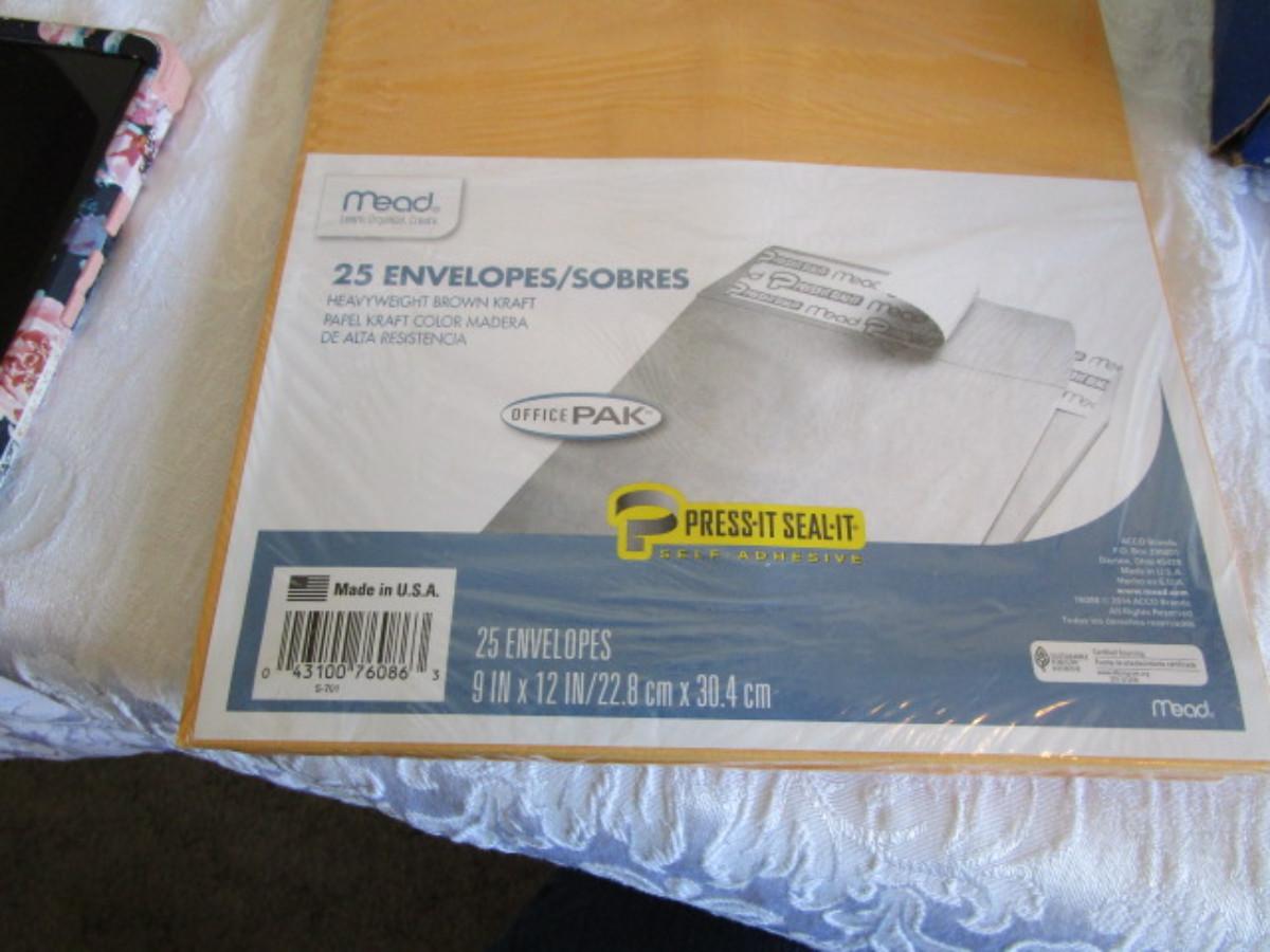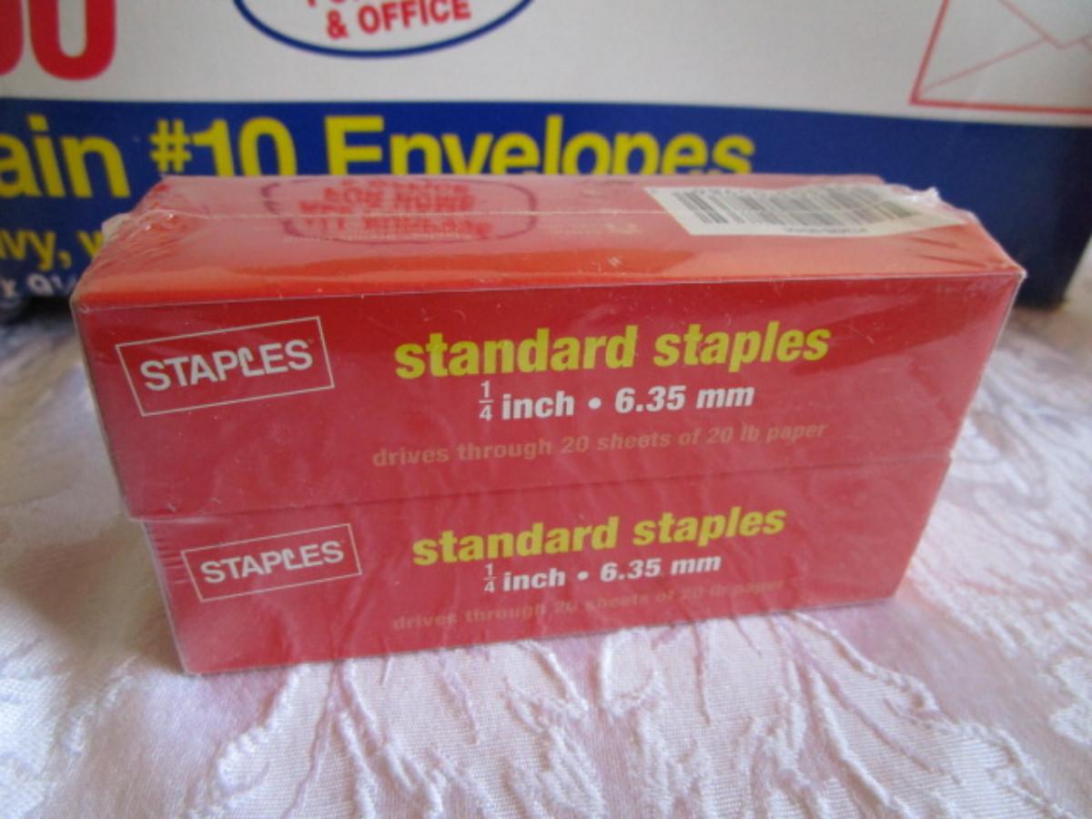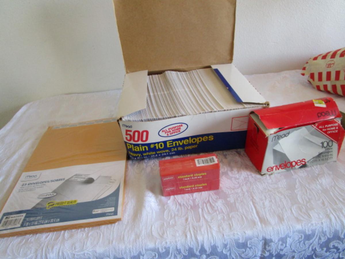 Box of #10 envelopes almost full, letter size envelopes, 2 boxes of staples are new in package, 25 heavy duty craft envelopes 9" x 12" are new in box - G