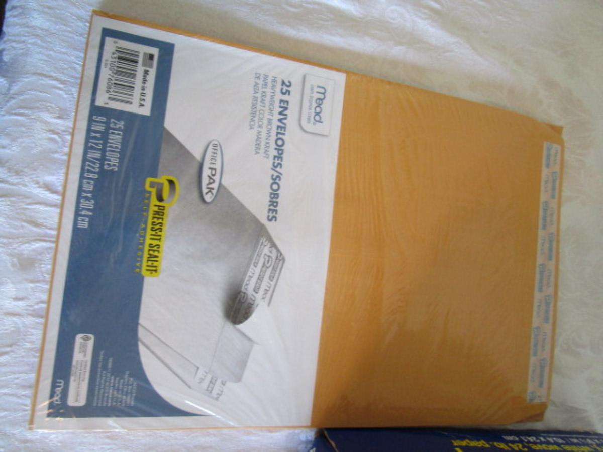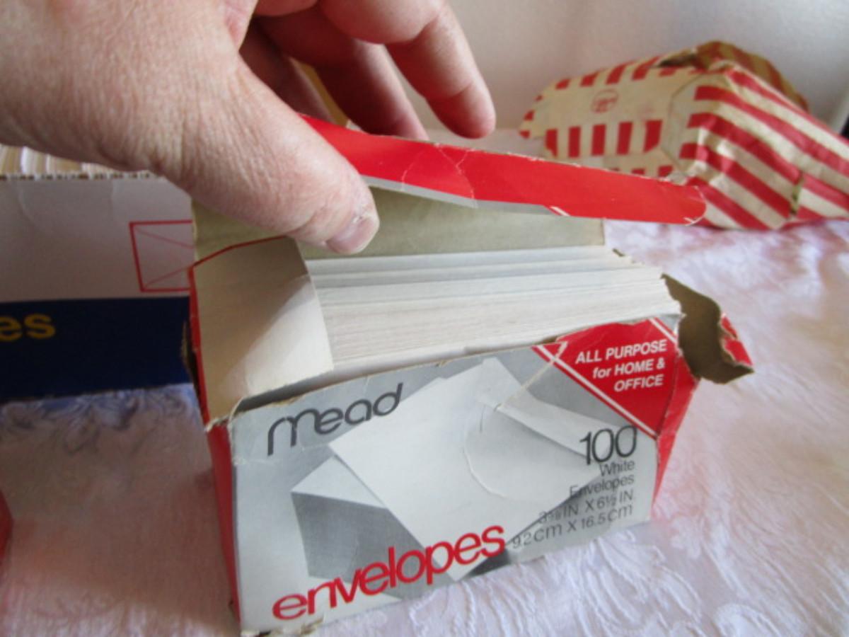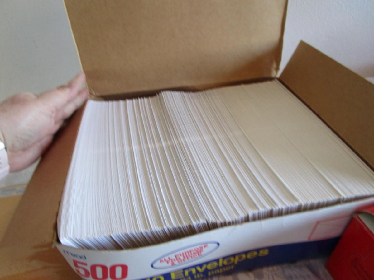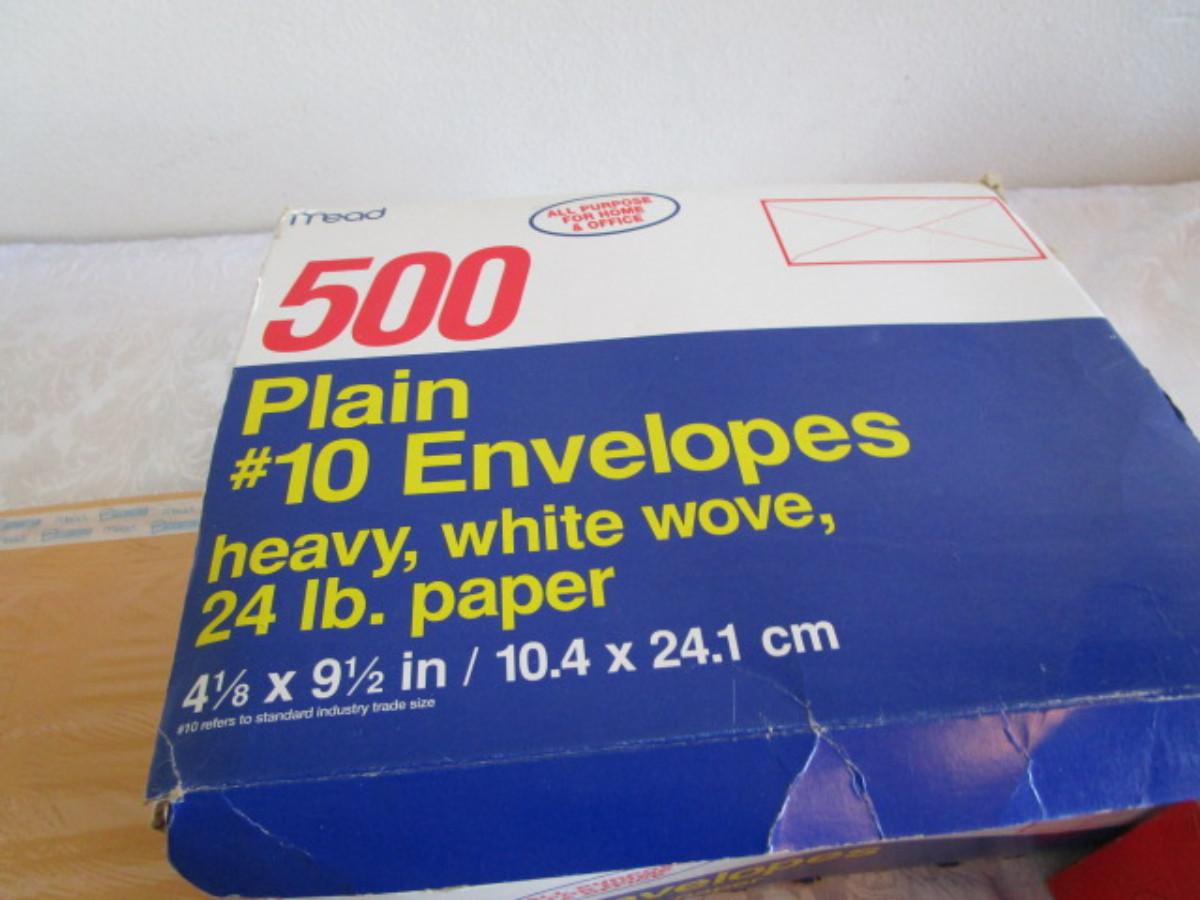 Box of #10 envelopes almost full, letter size envelopes, 2 boxes of staples are new in package, 25 heavy duty craft envelopes 9" x 12" are new in box - G