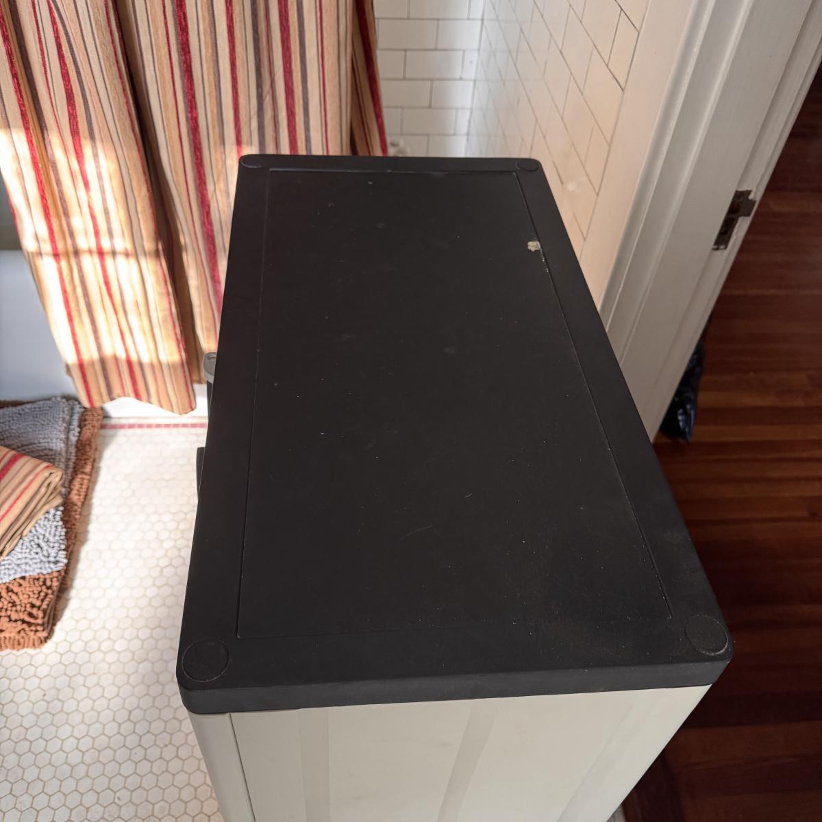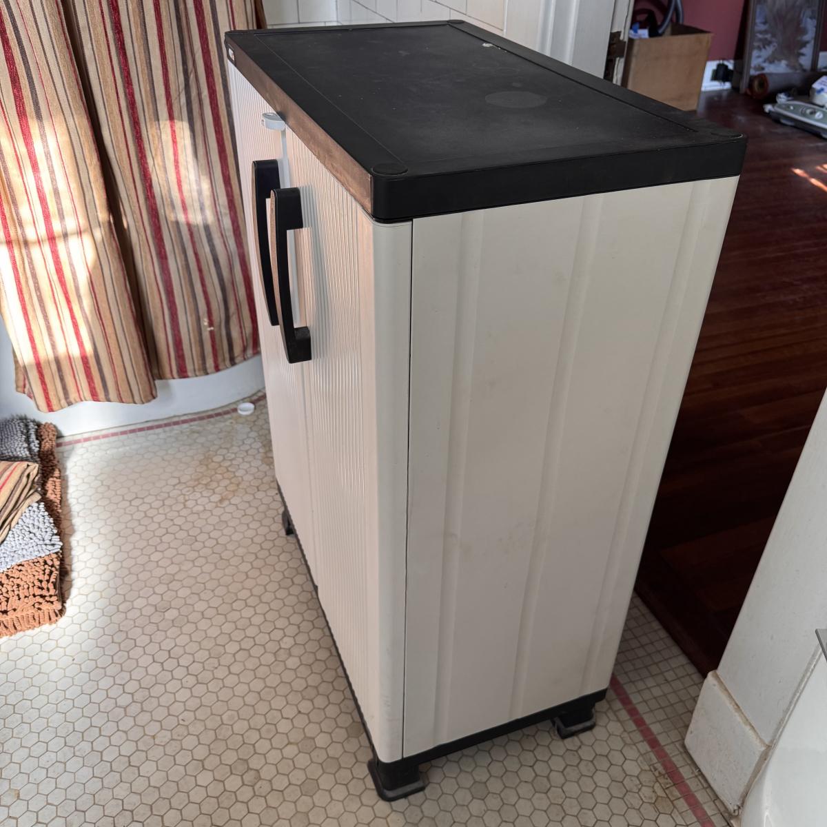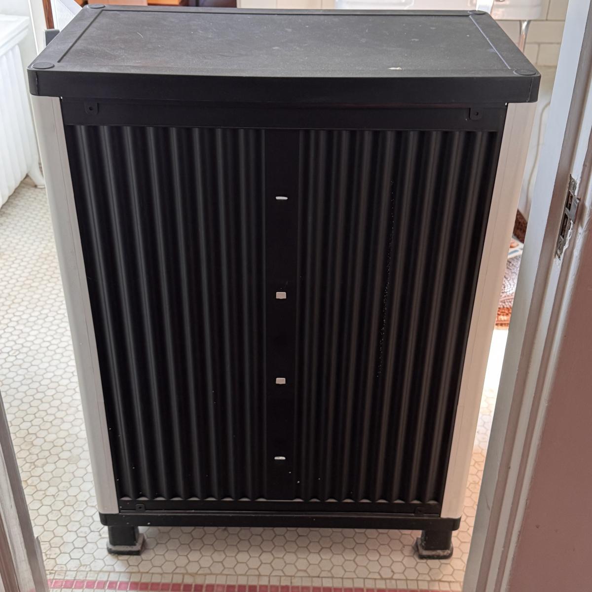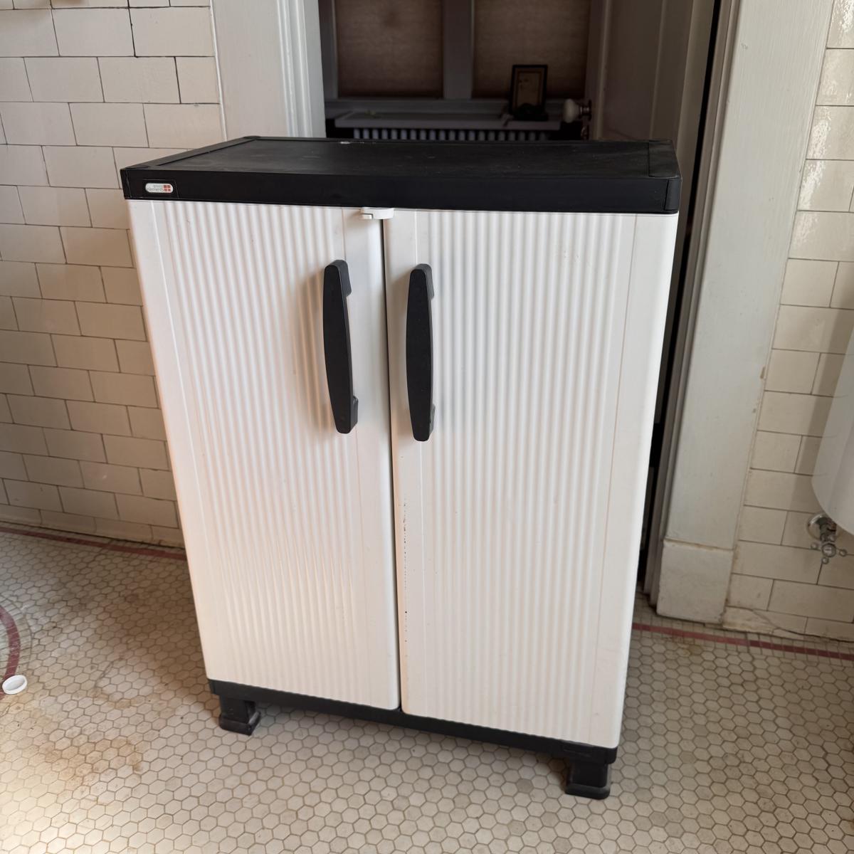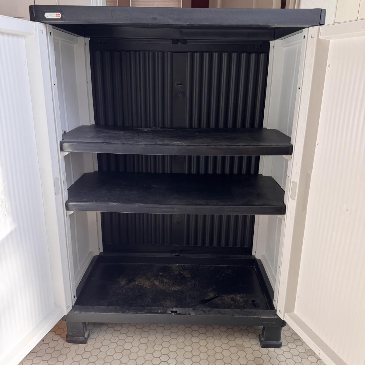 Lot includes one Enviro Elements plastic storage cabinet that 27” x 15” x 37”H. It has three shelves on the inside, with two appearing to be adjustable. Local pickup only.