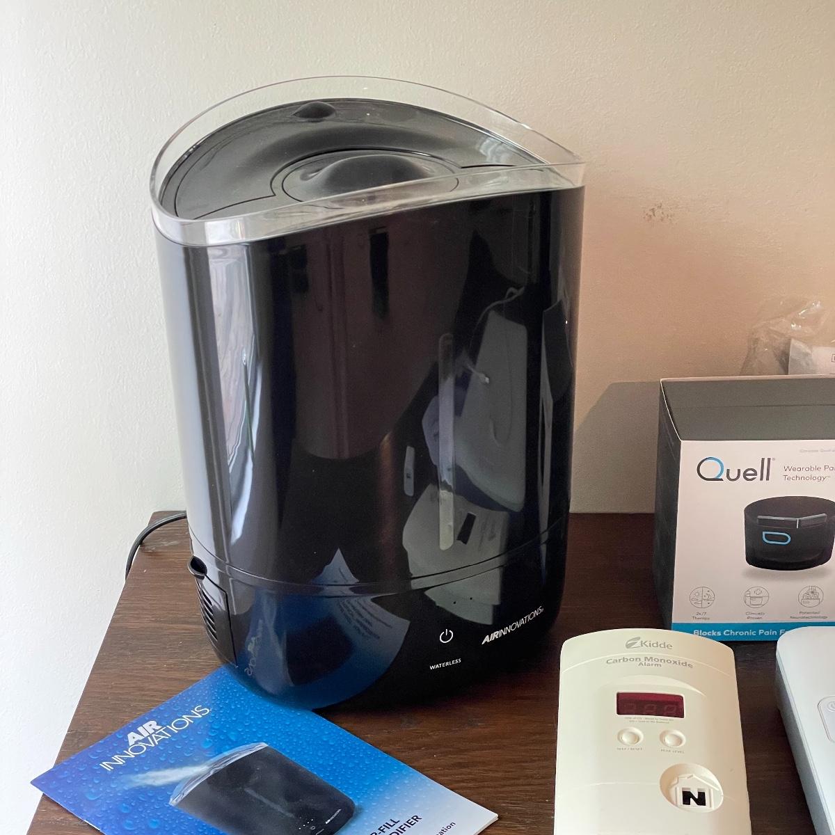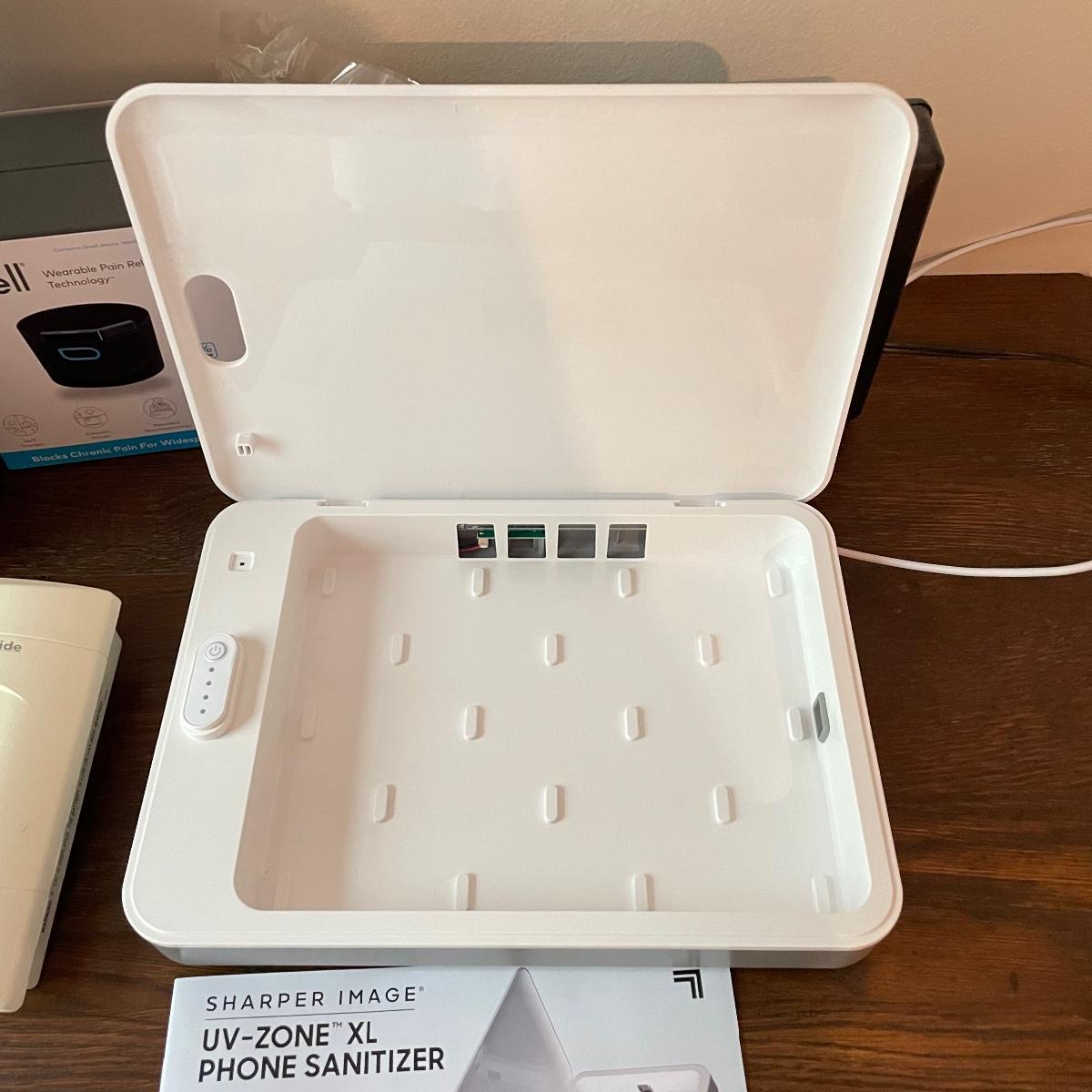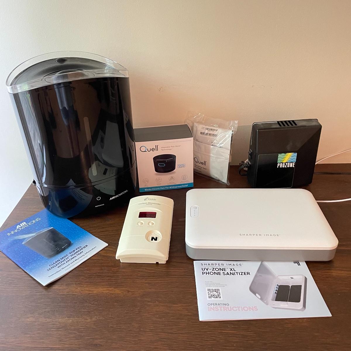 Sharper Image UV Phone Sanitizer, comes with cord, but needs an adapter. Prozone 6.25” tall Air Purifier. New-in-box Quell Wearable Pain Relief Technology, Air Innovations Clean Mist Sensatouch Humidifier and Kiddie Carbon Monoxide Alarm. All items turned on when tested. Local pick up only.