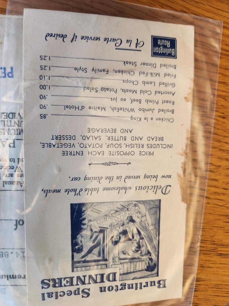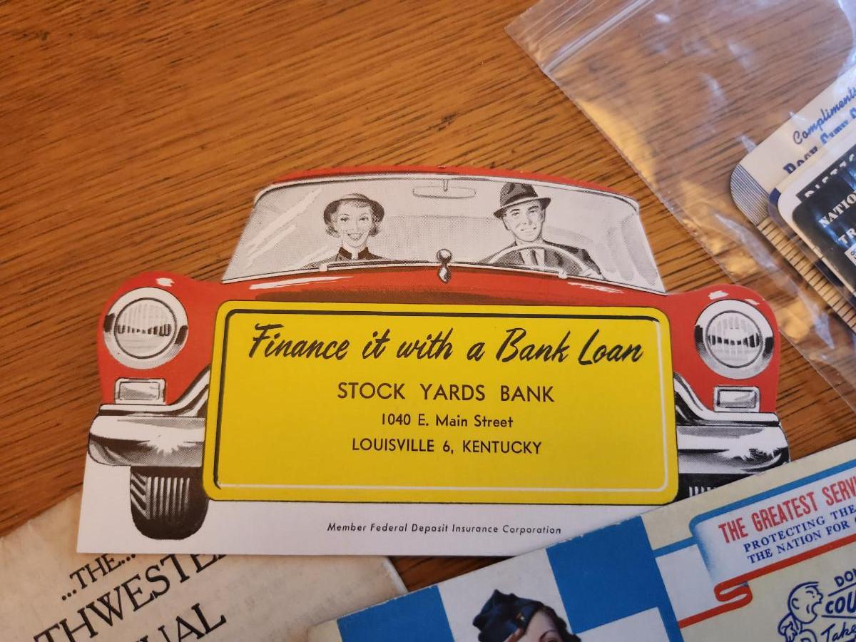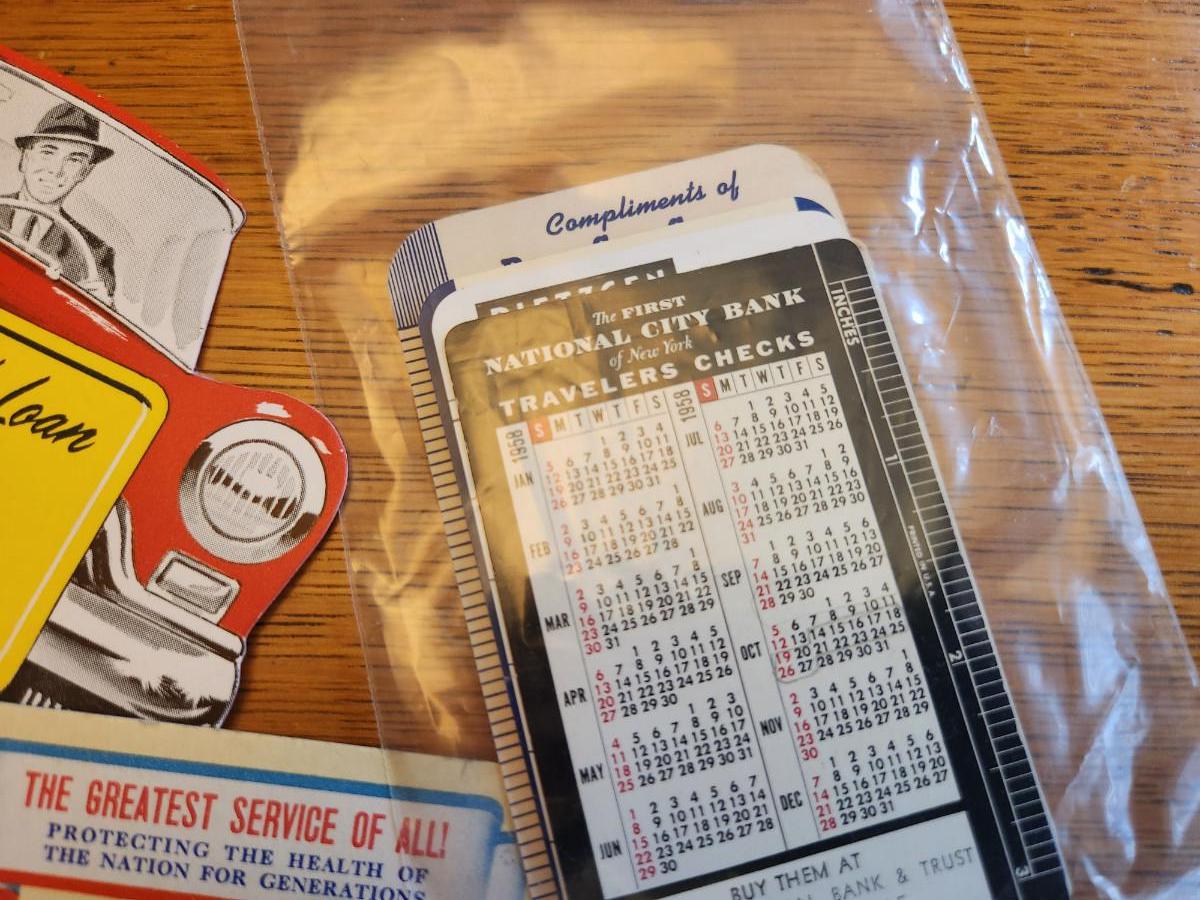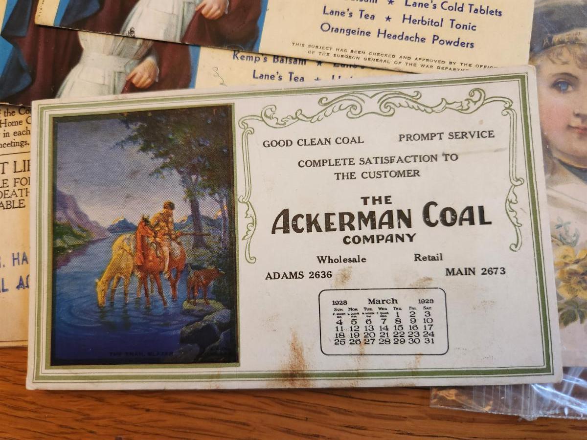 This auction lot is for a Ephemera Collection consisting of 15 unique pieces. There is a small plastic bag with 8 pocket/wallet calendars mostly from the 40's & 50s. Two Kemp's Balsam ink blotters picturing a nurse, another from the Ackerman Coal Company and another in pristine condition from Stock Yards Bank in Louisville. Also includes an Insurance Policy from 1914, an advertisement from Woolson Spice with corner damage and a menu from the Burlington Special Train dinner car.