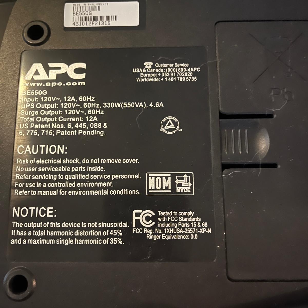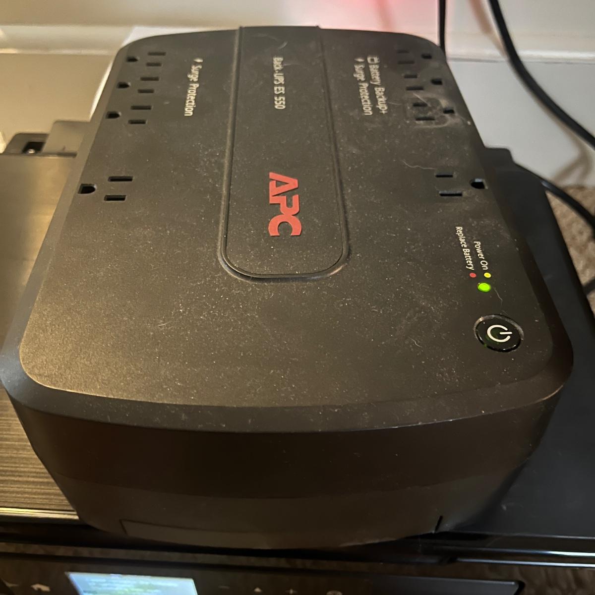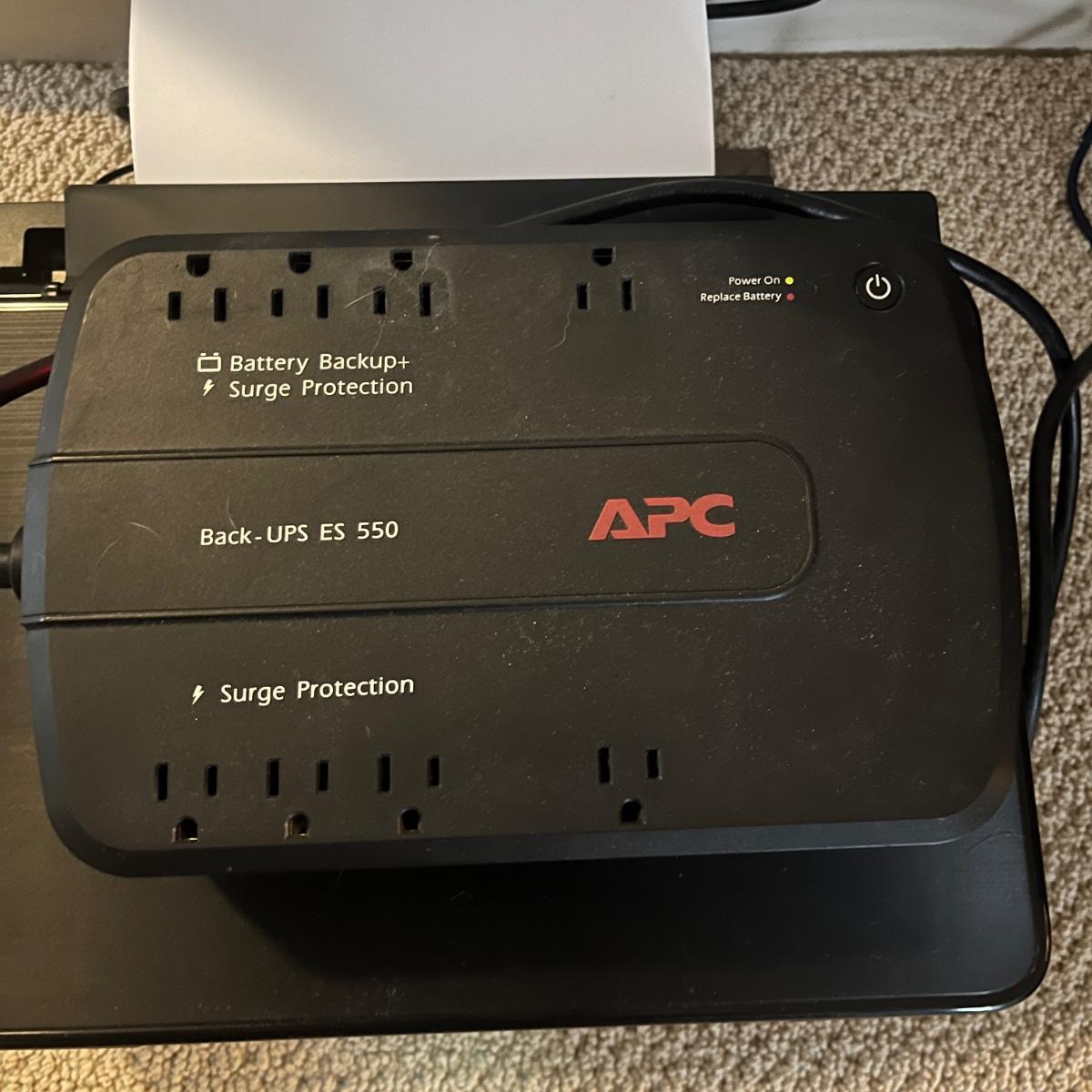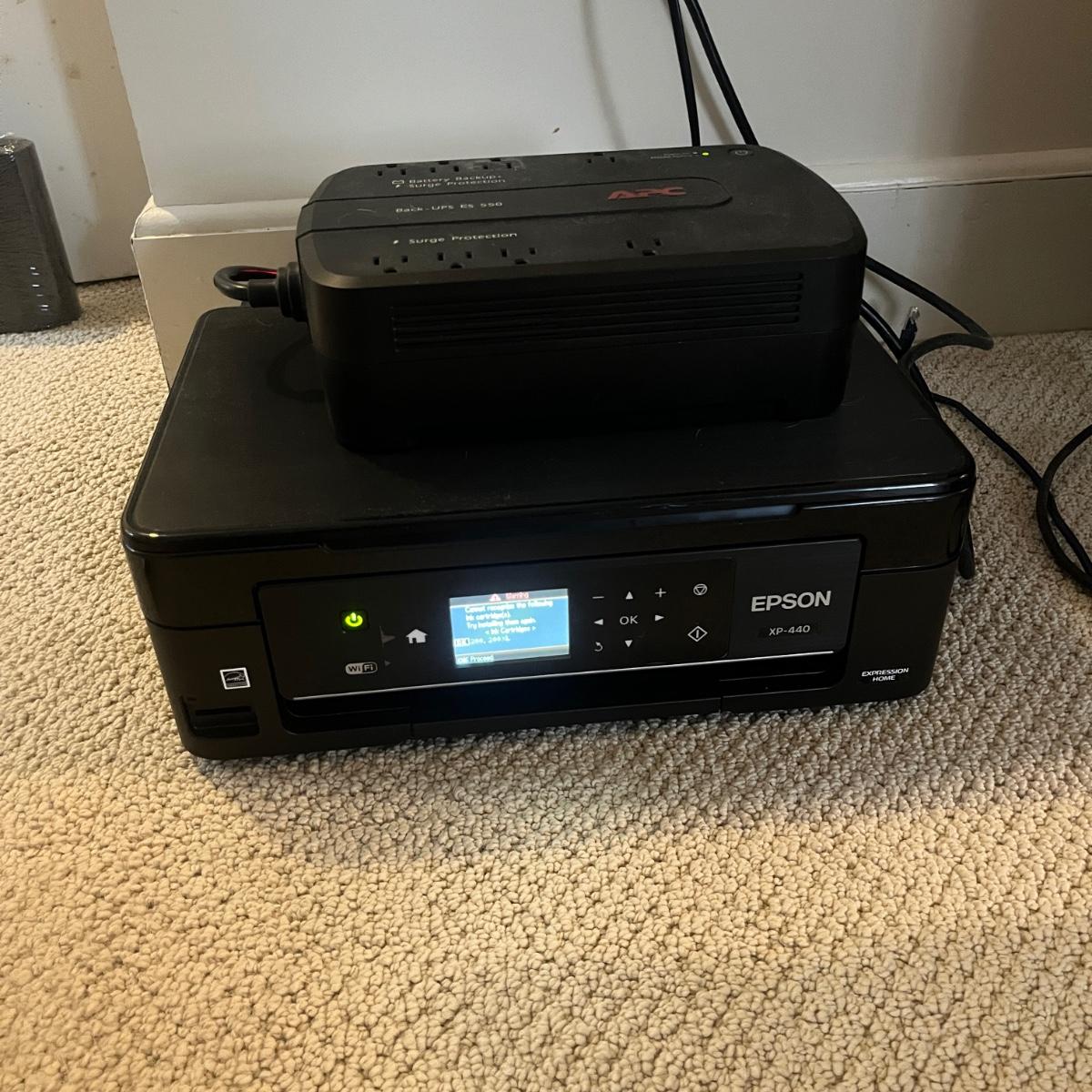 Lot includes a APC battery backup and an Epson printer with built in scanner and copier. Both items powered on when plugged in. Printer measures 12” x 16” x 6”. Some surface dust.