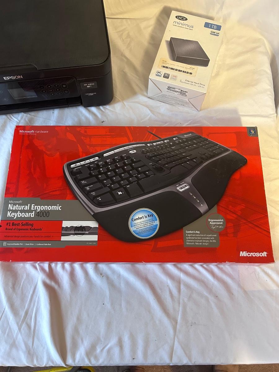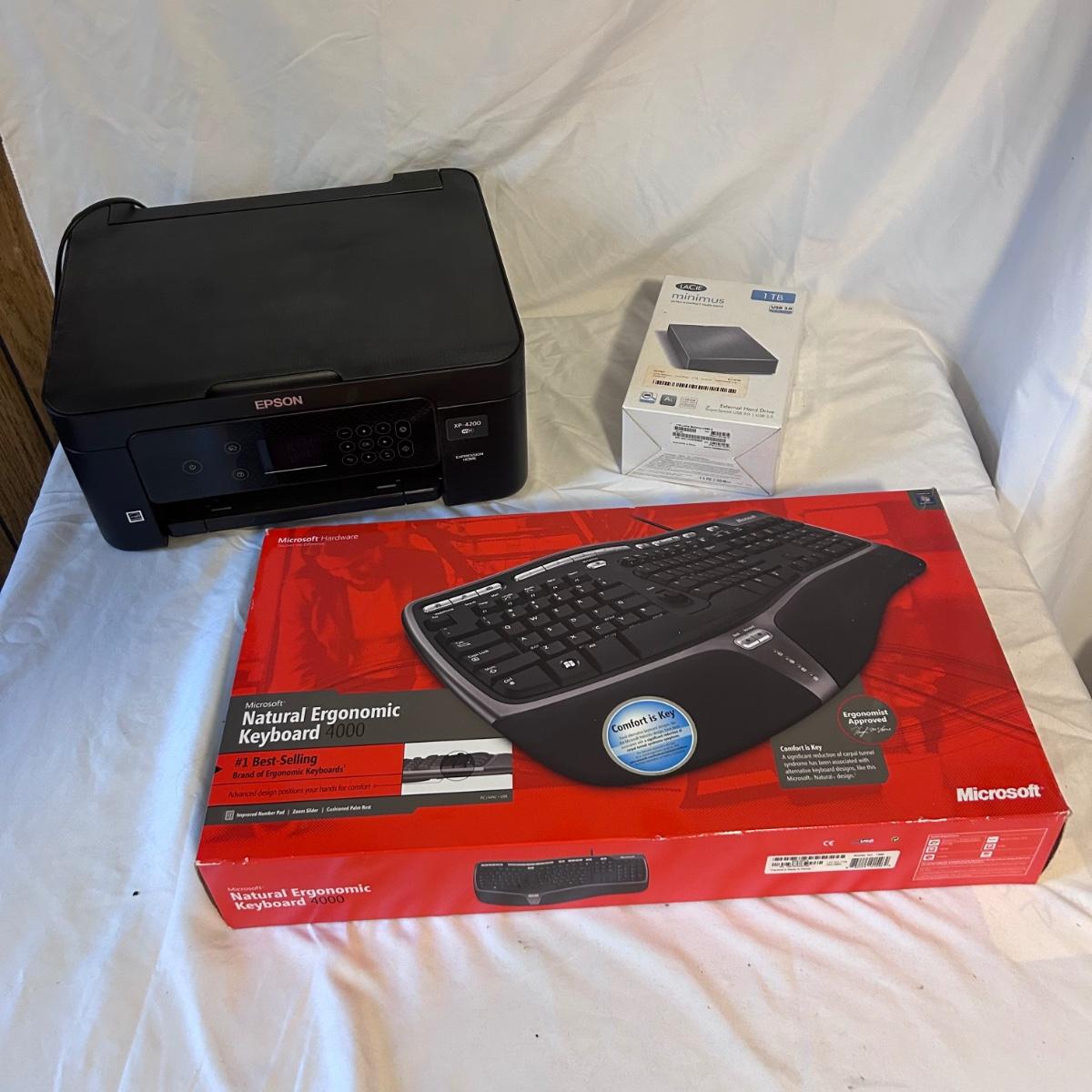 Lot includes an Epson XP-4200 printer that powered on. A new in box Lacie 1TB external hard drive that retailed for $129. The Microsoft ergonomic keyboard 4000 is used but has original box. Was not tested. See photos for condition. We cannot verify contents of ink cartridges.