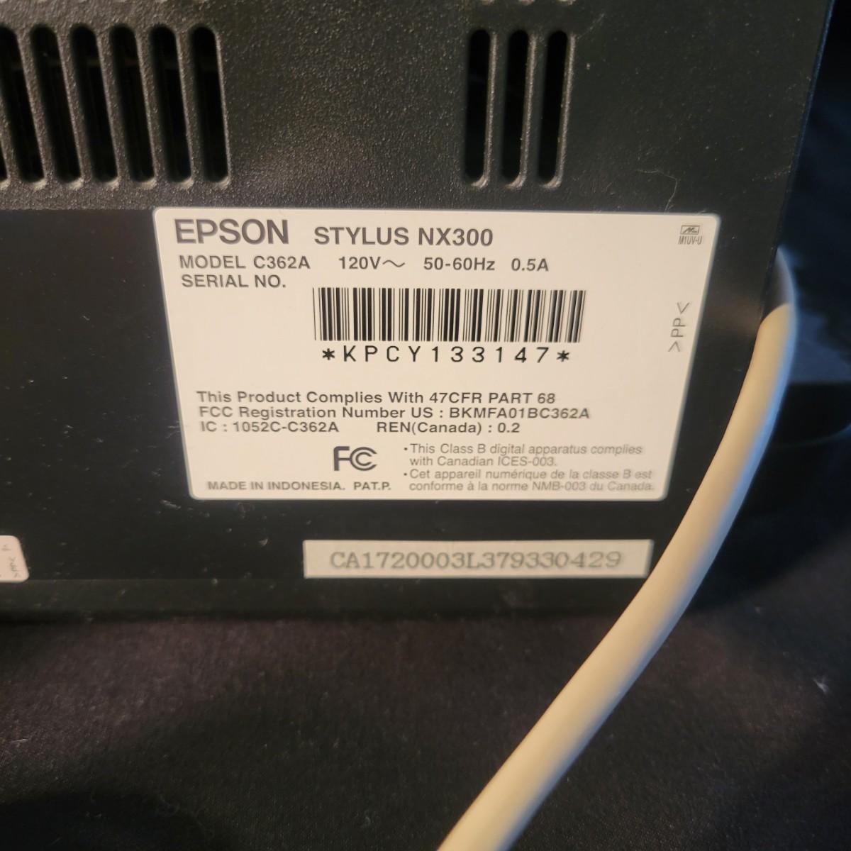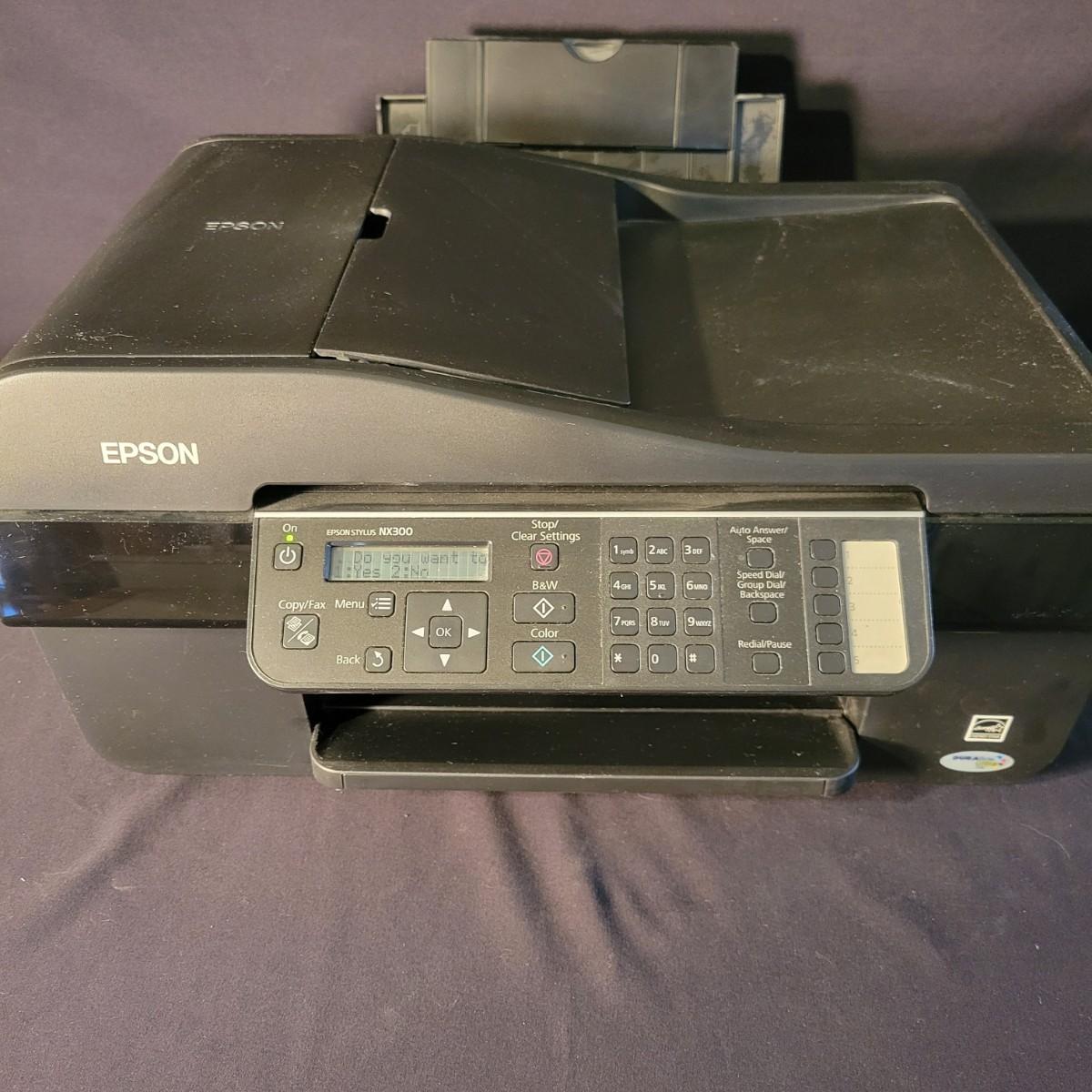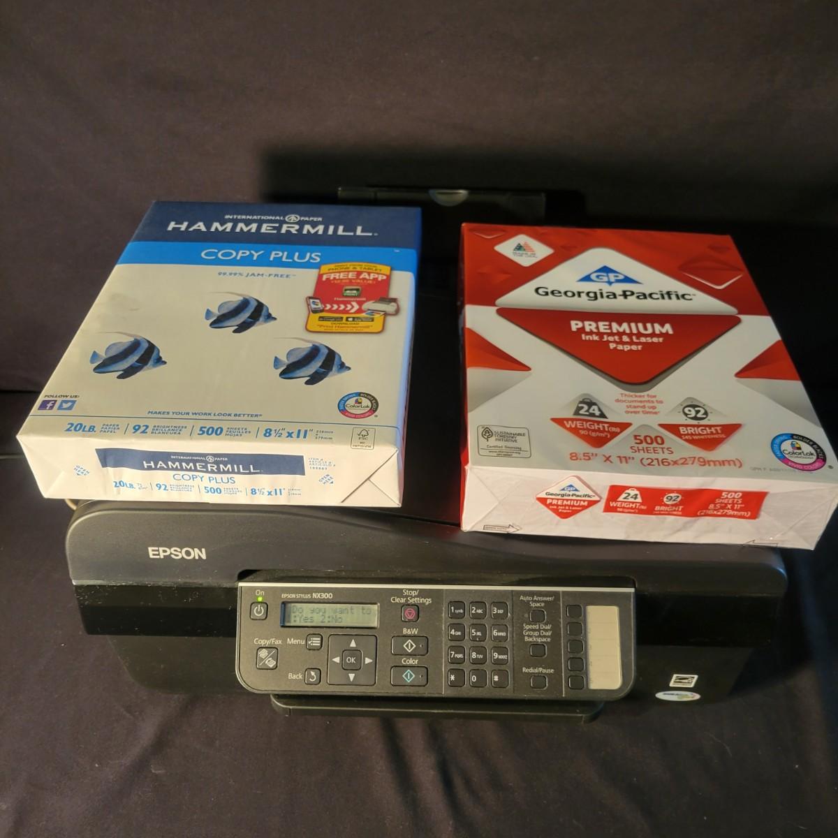 An Epson printer and two reems of paper in good condition. Printer was tested and powered on. The printer is an Epson Stylus NX300, model# C362A and is a printer, scanner and fax machine. It measures approximately 18" x 14" x 10". Lot also includes two unopened reems of printing paper. Shipping available. Shipping can be costly. We suggest calling our local UPS with dimensions and getting an estimate before bidding: (828) 252-6930