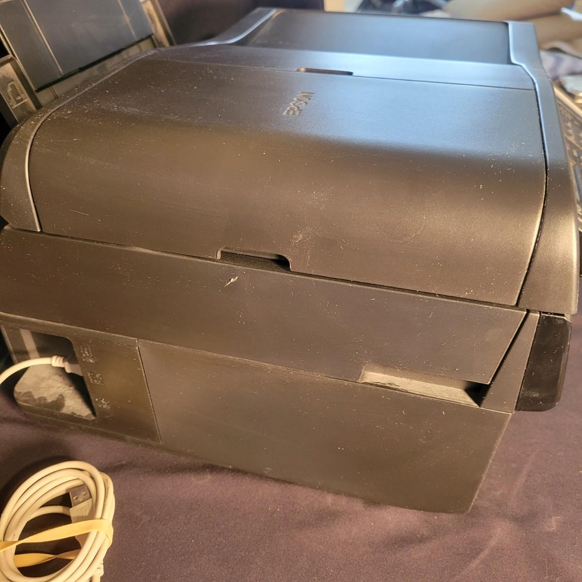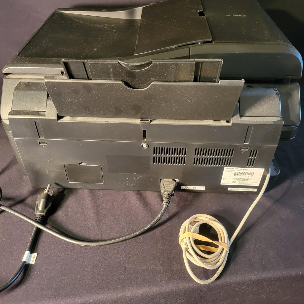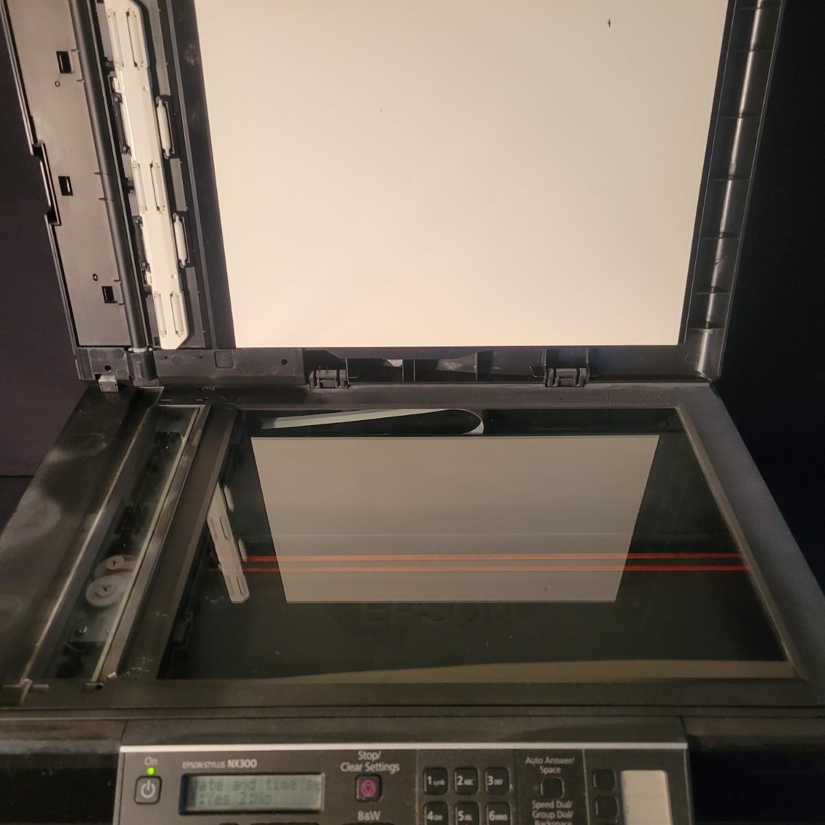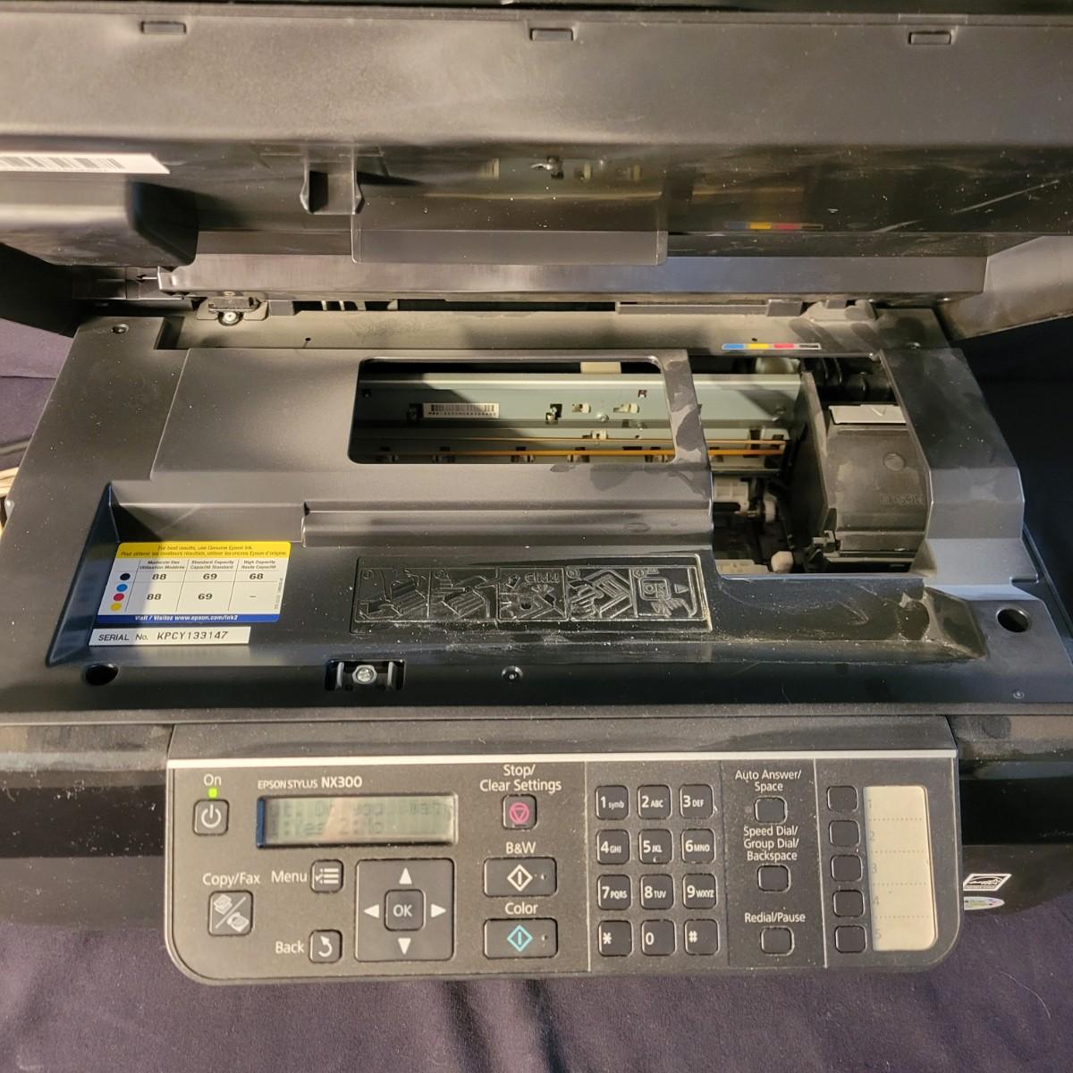 An Epson printer and two reems of paper in good condition. Printer was tested and powered on. The printer is an Epson Stylus NX300, model# C362A and is a printer, scanner and fax machine. It measures approximately 18" x 14" x 10". Lot also includes two unopened reems of printing paper. Shipping available. Shipping can be costly. We suggest calling our local UPS with dimensions and getting an estimate before bidding: (828) 252-6930
