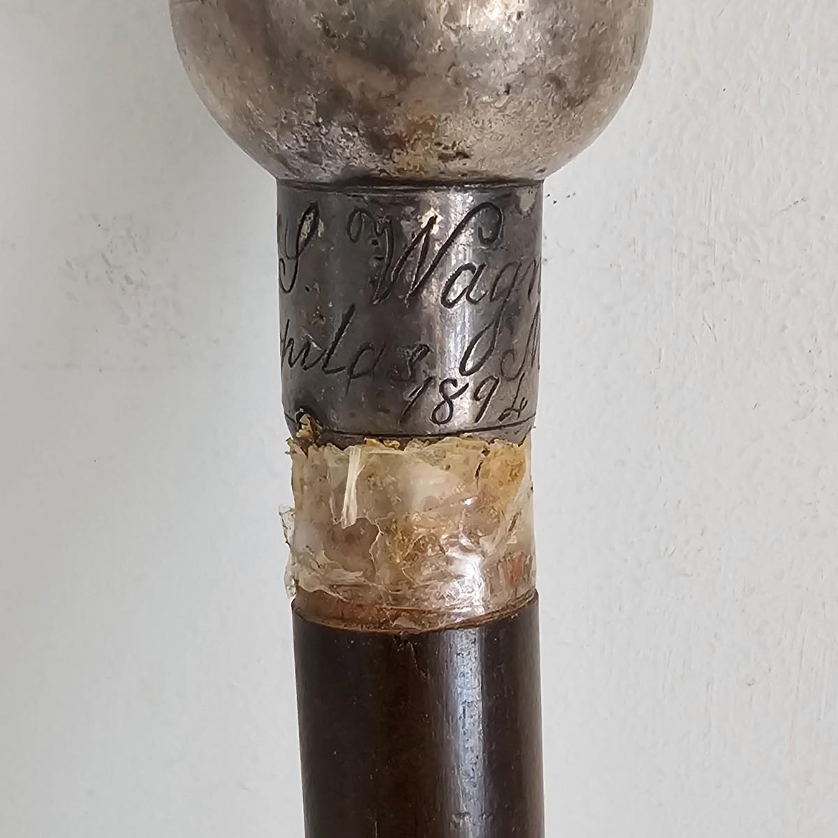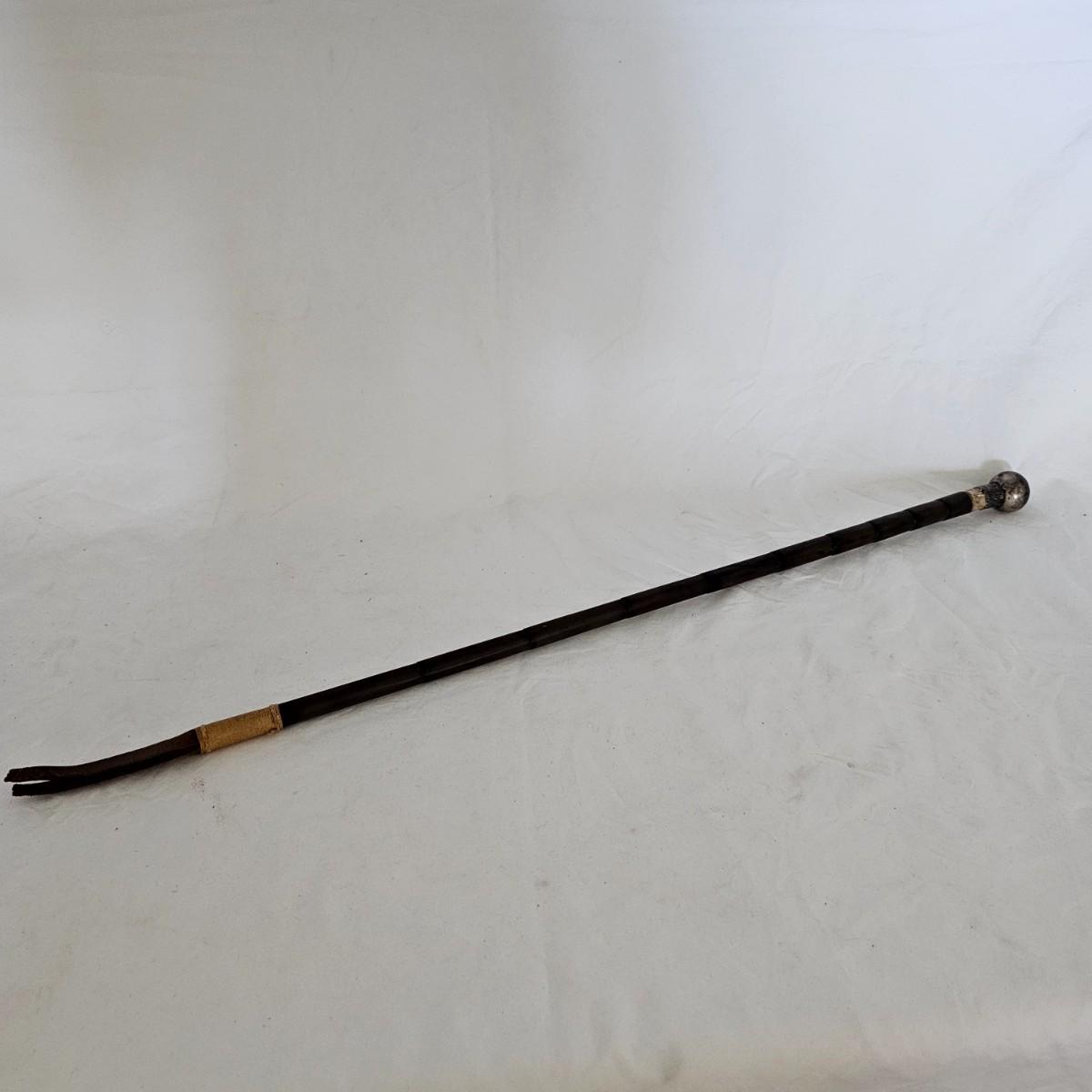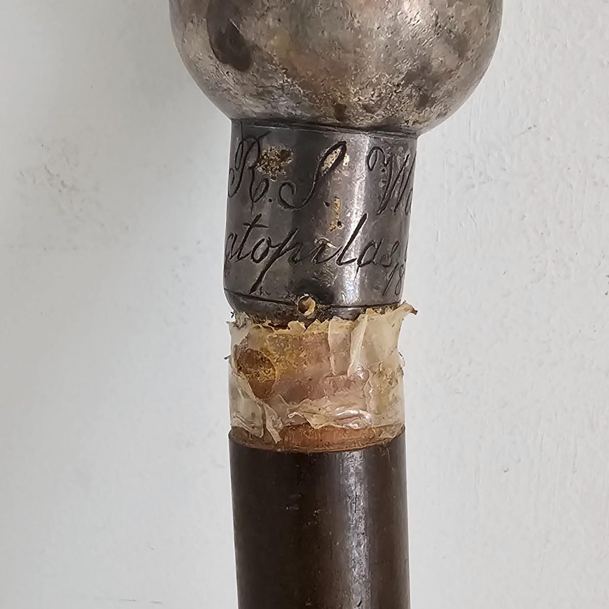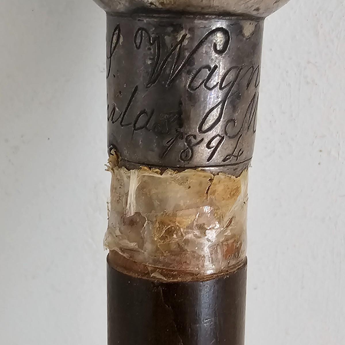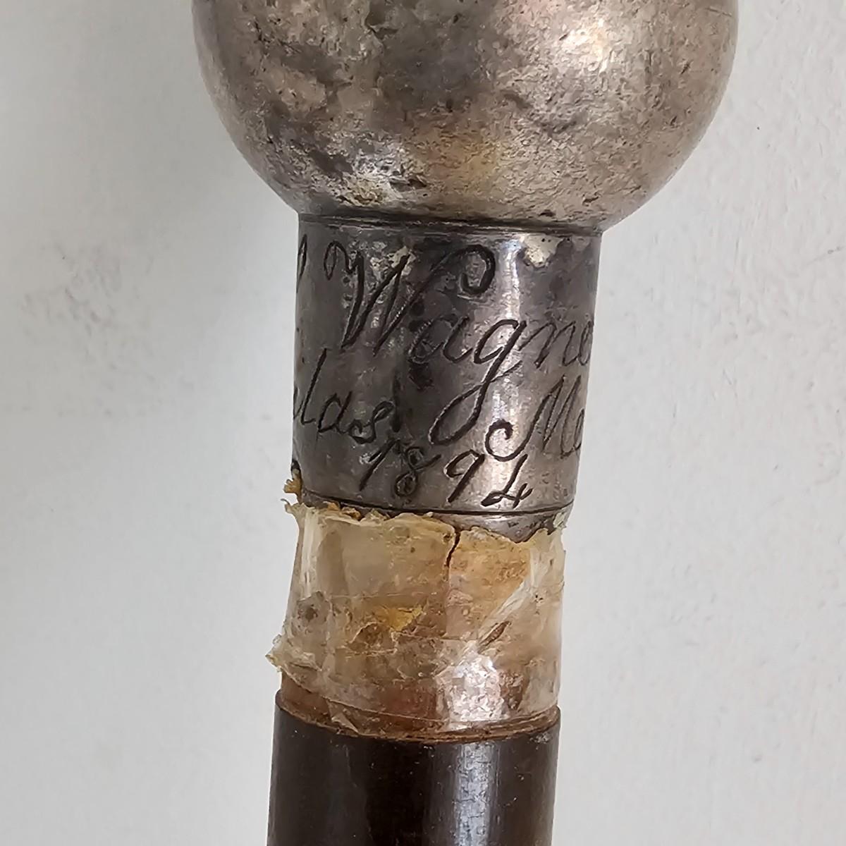 Wooden decorated box with steeplechase riders on lid and opens to red felt lined interior. Box measures 10" x 5.75" x 4.5"H. Riding crop has split leather tips, what appears to be a silver cane head that is inscribed. Top is somewhat askew on crop. May have been reattached. See photos for details. Shipping available.