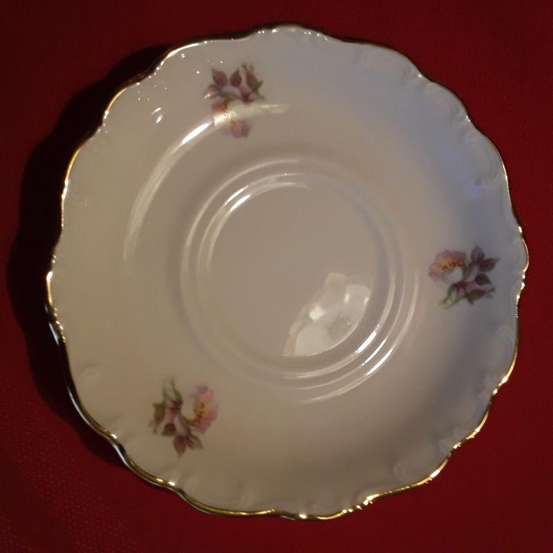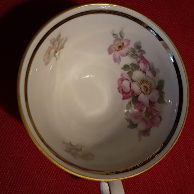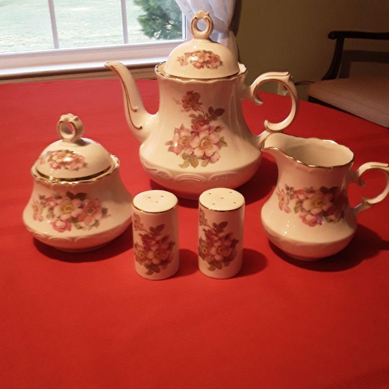 E&R Briar Rose 7 piece tea set includes: teapot, cream & sugar, salt & pepper, cup & saucer with gold trim