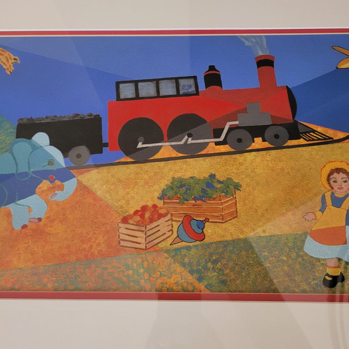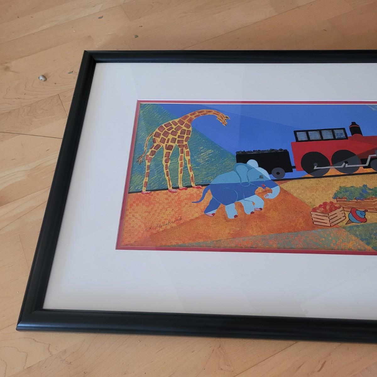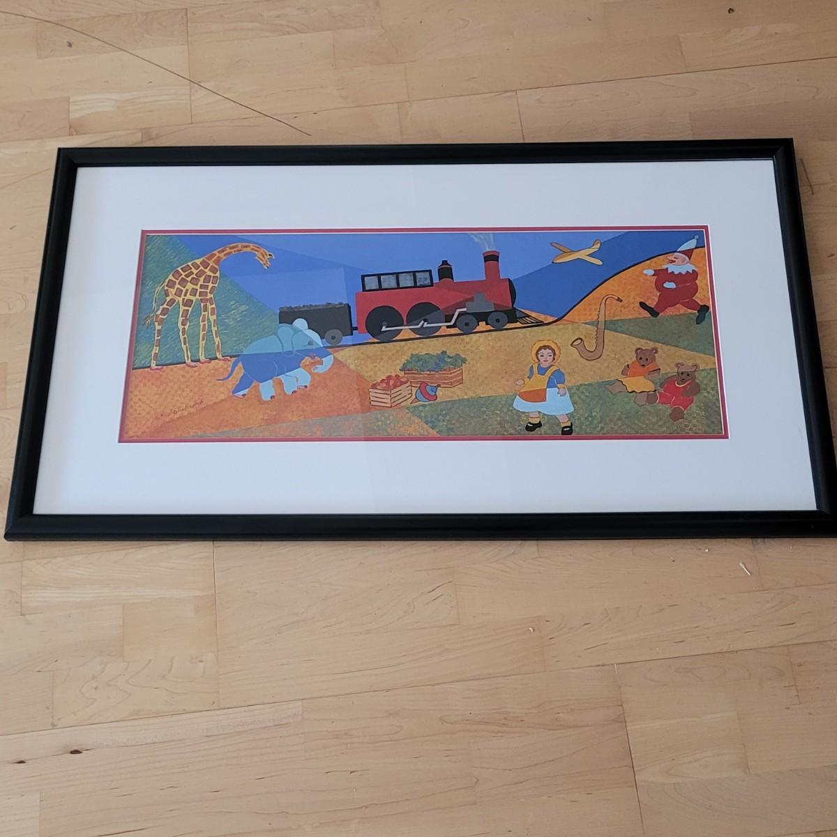 This lot includes an original piece by artist E.R. Stinchcomb. It appears to be mixed media (likely paint, pencil, and pastel). It depicts a train, a little girl, a clown, and various animals with a blue and green background. It is signed in the bottom left corner. The frame measures 38" x 22"H and is behind plexiglass.