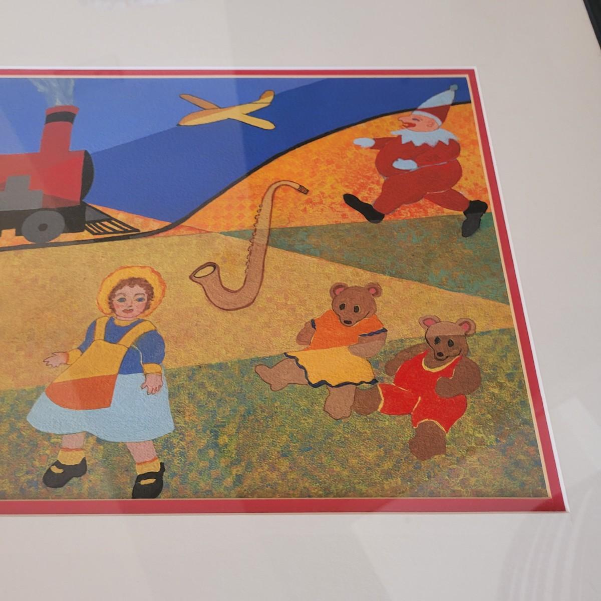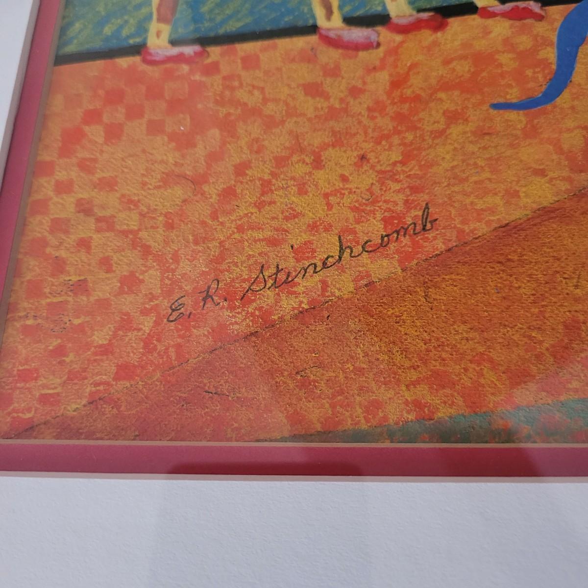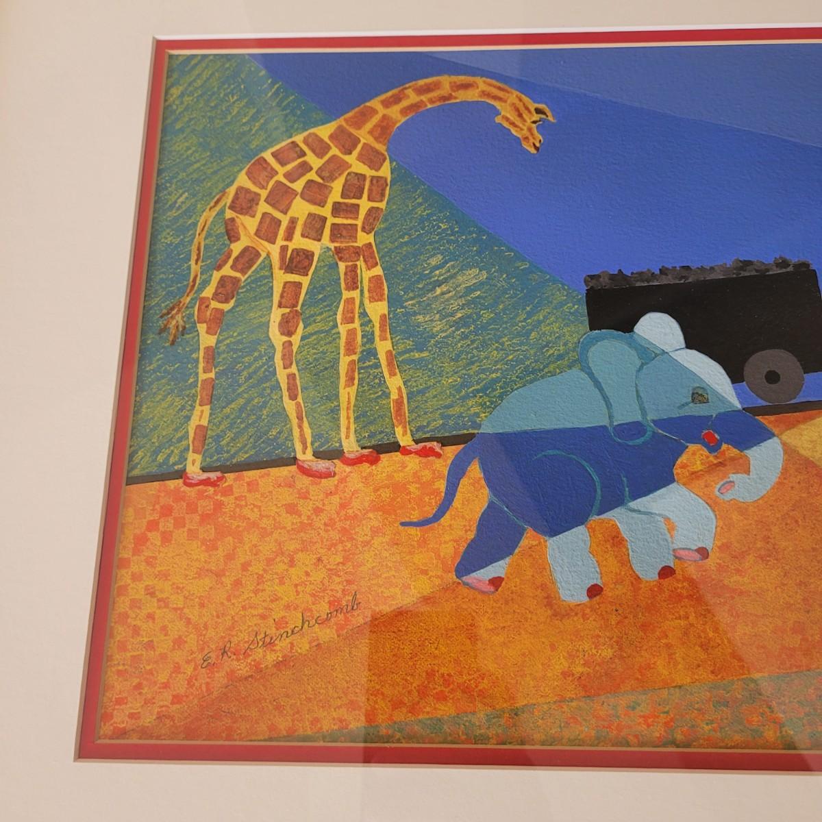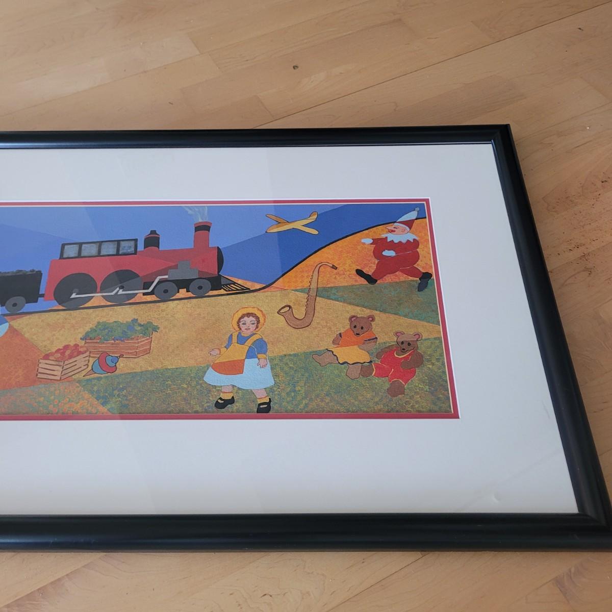 This lot includes an original piece by artist E.R. Stinchcomb. It appears to be mixed media (likely paint, pencil, and pastel). It depicts a train, a little girl, a clown, and various animals with a blue and green background. It is signed in the bottom left corner. The frame measures 38" x 22"H and is behind plexiglass.