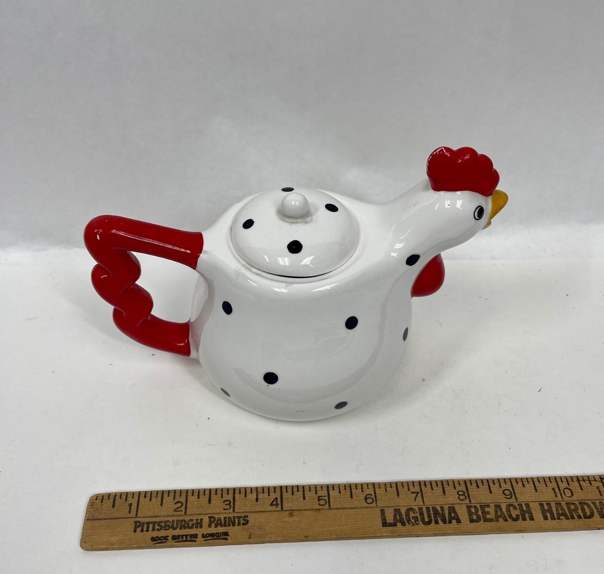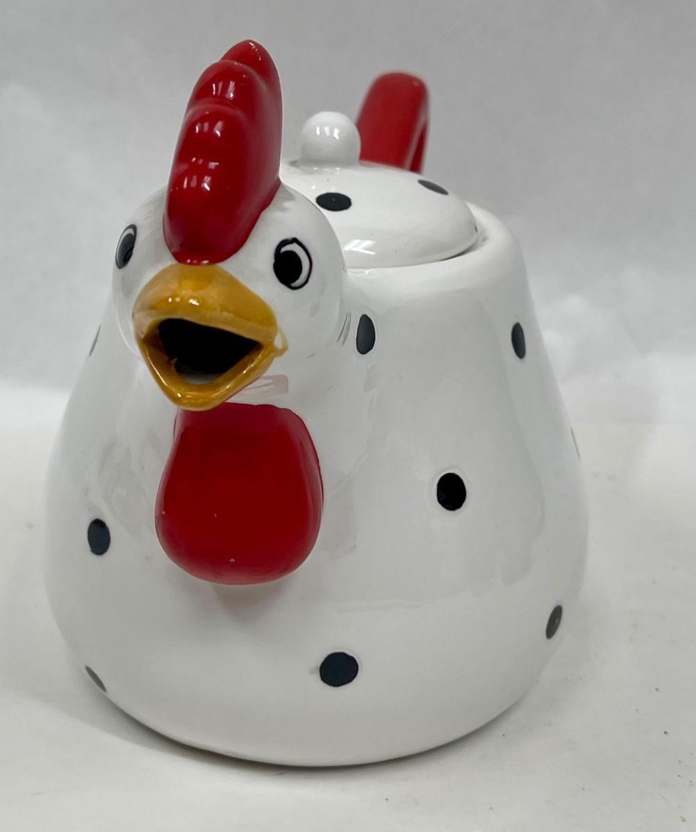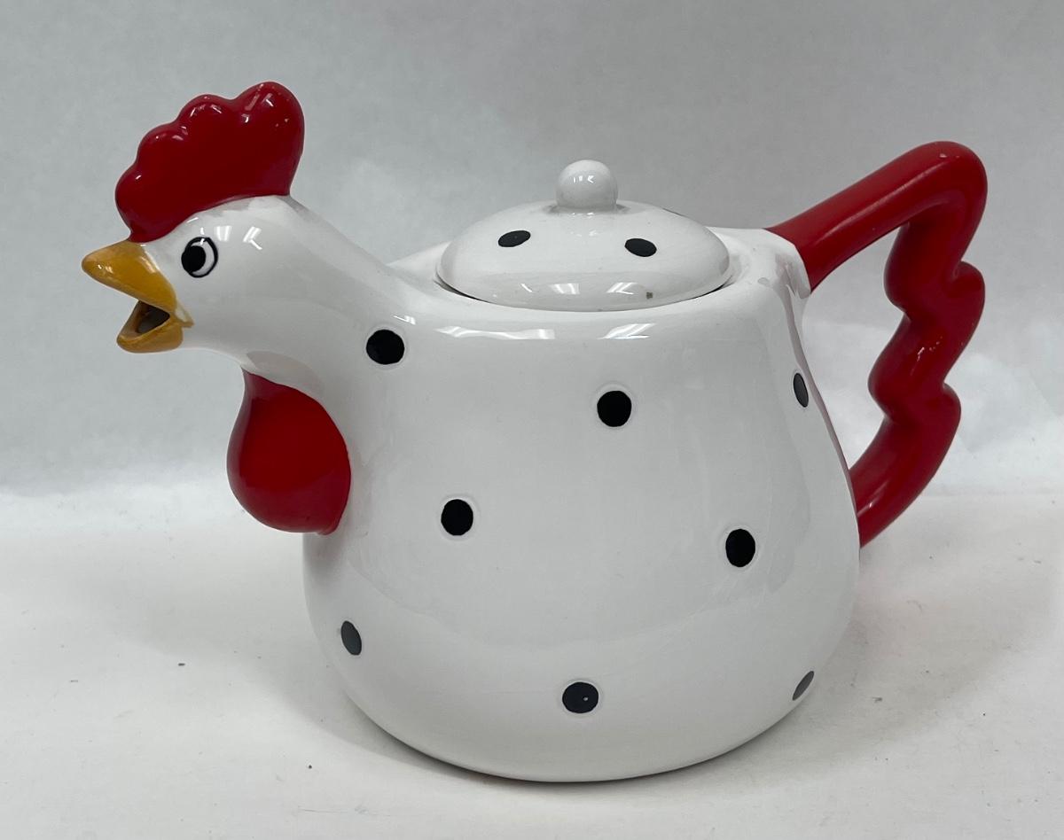 Metal Black Polka Dot & White Chicken Red Rooster Comb Tea Pot