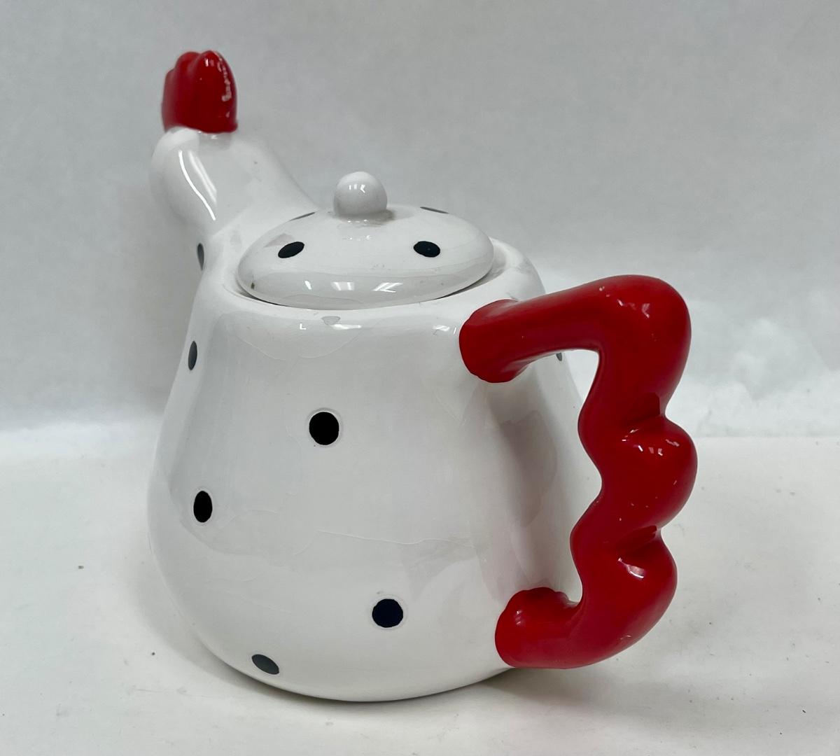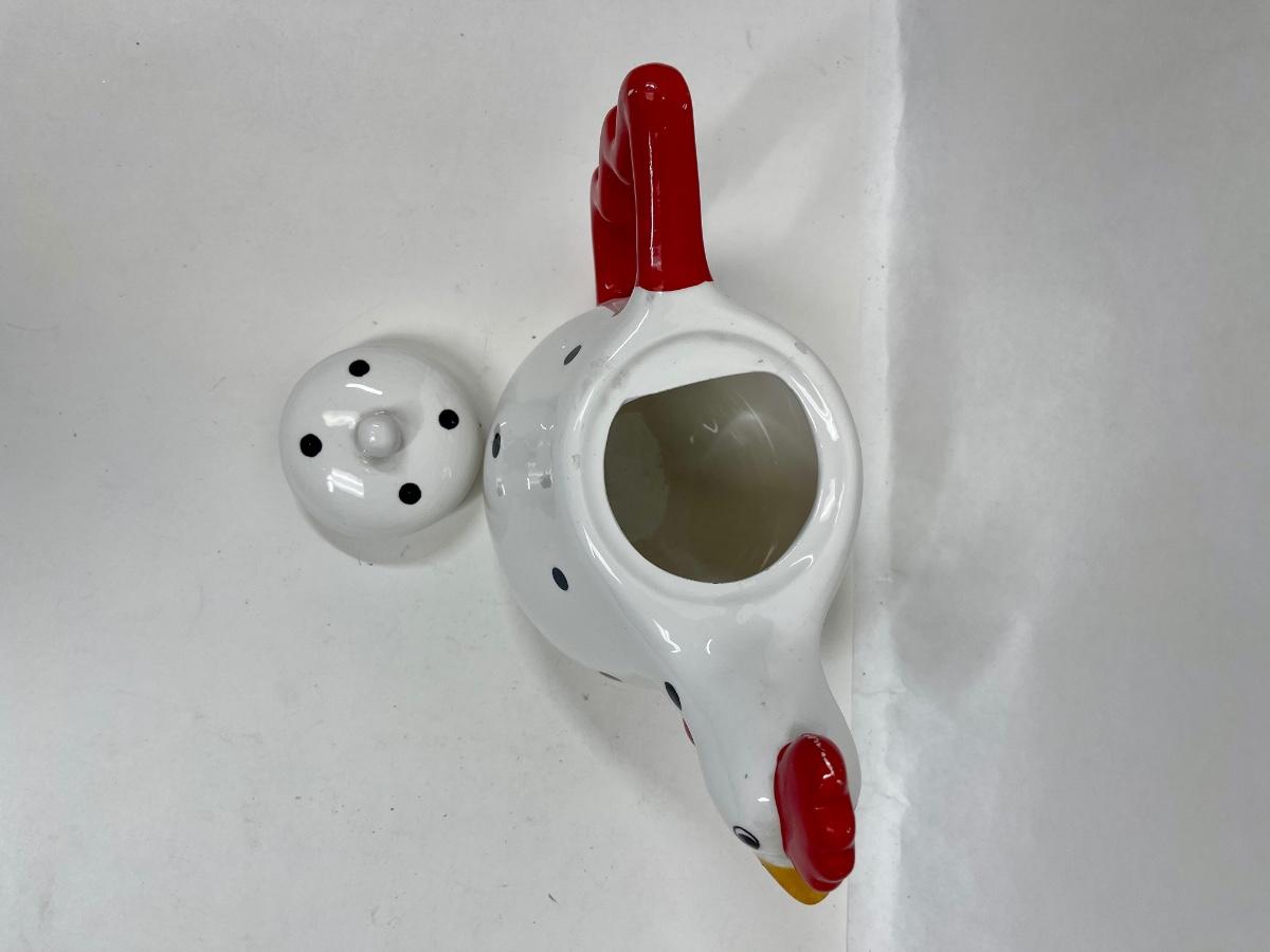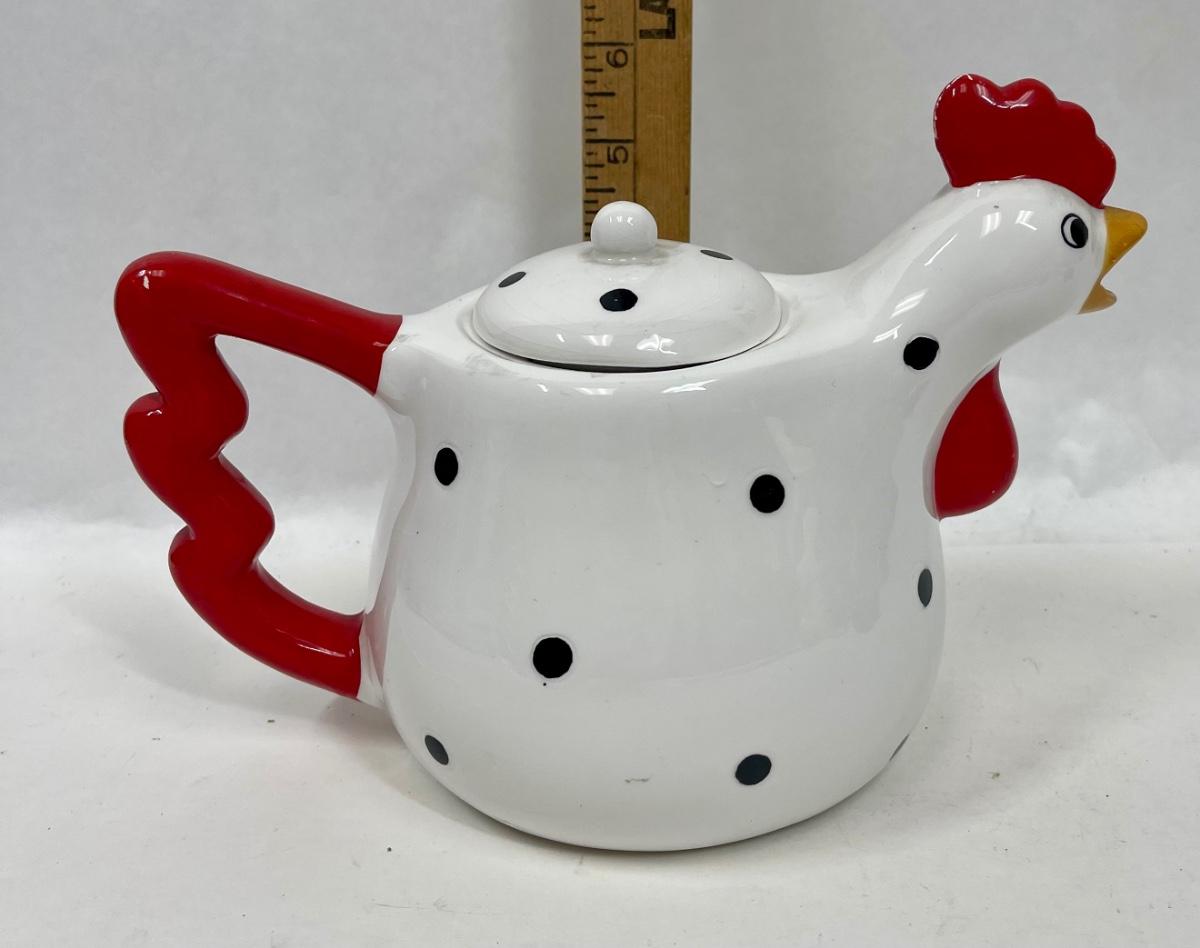 Metal Black Polka Dot & White Chicken Red Rooster Comb Tea Pot