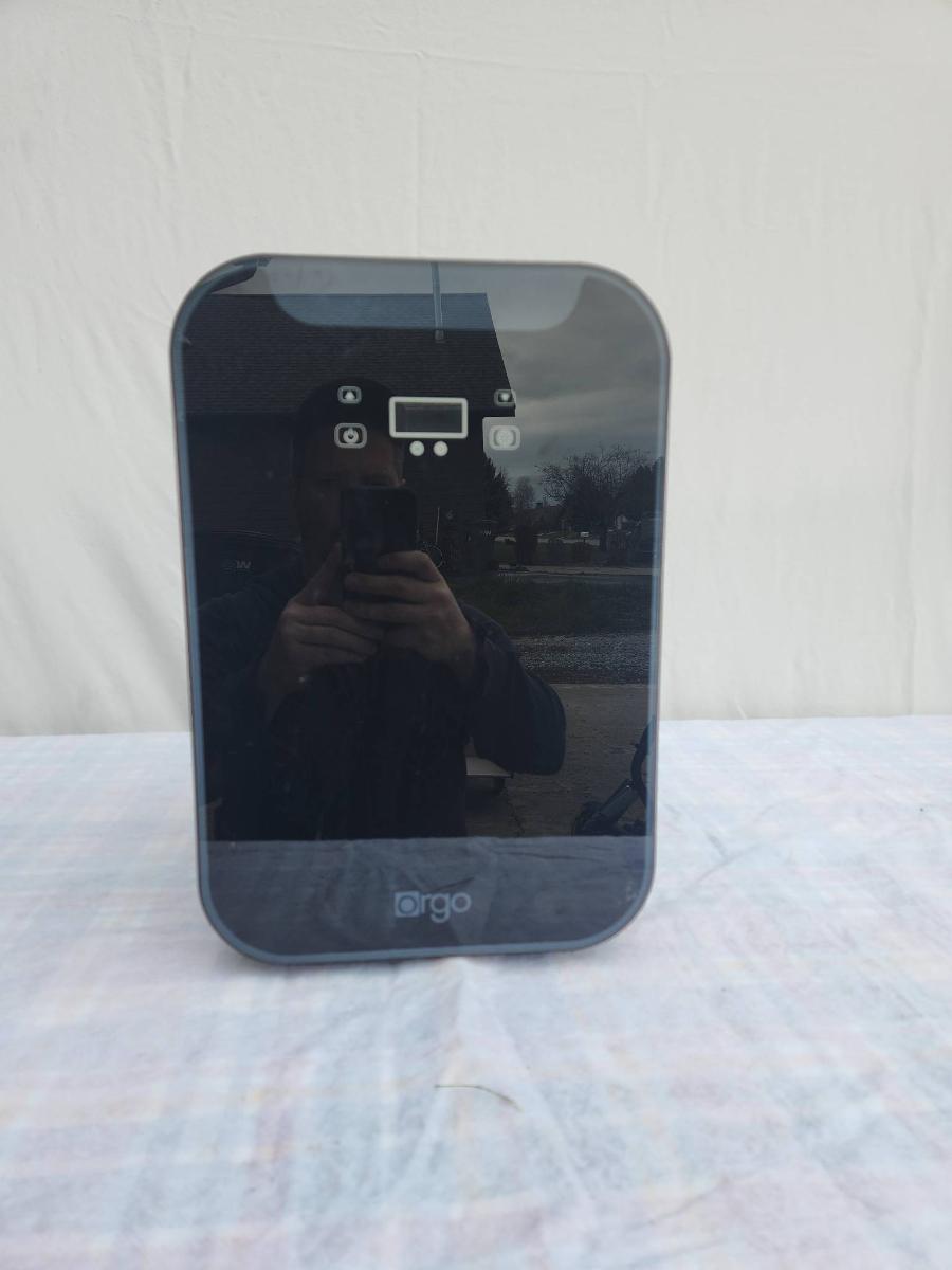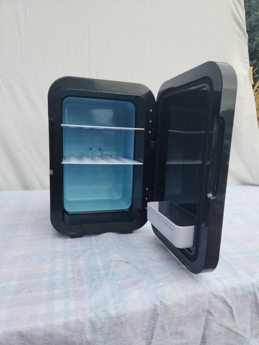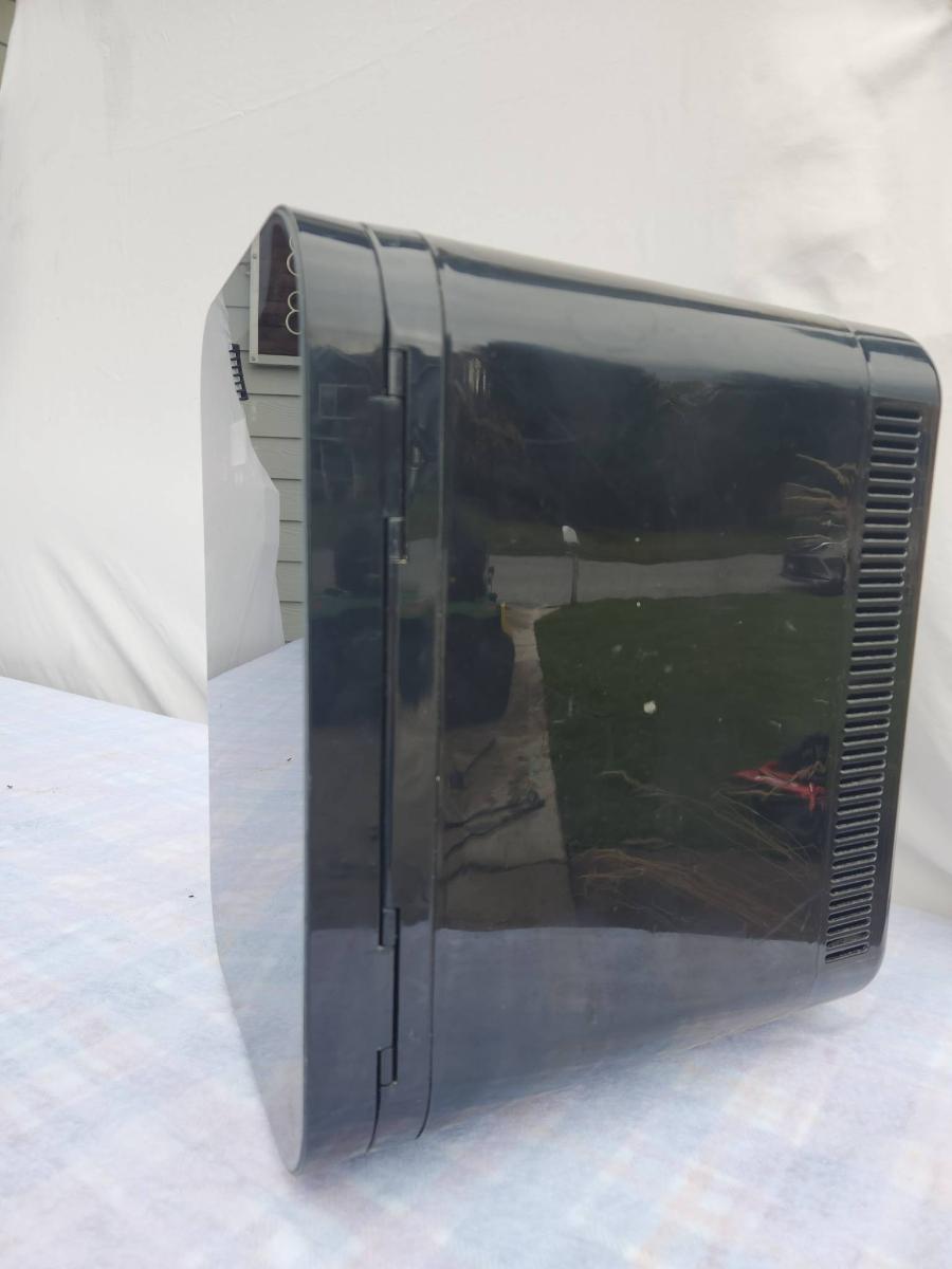 Ergo compact mini electric refrigerator with a sleek black exterior and reflective front panel. Features two internal shelves and a door basket for efficient storage. Suitable for cooling small food items or beverages. Compact design and lightweight structure for easy portability. Condition appears well-maintained without visible signs of damage.