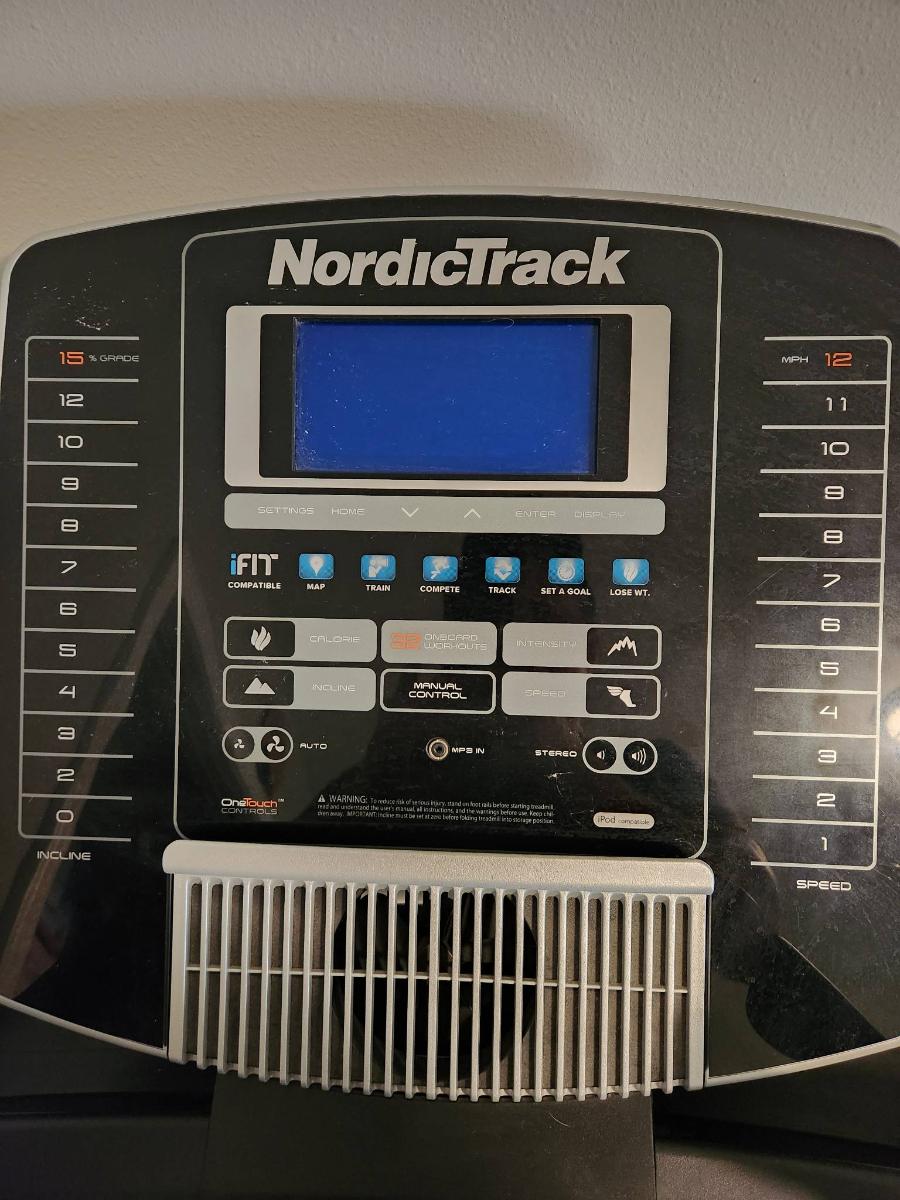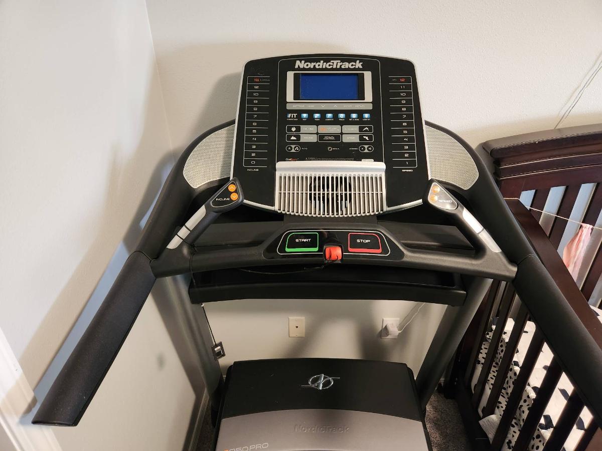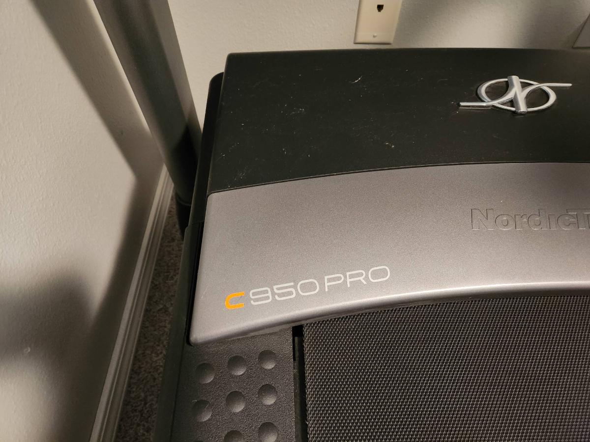 NordicTrack C 950 Pro treadmill featuring a digital display with iFit compatibility. Includes speed and incline controls, multiple workout modes, and handgrip heart rate sensors. Designed with a durable belt and sturdy frame, suitable for home exercise. Equipped with side handles and a safety stop key. Sold in used condition, functionality and wear not specified.