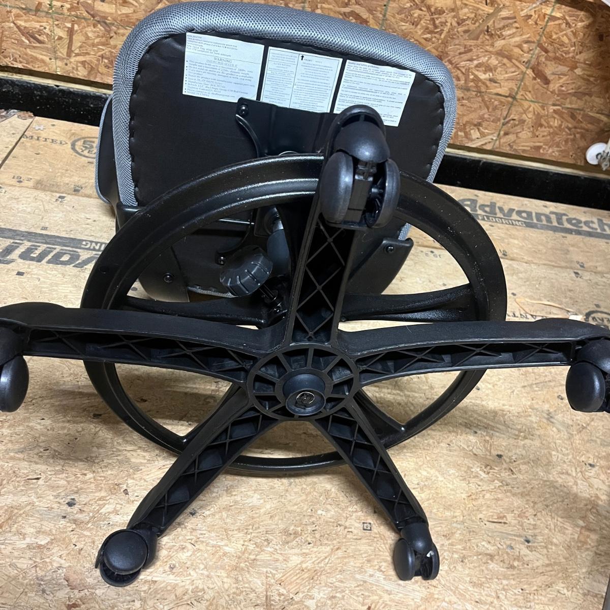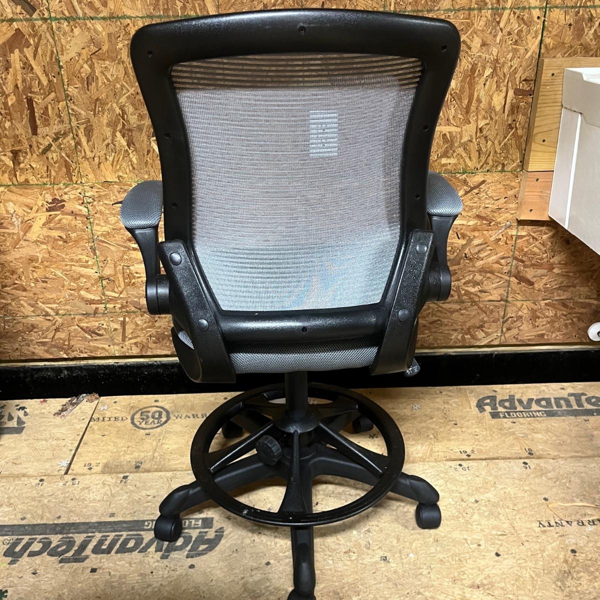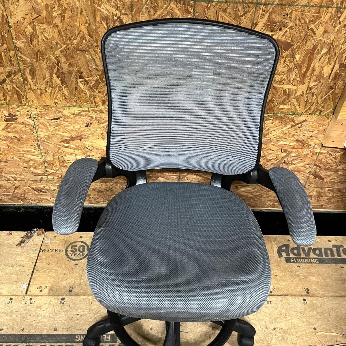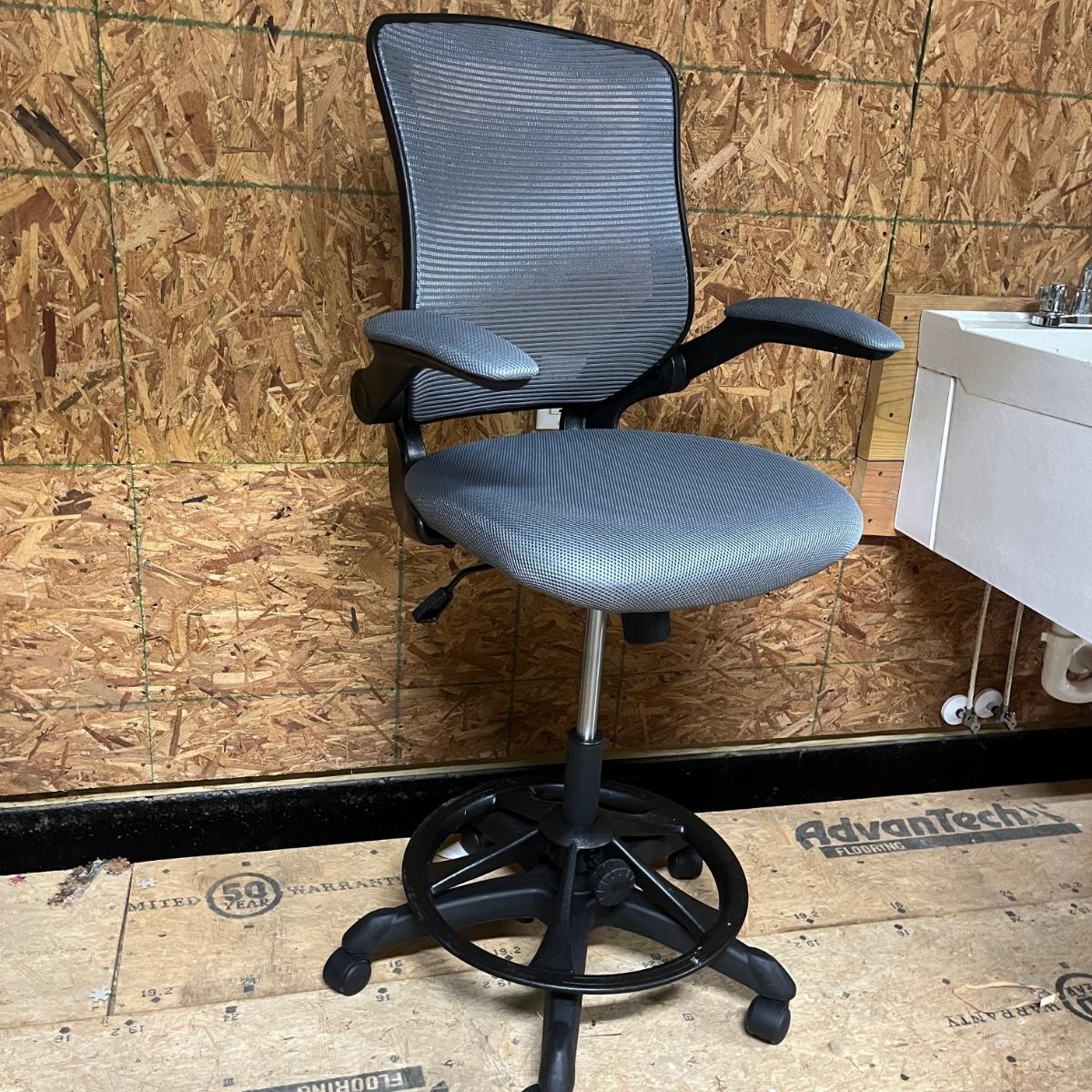 Lot includes an ergonomic office chair with moving armrests, mesh back and adjustable height. Chair measures 25.5” x 24” x 49.5”H at full height with a 49.5” seat height and 25.5” x 24” x 42.5” with a 21.5” seat height when at lowest point.