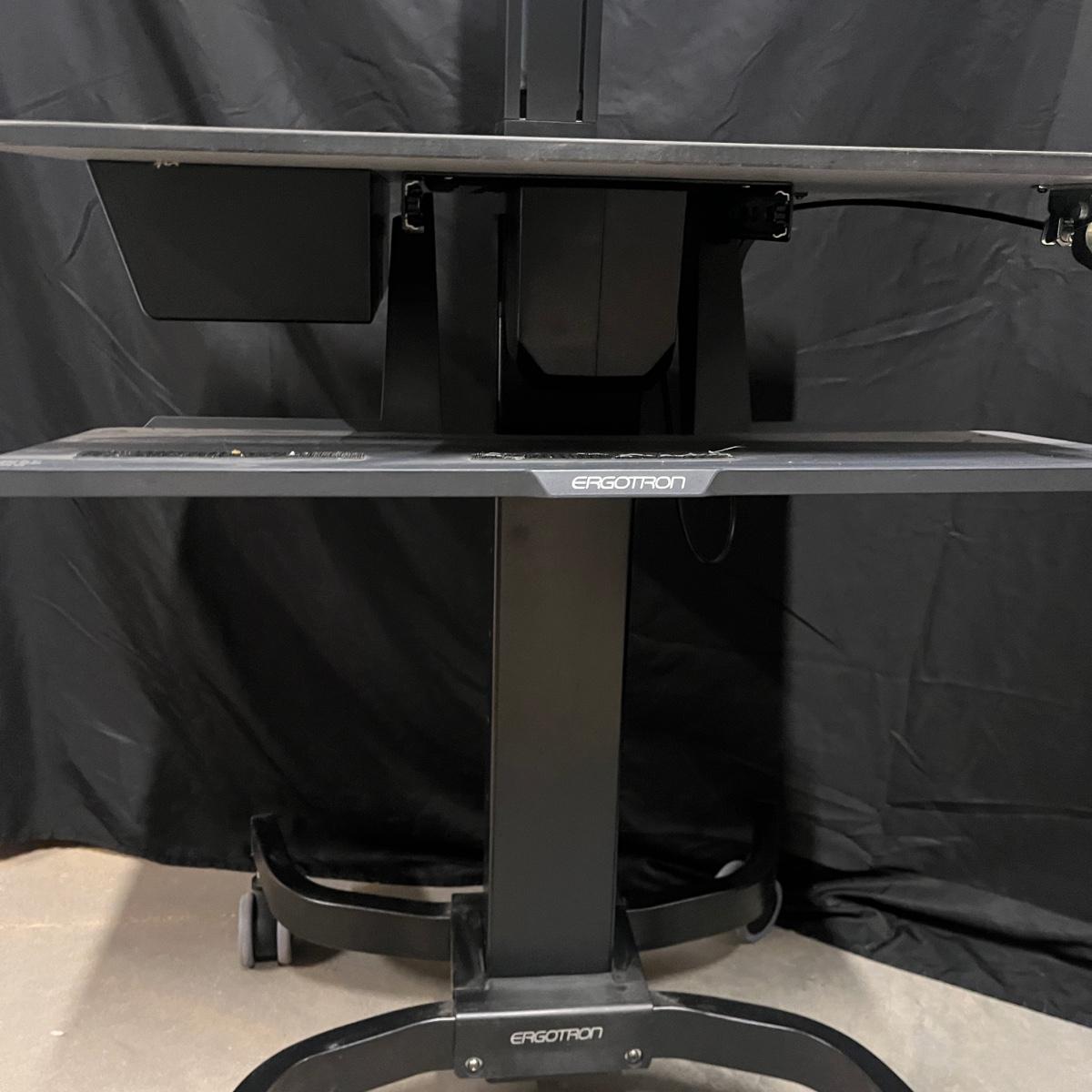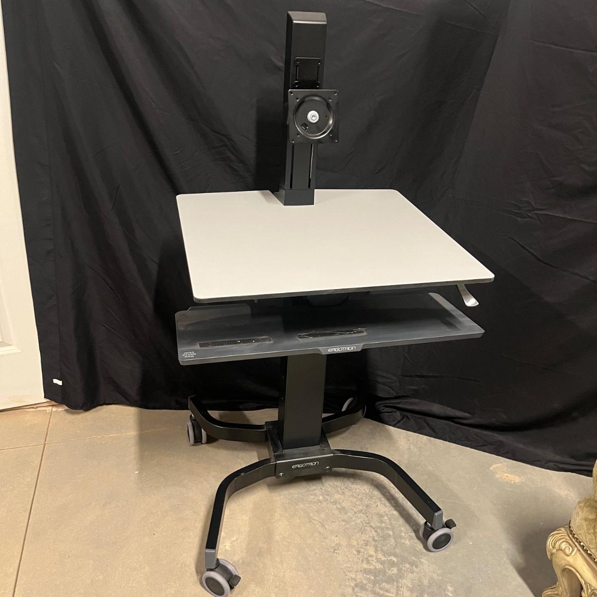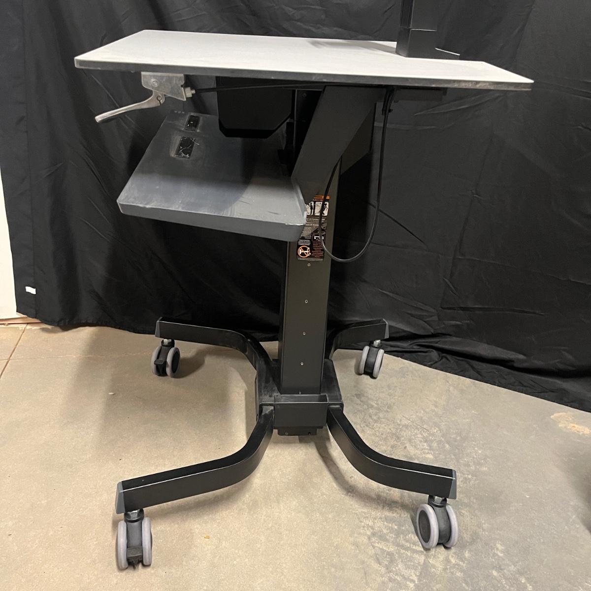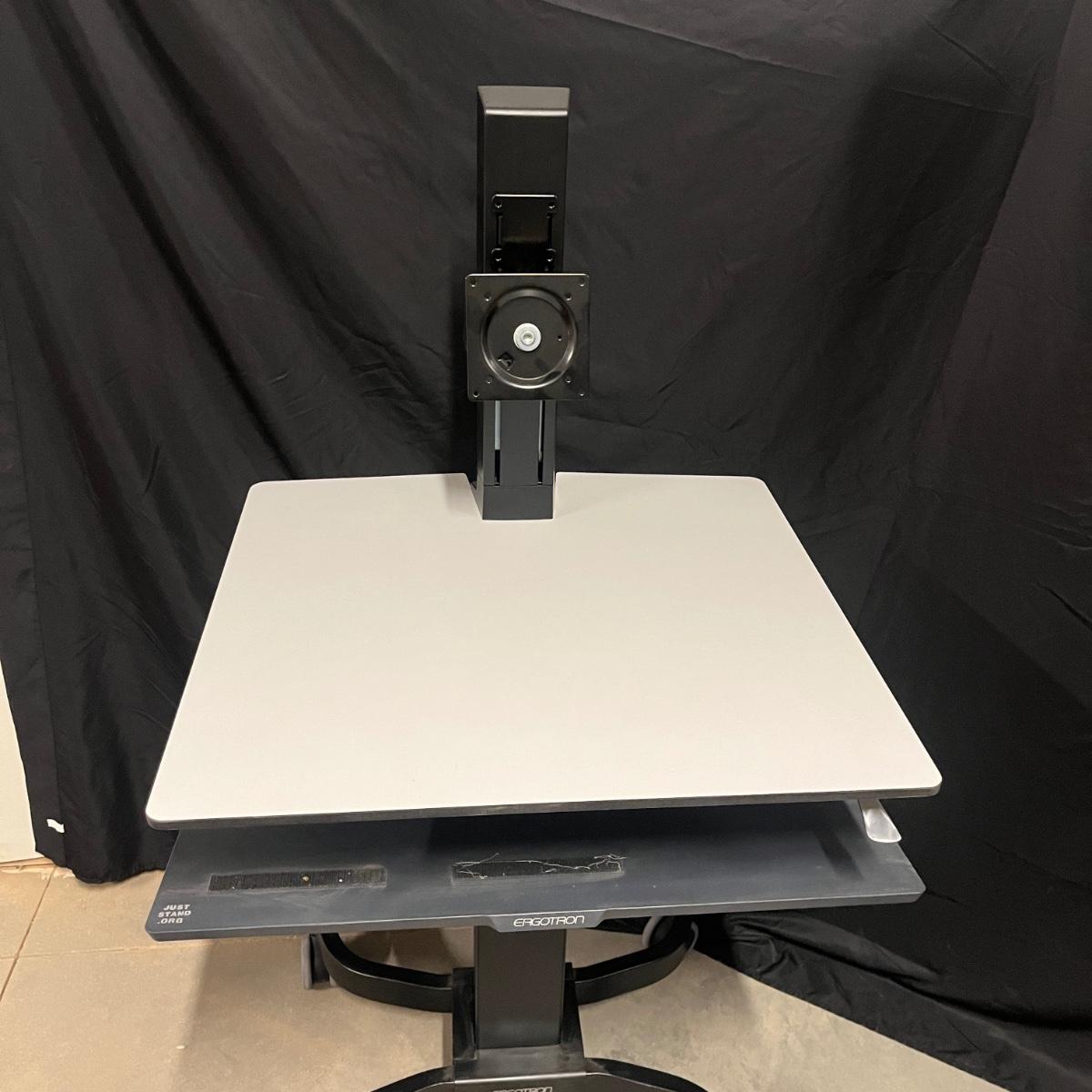 This Ergotron sit-stand workstation has a sliding keyboard tray and is height adjustable. Piece measures 24” x 24” x 58” when fully extended up. Workstation has wheels and is a metal frame with a phenolic resin work surface. The lift mechanism on this desk is not working so once the desk is raised it needs to be lowered with a tool; no tool included, we used a screwdriver.