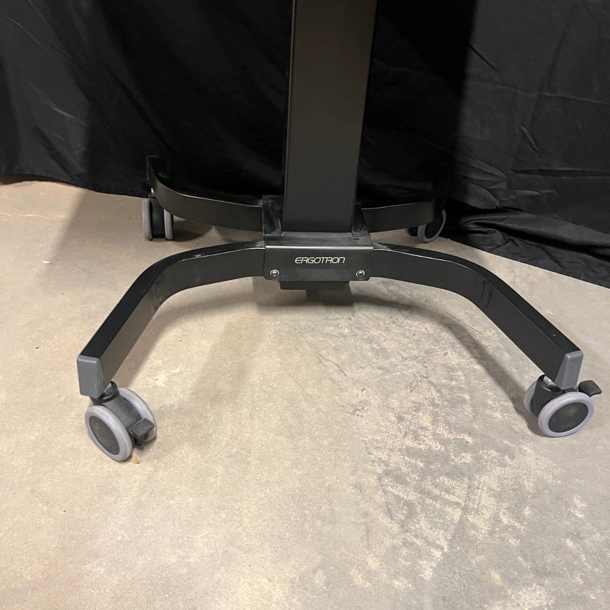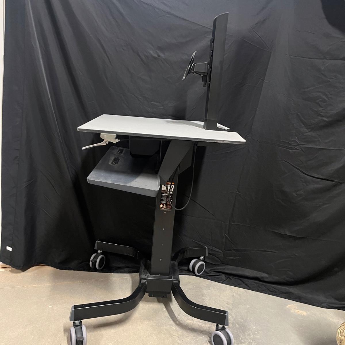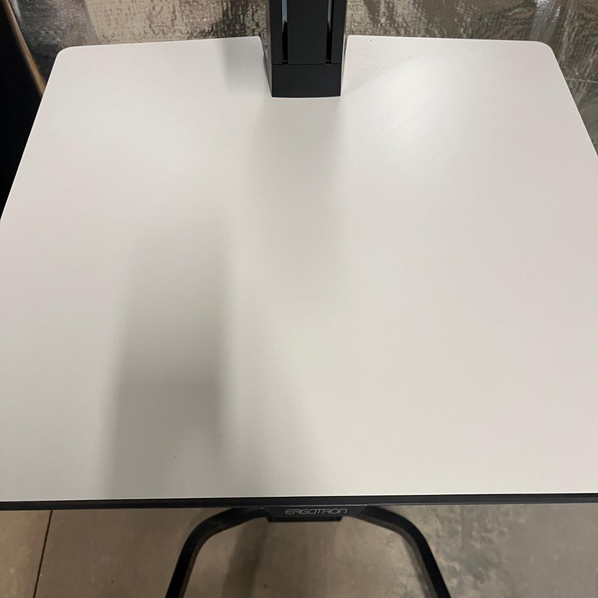 This Ergotron sit-stand workstation has a sliding keyboard tray and is height adjustable. Piece measures 24” x 24” x 58” when fully extended up. Workstation has wheels and is a metal frame with a phenolic resin work surface. The lift mechanism on this desk is not working so once the desk is raised it needs to be lowered with a tool; no tool included, we used a screwdriver.