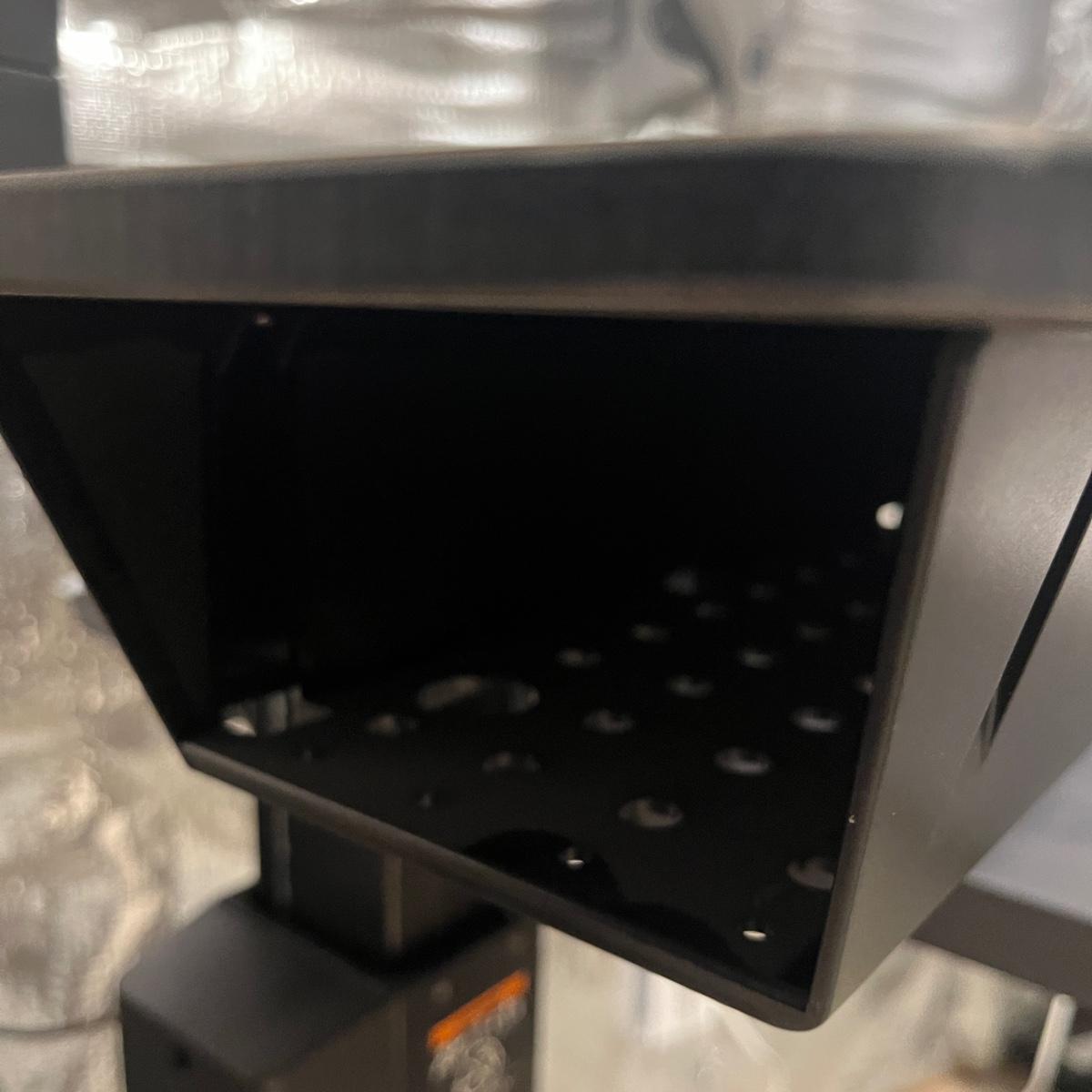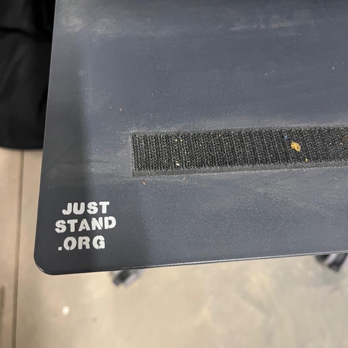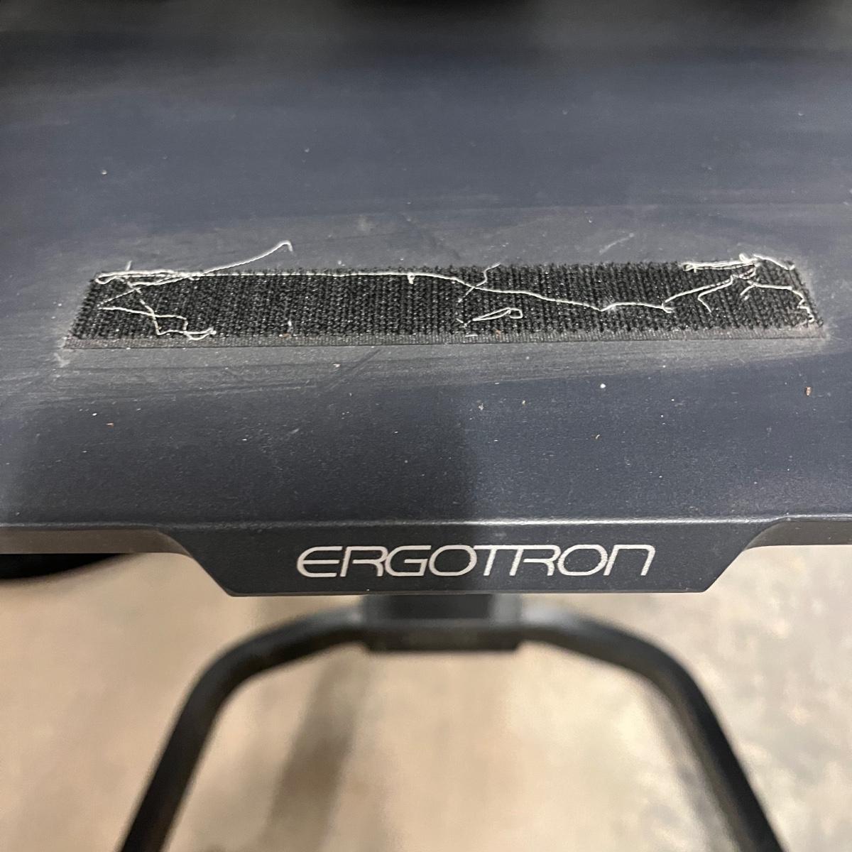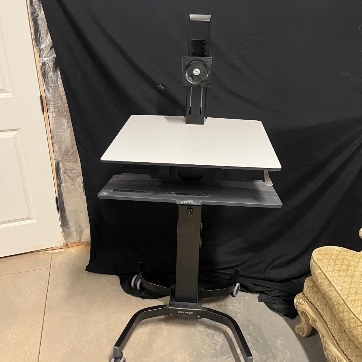 This Ergotron sit-stand workstation has a sliding keyboard tray and is height adjustable. Piece measures 24” x 24” x 58” when fully extended up. Workstation has wheels and is a metal frame with a phenolic resin work surface. The lift mechanism on this desk is not working so once the desk is raised it needs to be lowered with a tool; no tool included, we used a screwdriver.