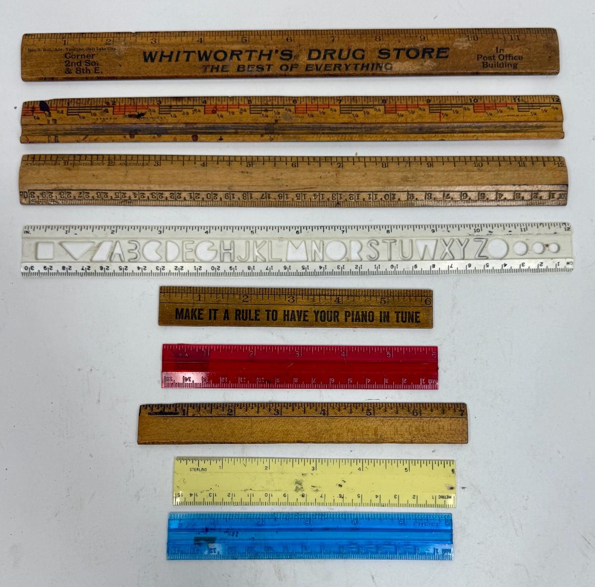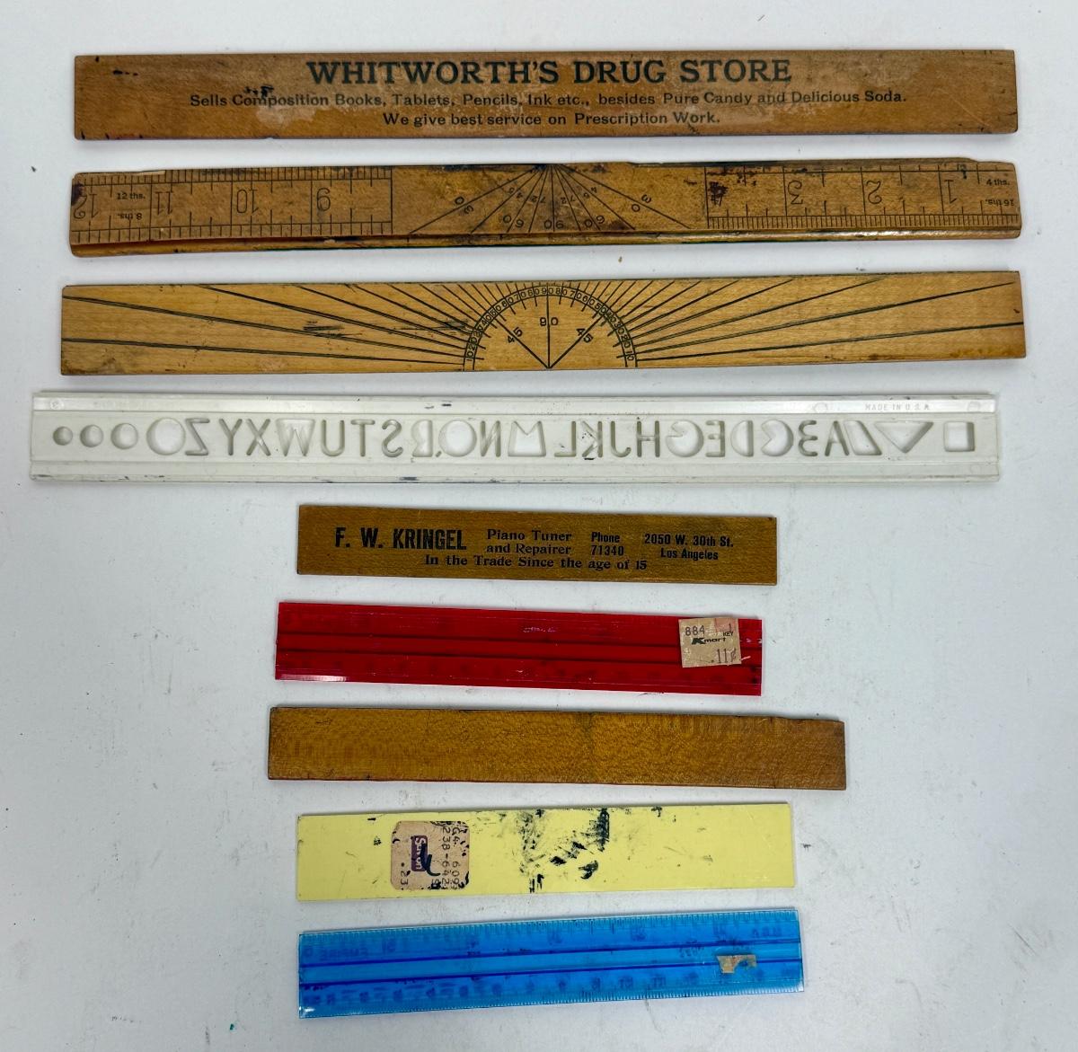 9 pc Lot of Vintage Rulers made from various types of material wood plastic Bakelite