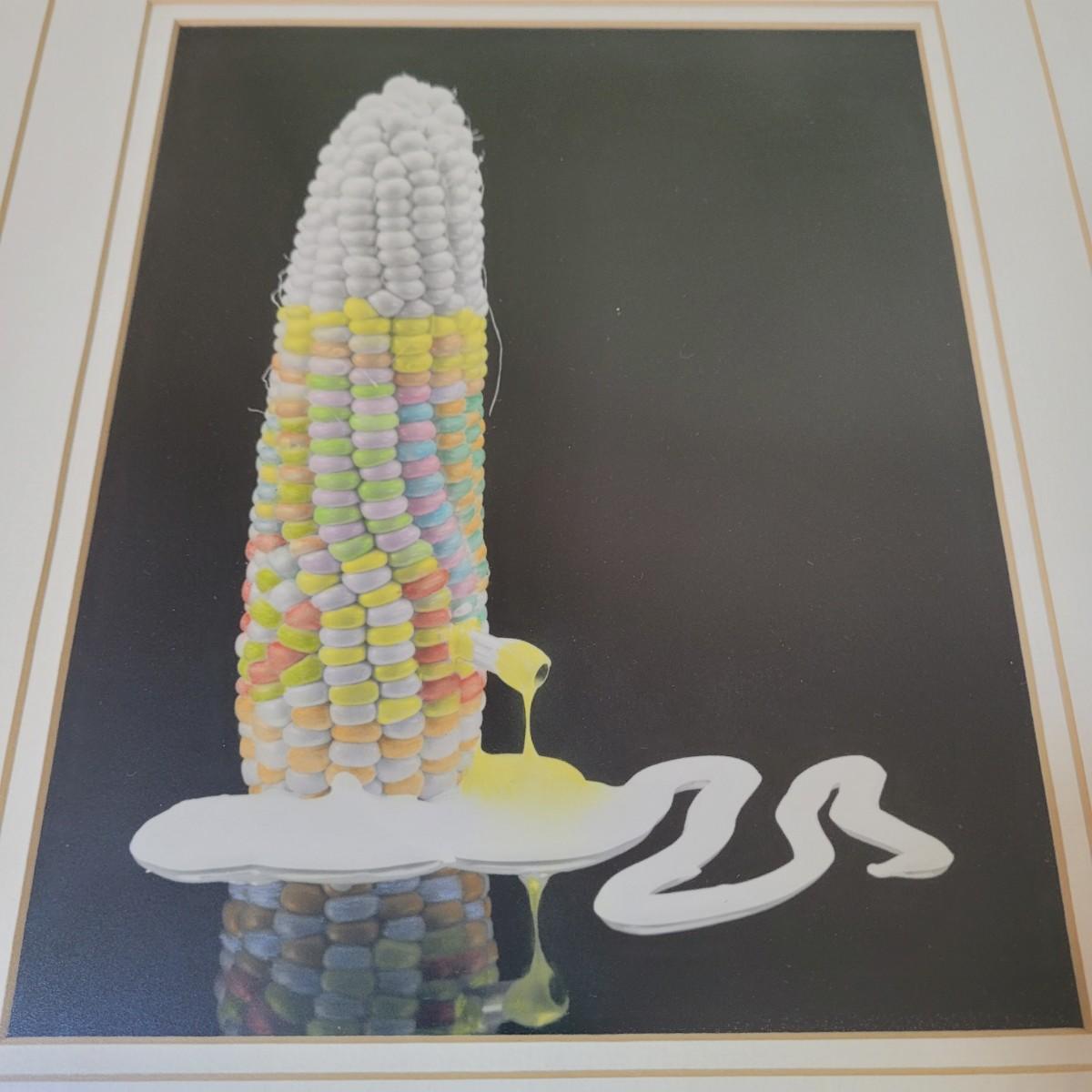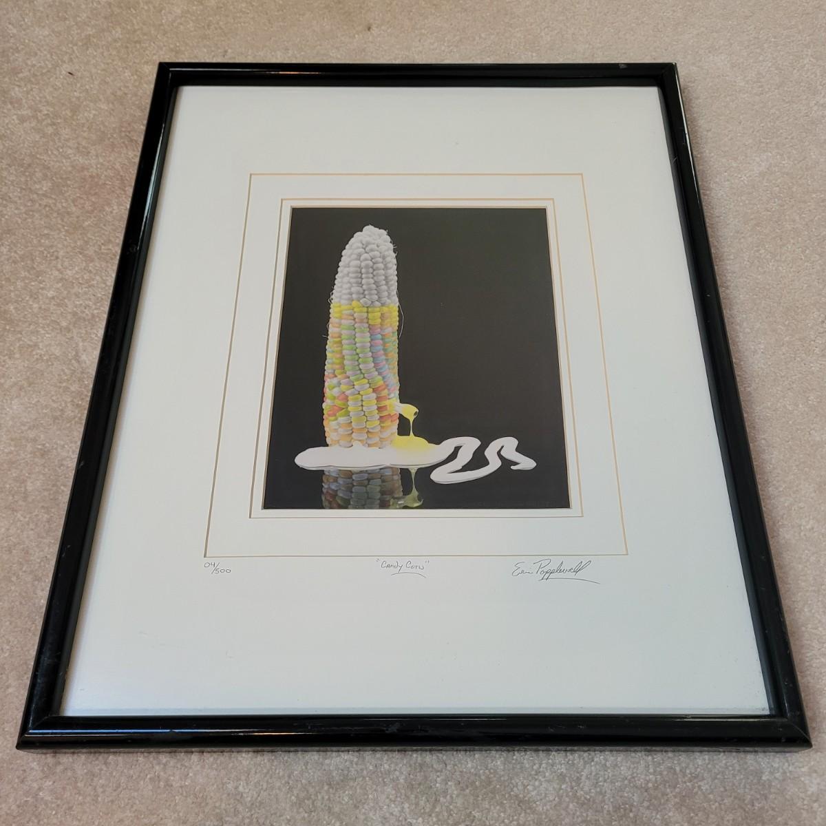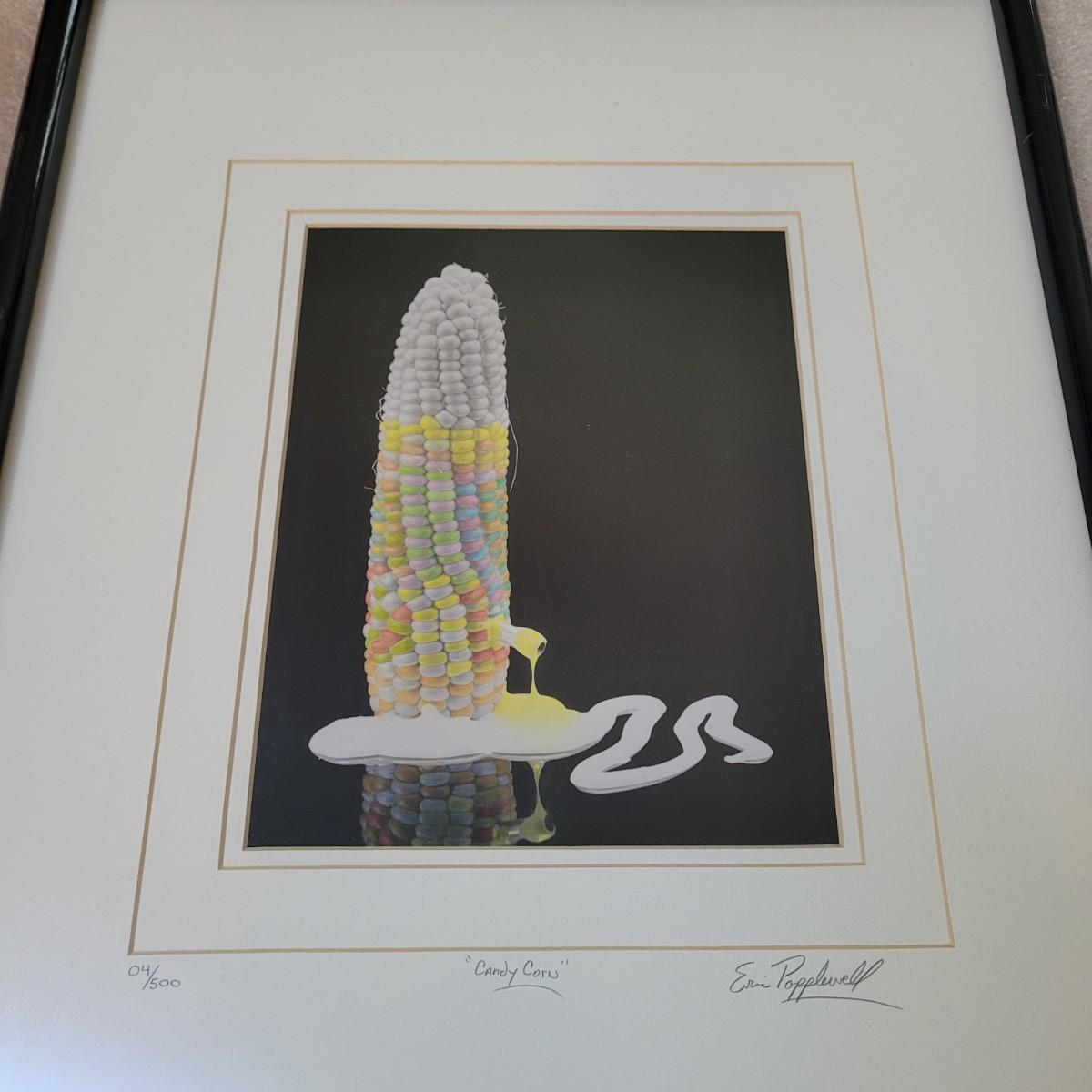 This is an original photograph titled "Candy Corn" by artist Eric Popplewell. This piece depicts a colorful ear of Corn dripping color from a tube at its side. This piece is triple matted, under glass, and in a wooden frame. It is signed, titled, and numbered in pencil. The frame measures 17" x 21"H. Includes an attached metal wire for hanging.