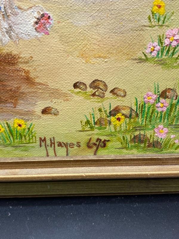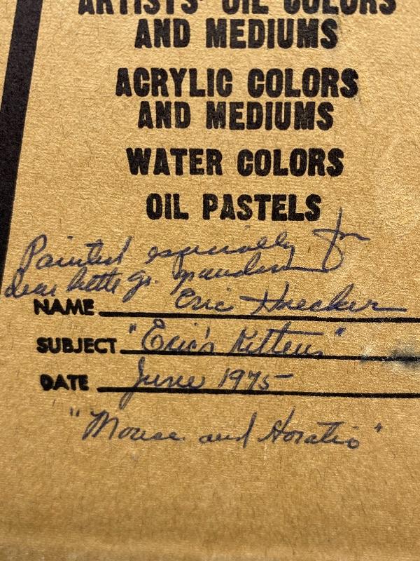 "Eric's Kitten's" framed cat painting by M. Haynes. According to the back it was painted for the painters great grandson in 1975 and repainted in 1977. Measures 12x10.